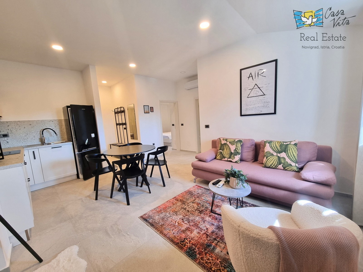 - Istria, Poreč A nicely furnished apartment in a newly built building in a great location is for sale. The apartment is 70 m2 and consists of two bedrooms, two bathrooms, living room, kitchen and dining room with access to a beautiful