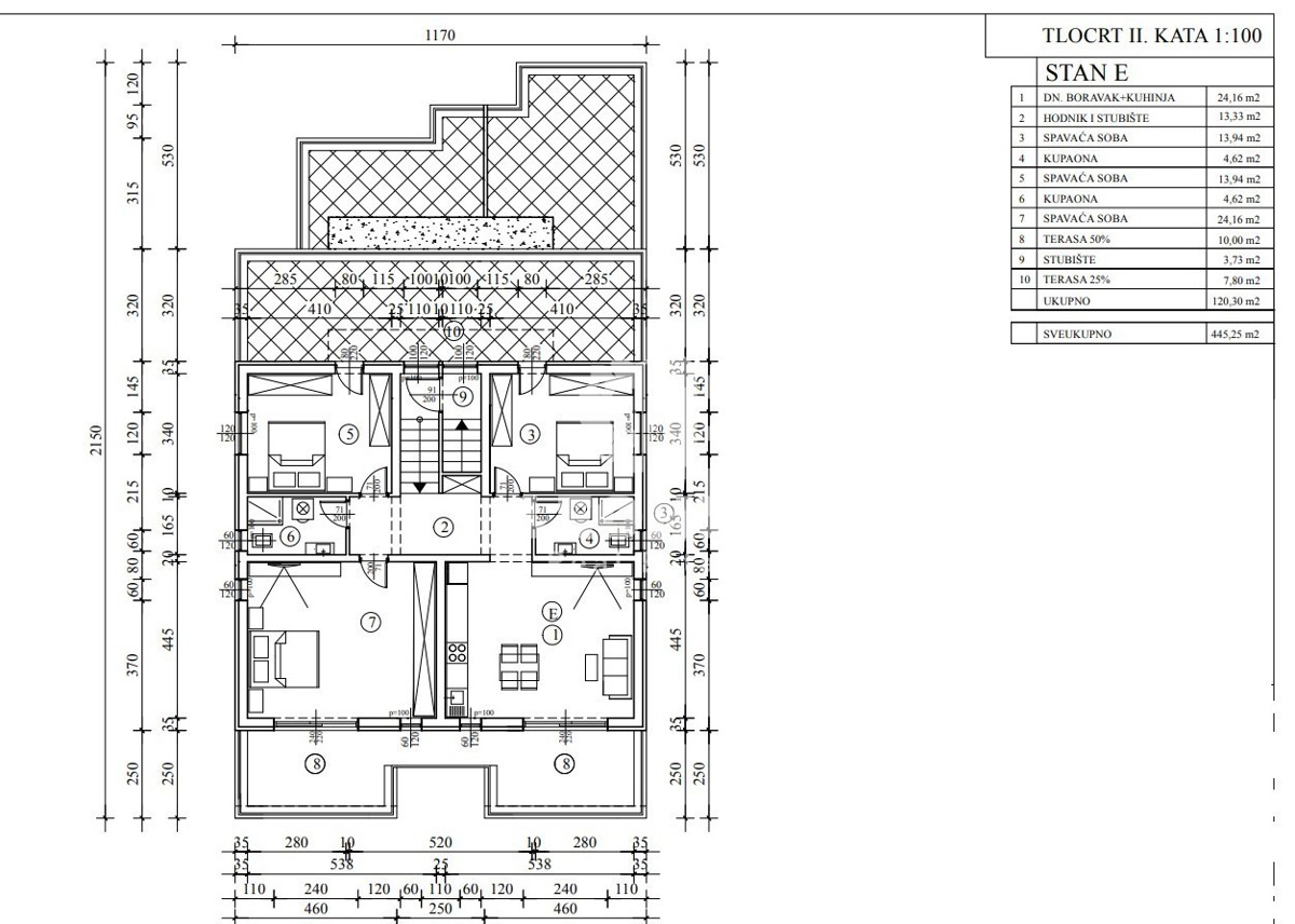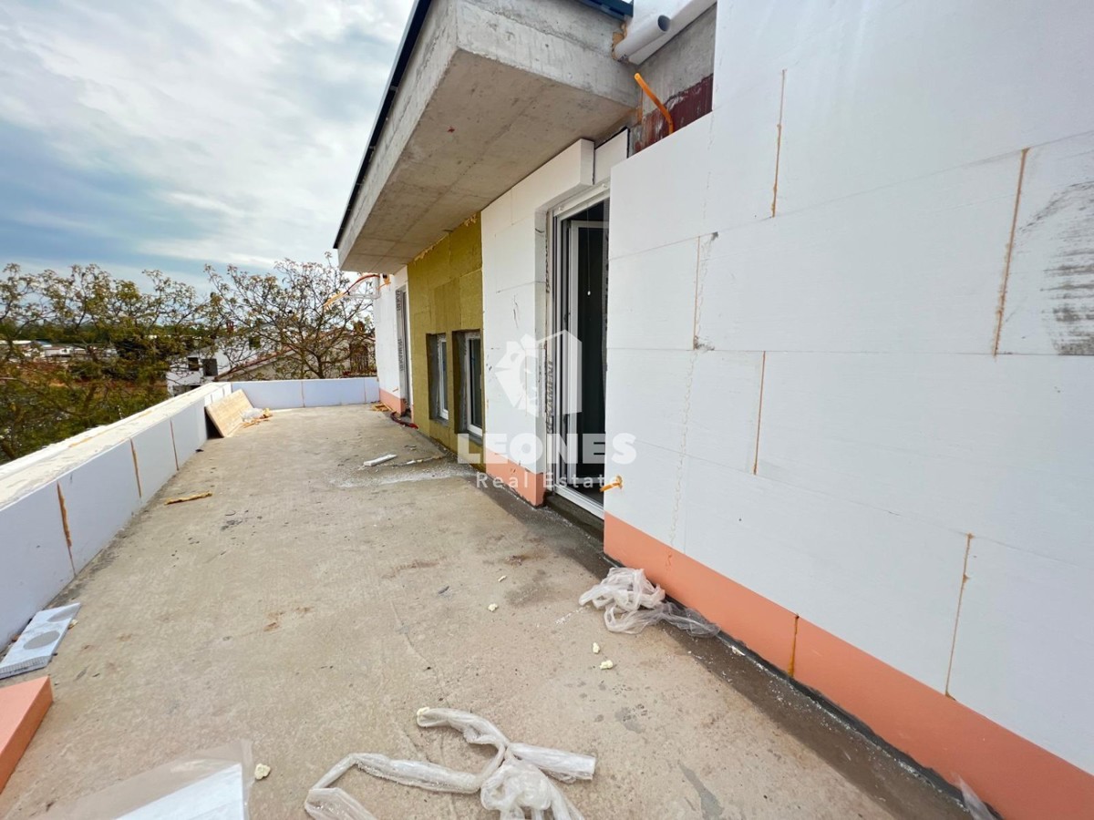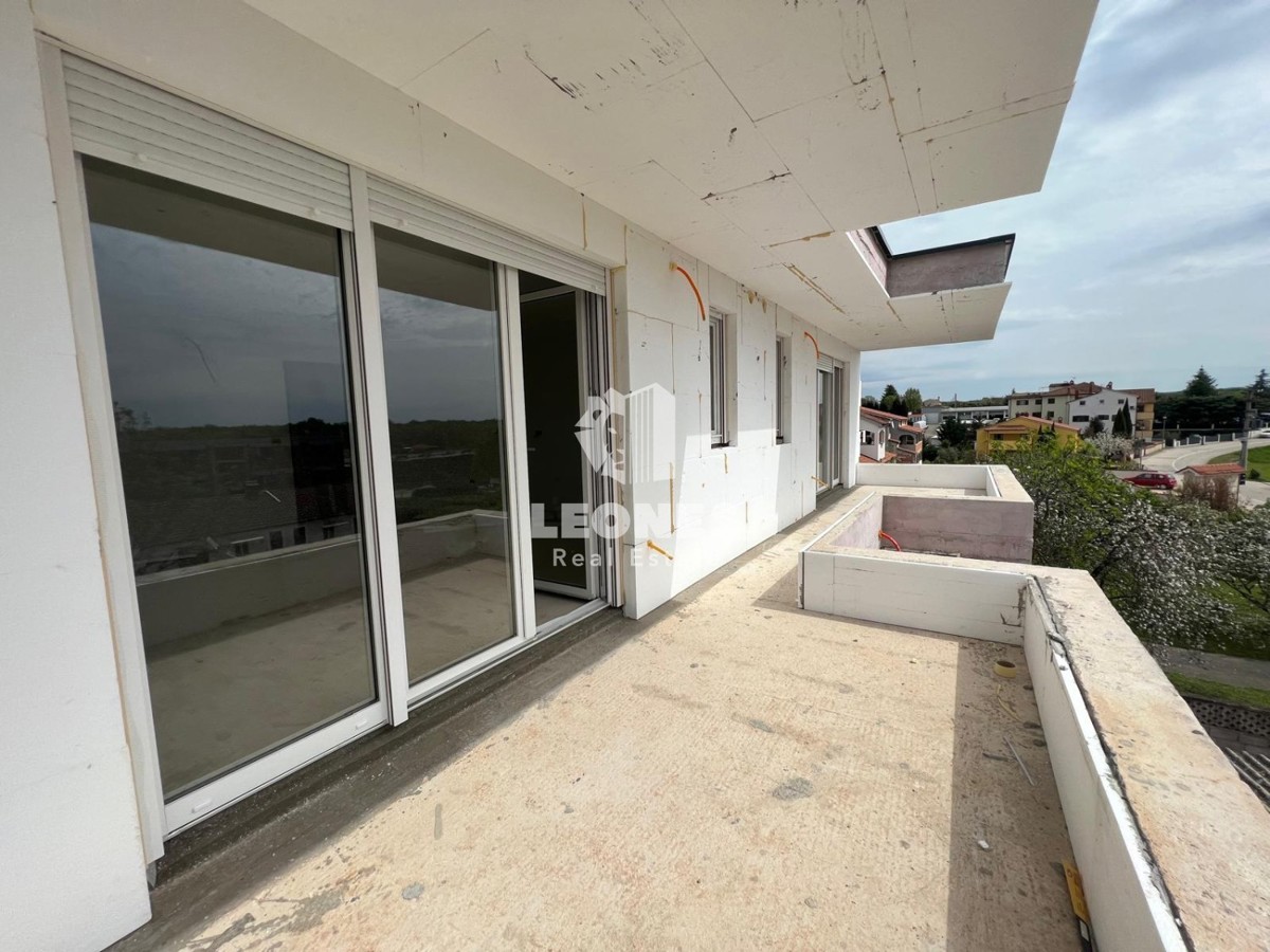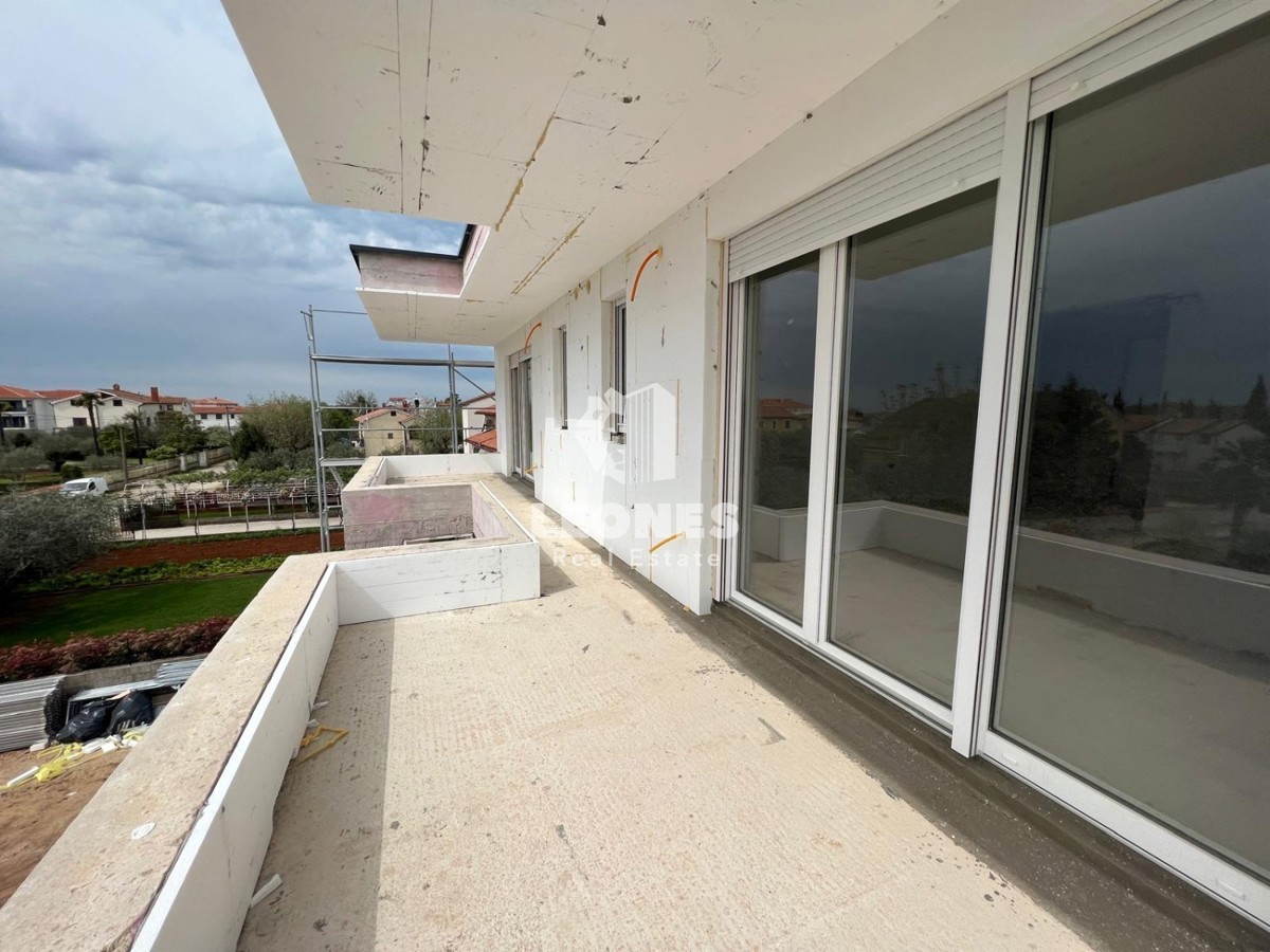 Beautiful, attractive penthouse on the 2nd floor in the vicinity of Poreč Apartment E has 124.59 m2 and consists of an entrance hall, three bedrooms, two bathrooms, living room with kitchen and dining room and two spacious terraces. All floors in the ap