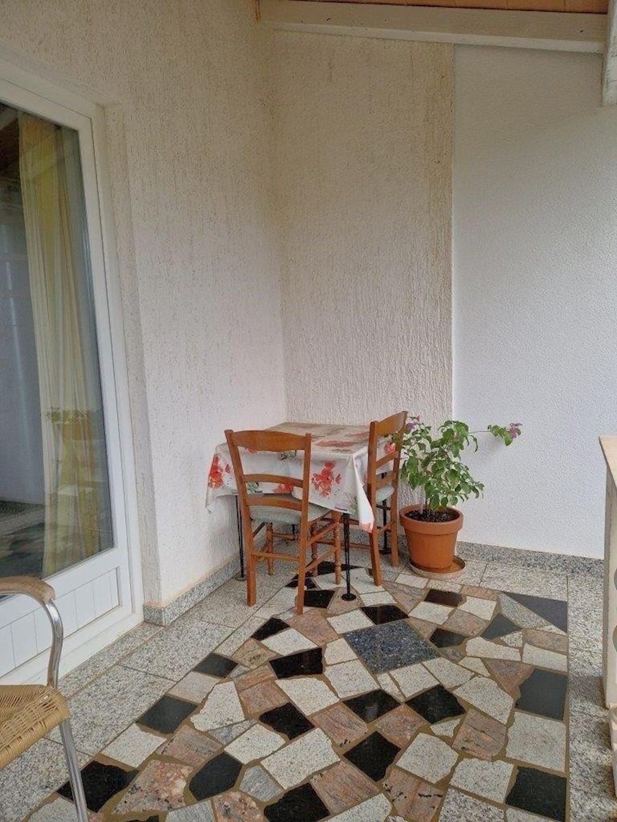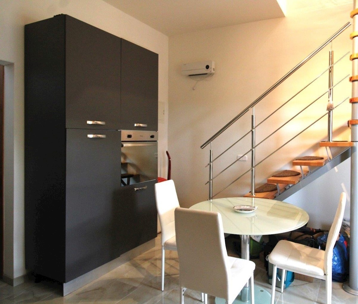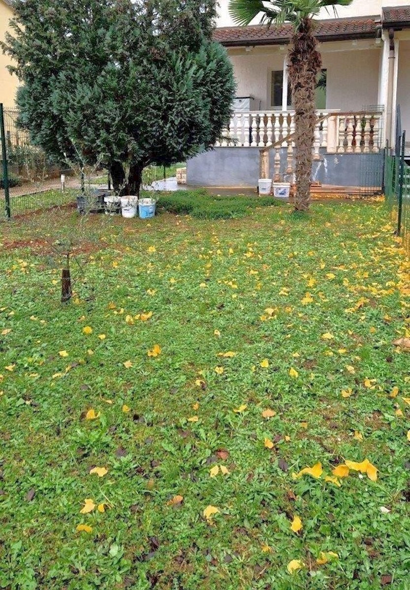 Poreč, approx. 2 km from the sea, two-story apartment of 52 m2 and a garden of 85 m2 - the ground floor consists of an entrance hall, bathroom, kitchen with dining room and living room with access to a covered terrace and yard, where there is a water conn