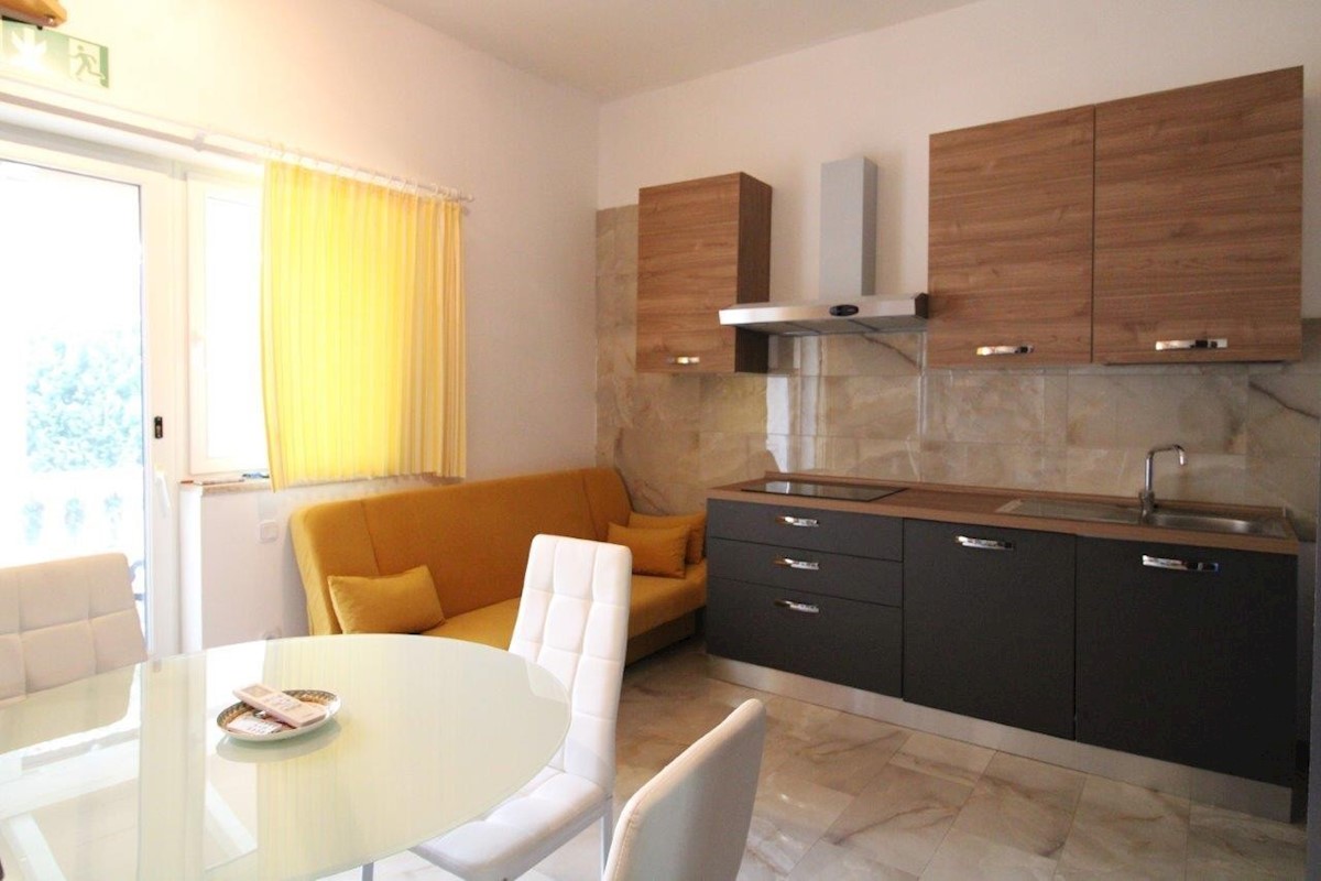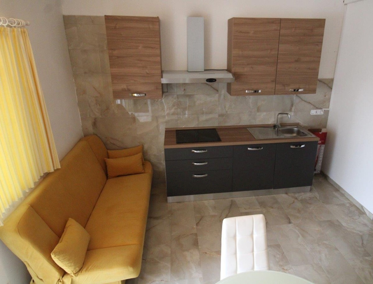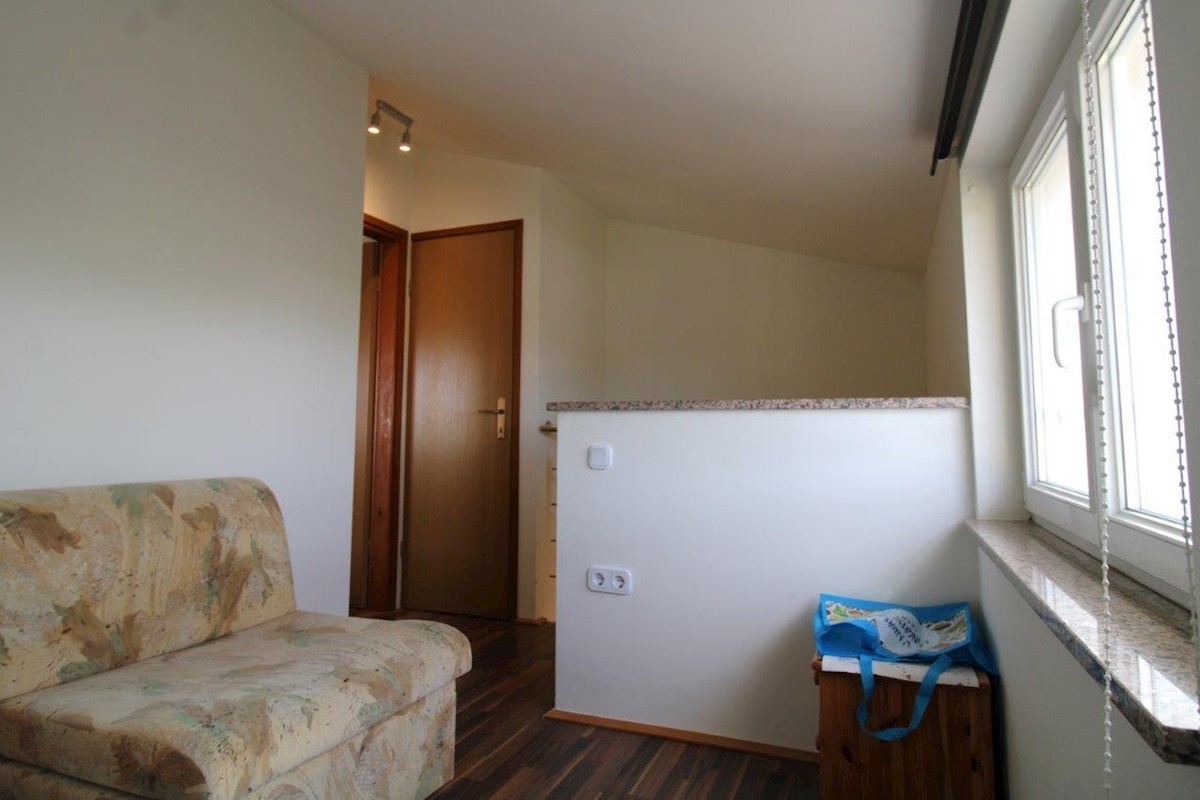 Poreč, approx. 2 km from the sea, two-story apartment of 52 m2 and a garden of 85 m2 - the ground floor consists of an entrance hall, bathroom, kitchen with dining room and living room with access to a covered terrace and yard, where there is a water conn