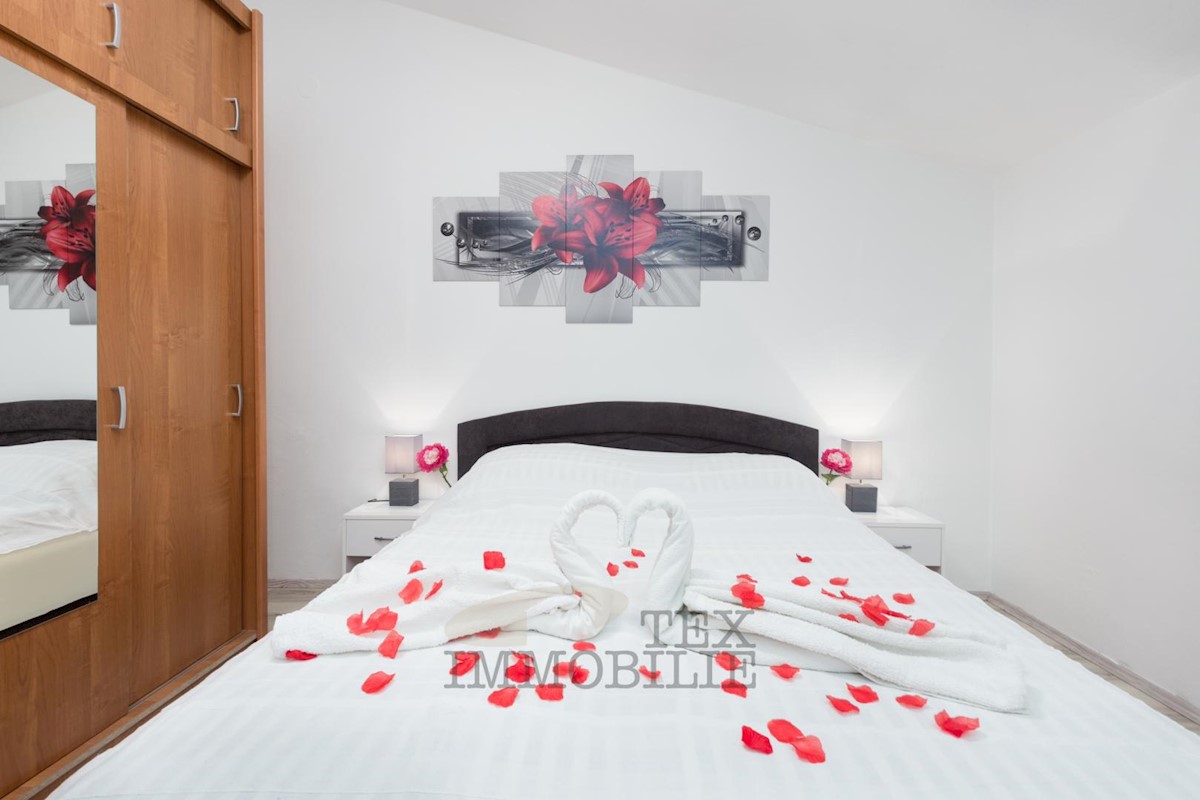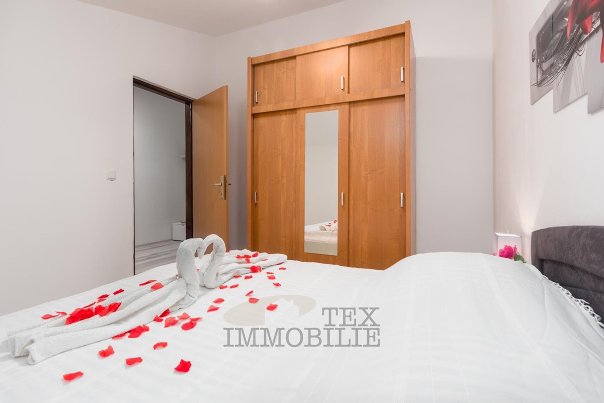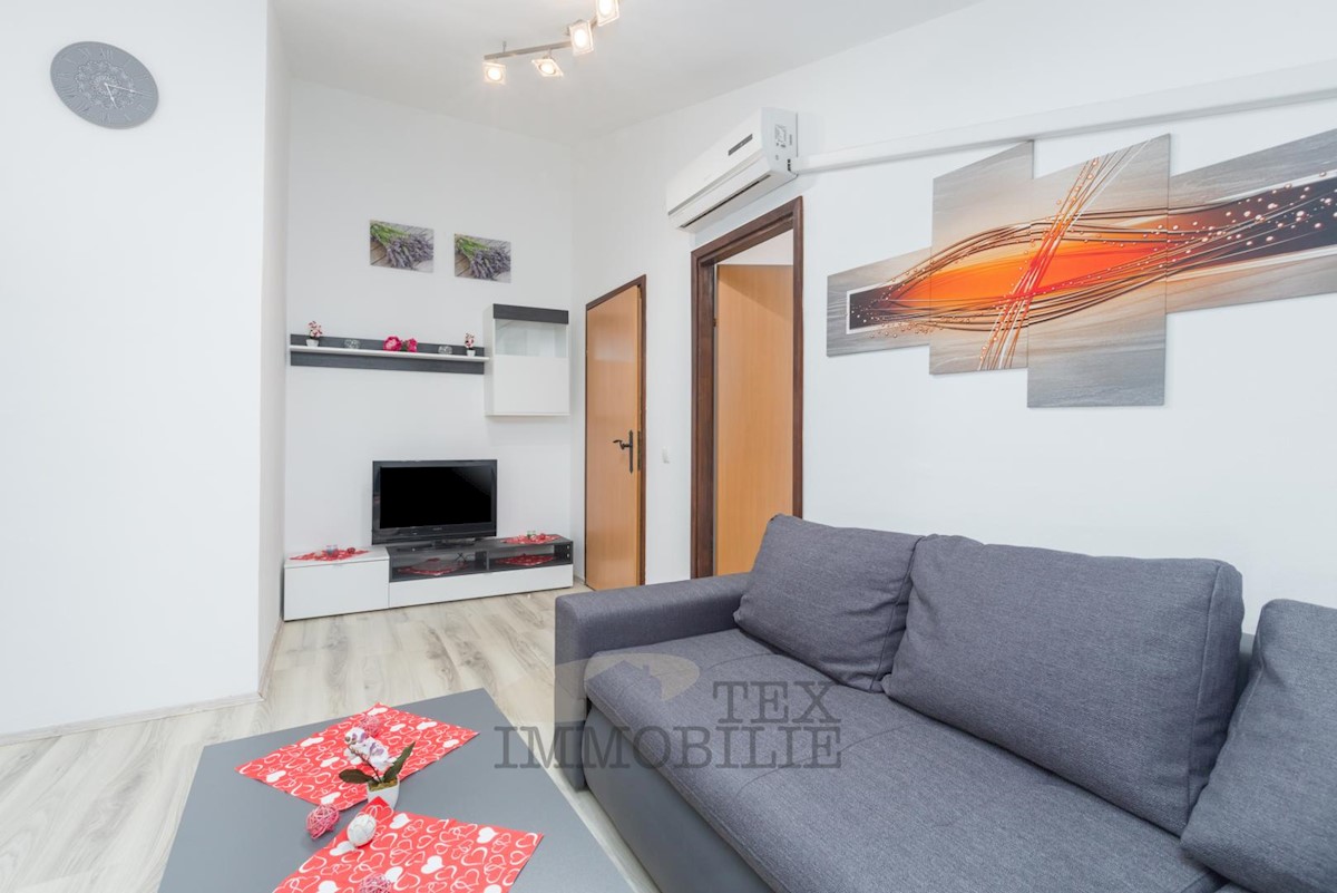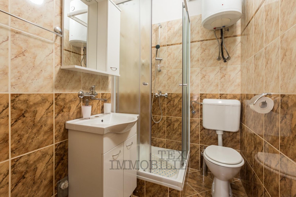 For sale is an apartment on the 2nd floor of a house in Žbandaj near Poreč. The apartment is divided into two residential units with separate entrances. Each unit has a living room with a kitchen, one bathroom, and one bedroom. The apartment includes two