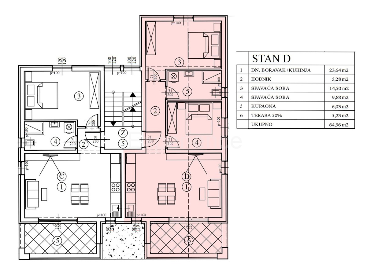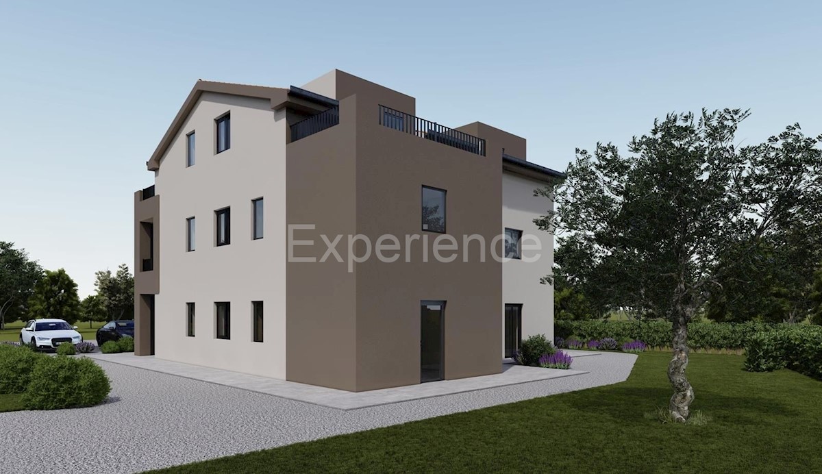 Nearby Poreč - cca. 9 km from the sea and the city, in a quiet environment there is an apartment in construction, surface of 64,56 m². The apartment is situated on the first floor of an intimate residential building with only 5 residential units. Contains