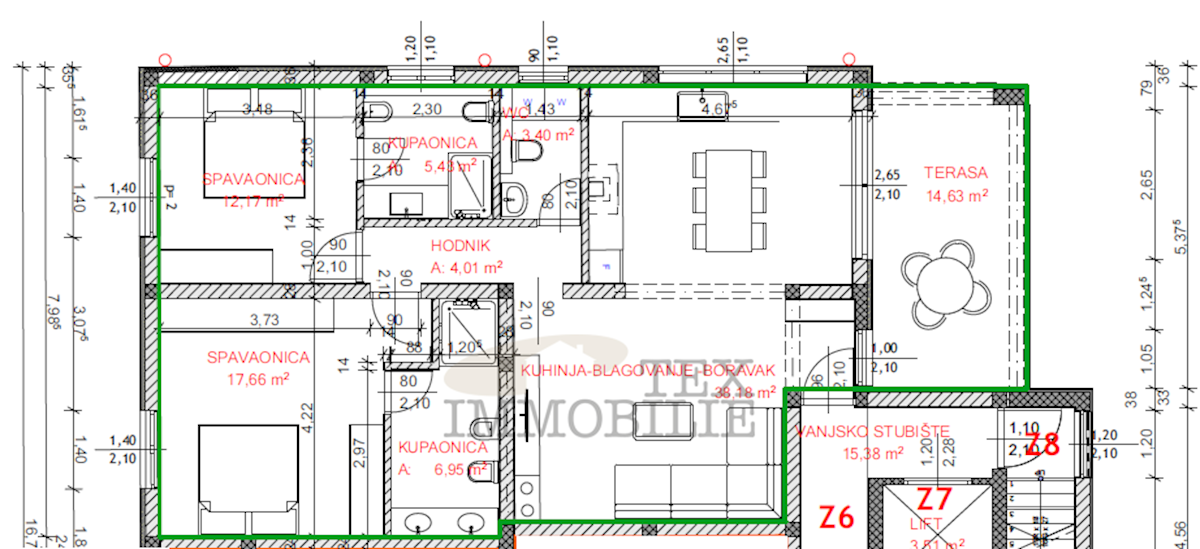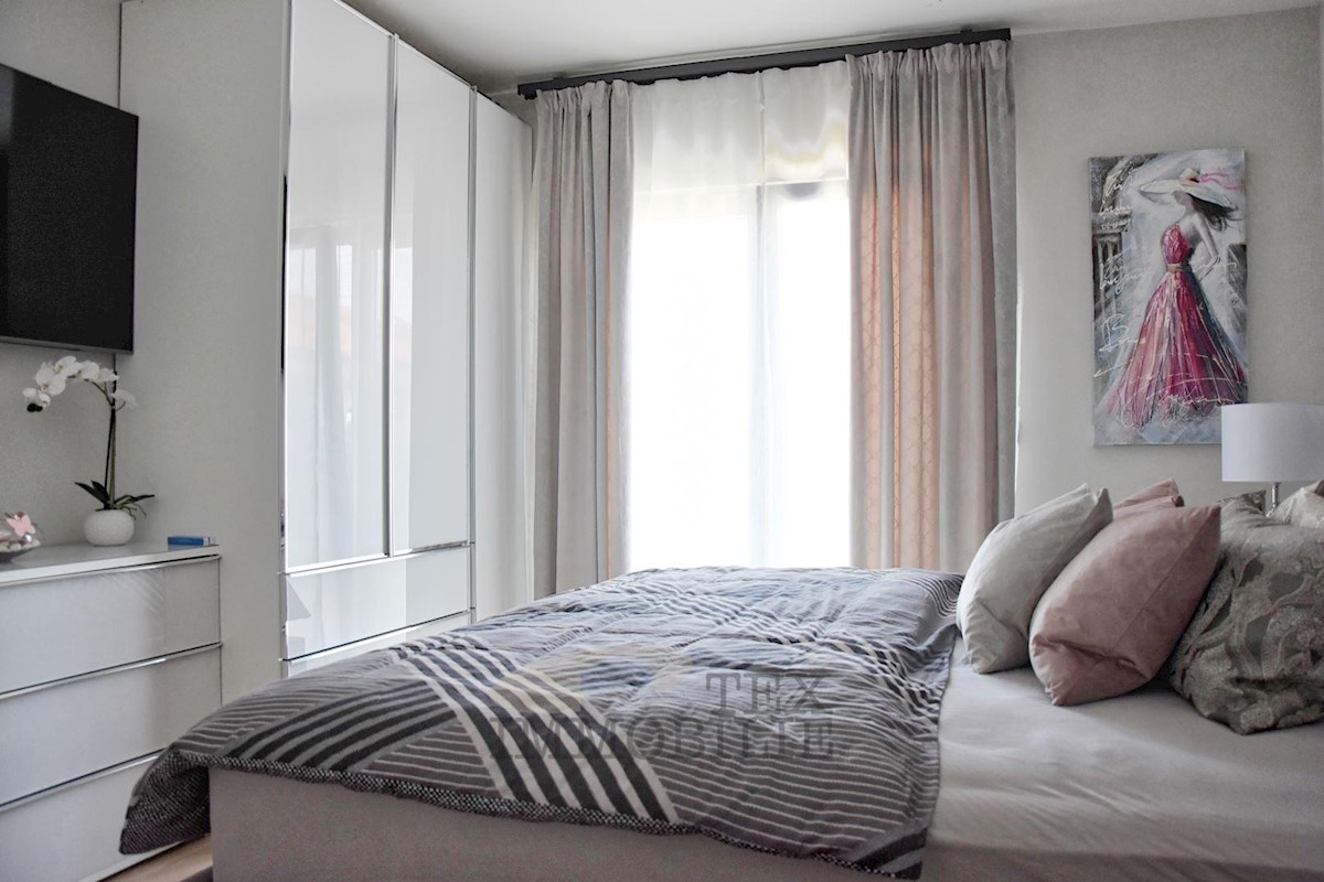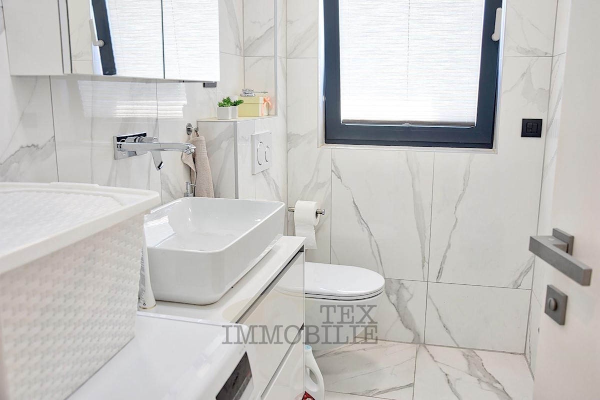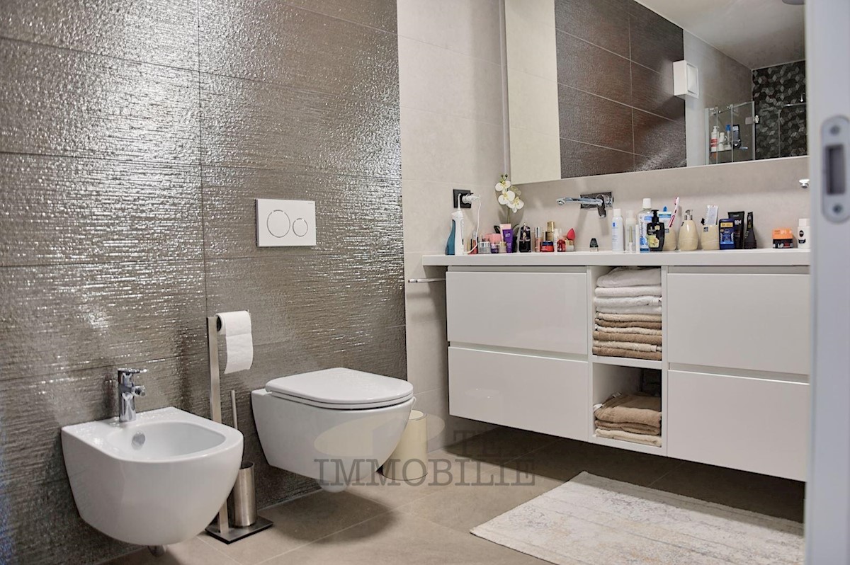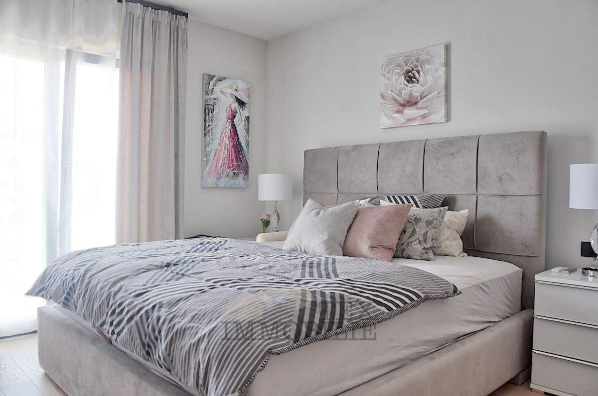 A luxurious apartment is for sale, just a 10-minute walk from the strict center of Poreč and only 600 meters from the nearest beaches. The apartment consists of a spacious living room, kitchen, and dining area with access to a 14 m² terrace, two bedrooms