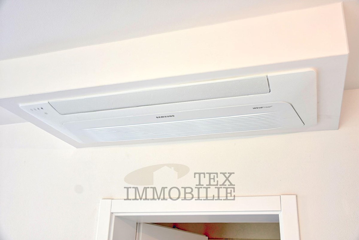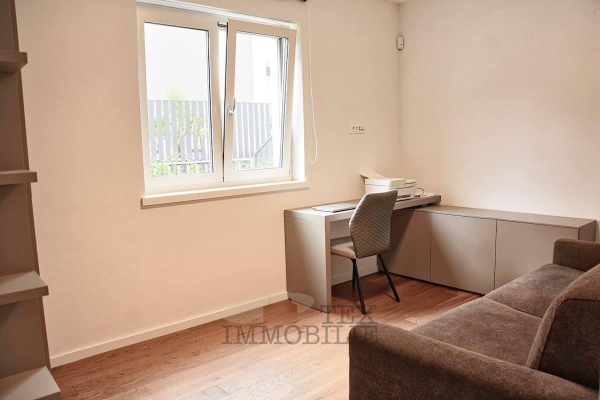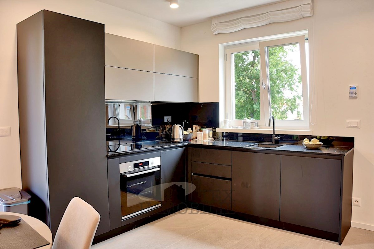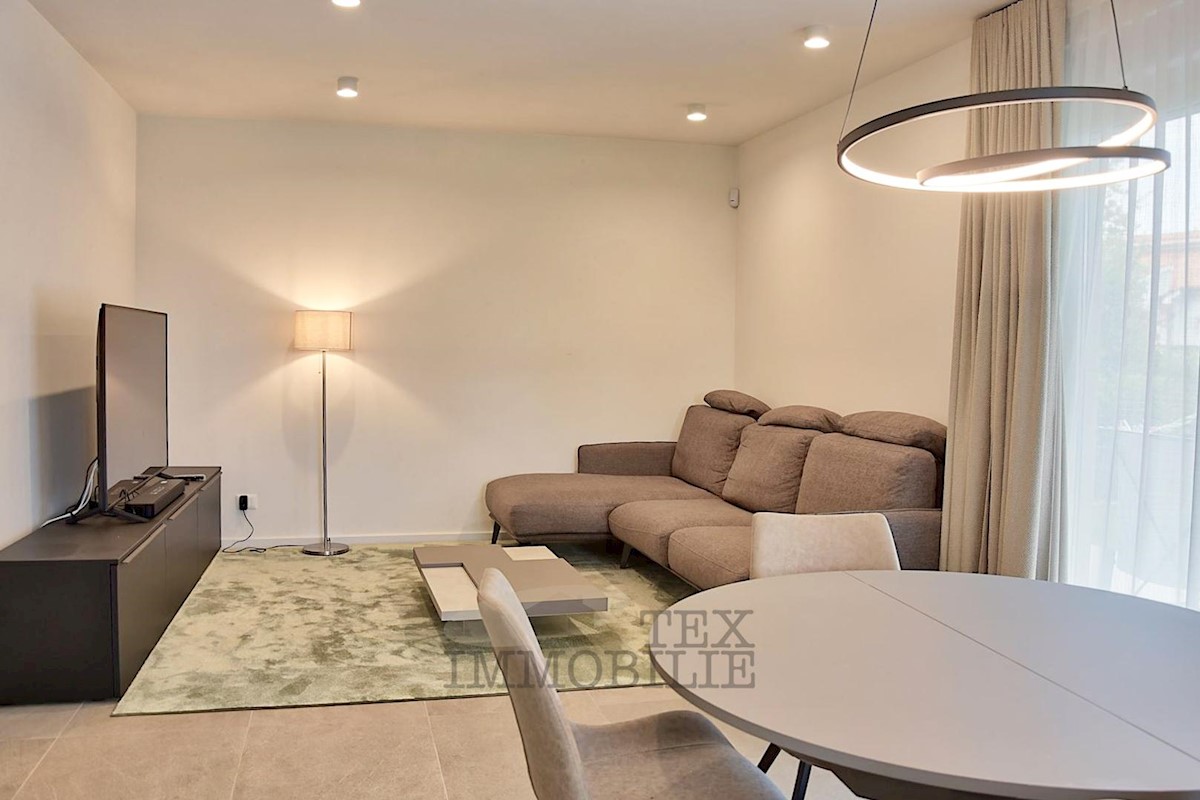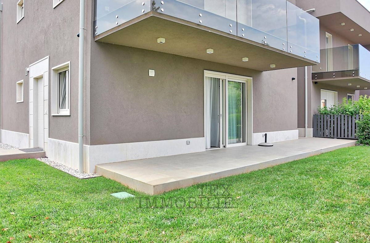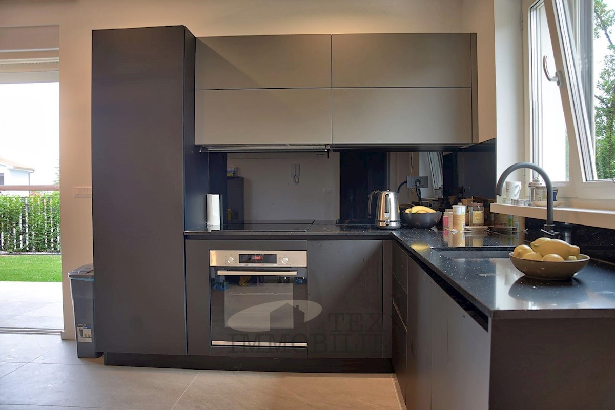 Located 1.5 km from the beaches and 2.7 km from the old town center of Poreč, this elegant apartment offers a comfortable living space. Situated on the ground floor of a building, it has its own entrance and a beautiful garden of 176 m². The apartment f