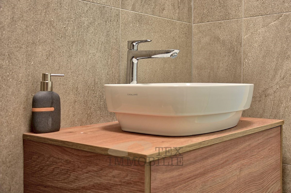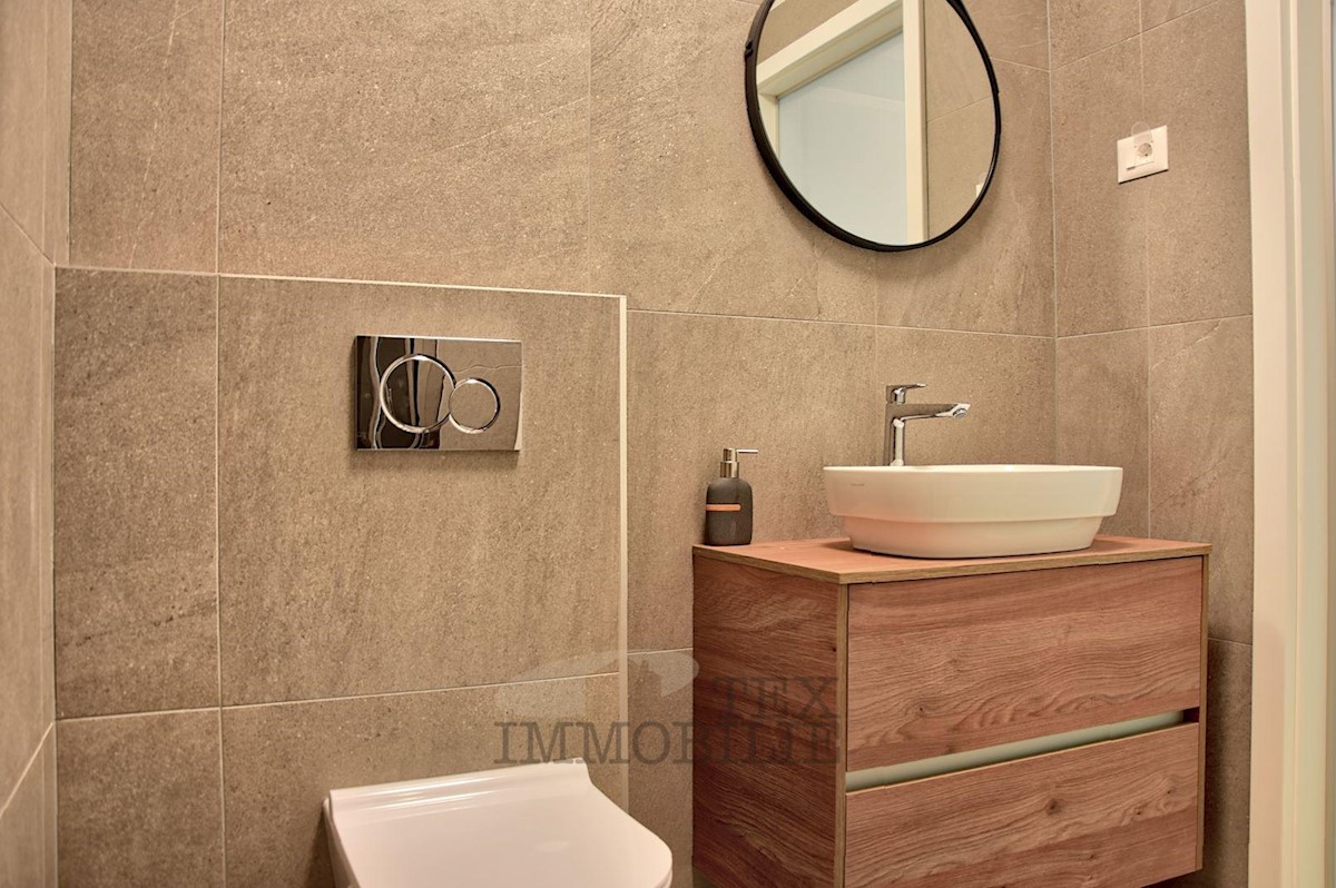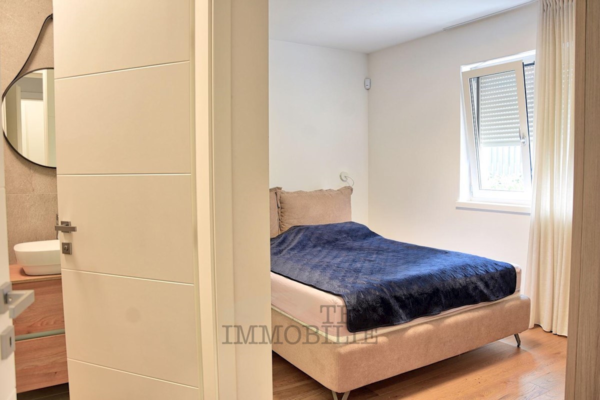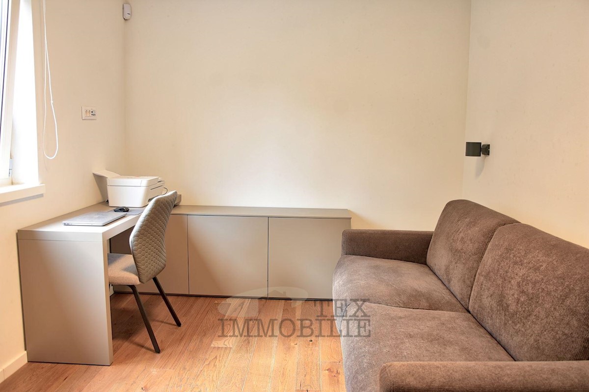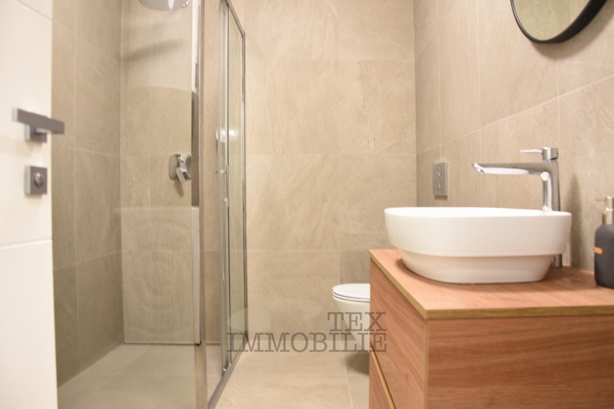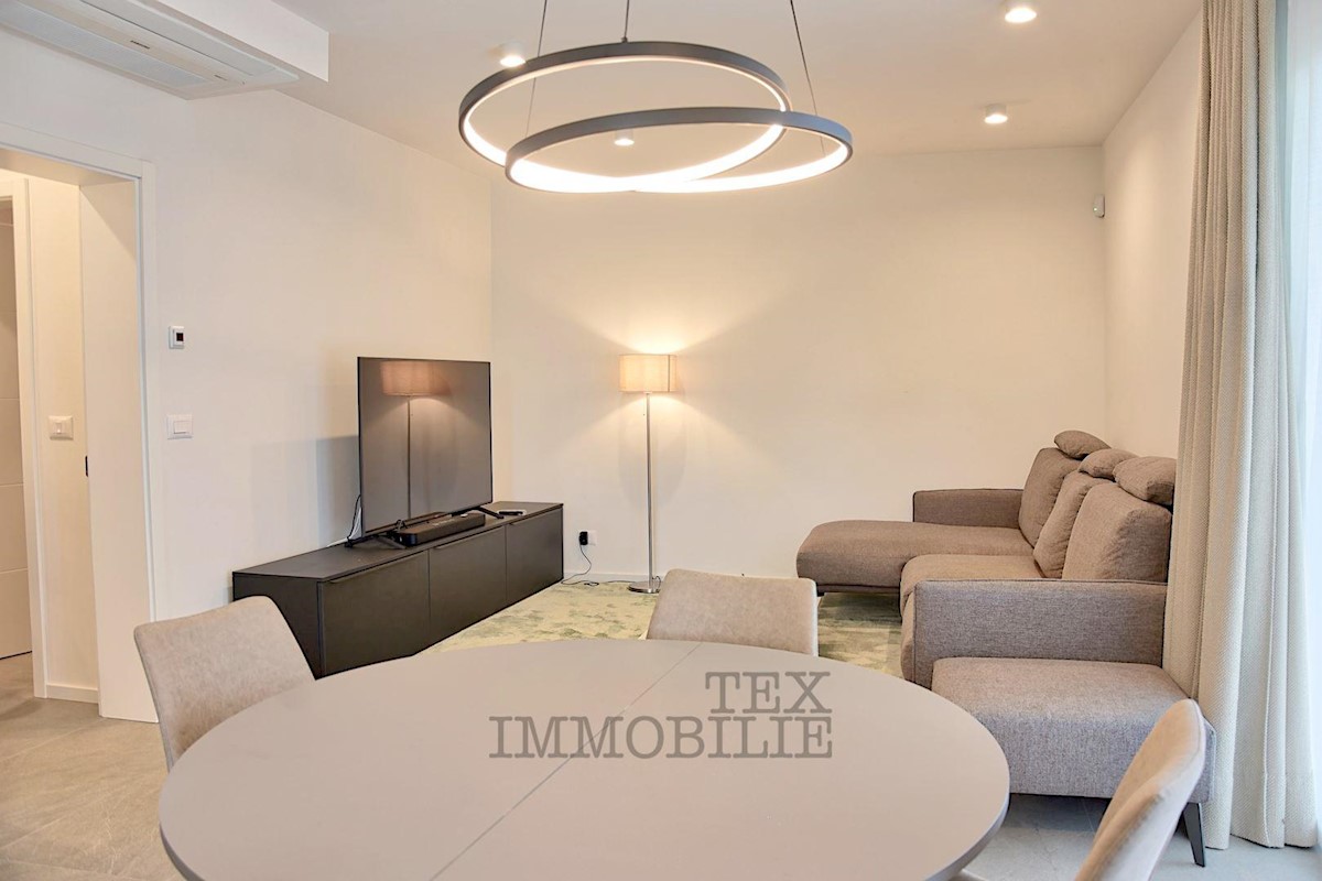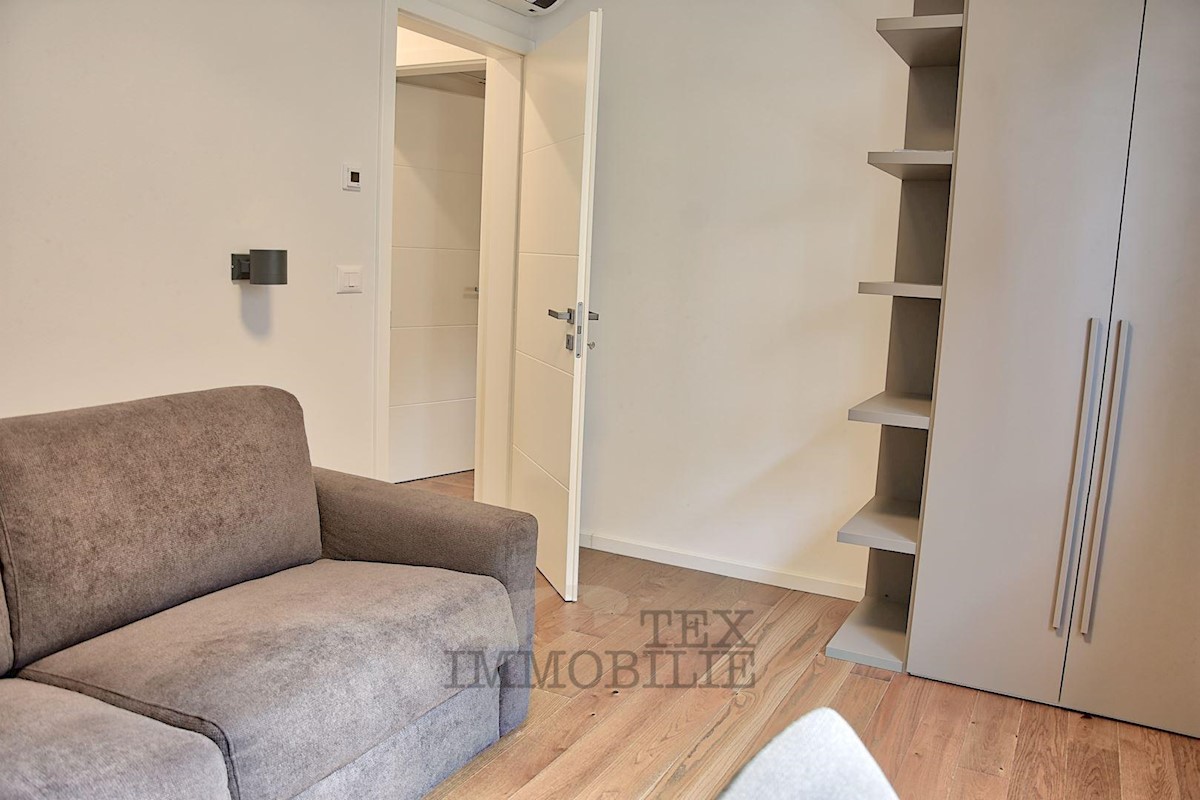 Located 1.5 km from the beaches and 2.7 km from the old town center of Poreč, this elegant apartment offers a comfortable living space. Situated on the ground floor of a building, it has its own entrance and a beautiful garden of 176 m². The apartment f