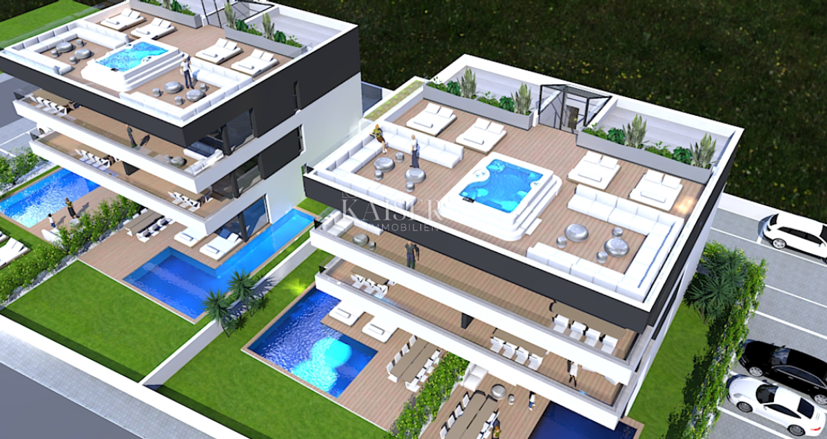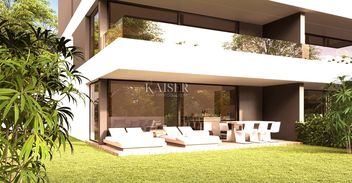 Kaiser Immobilien presents a luxurious apartment on the ground floor of the building, in a completely new apartment complex with two buildings, a few minutes' drive from the city of Poreč. The apartments are located in a quiet and popular location, near a