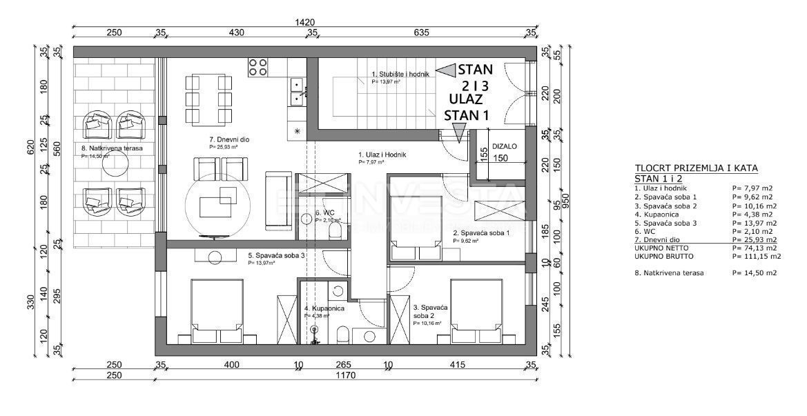 Just a few kilometers from the center of Poreč and 900 m from the sea, an apartment is for sale in a new building located on the first floor, with a total area of 111.15 m². The apartment consists of a living room with access to a covered terrace offerin