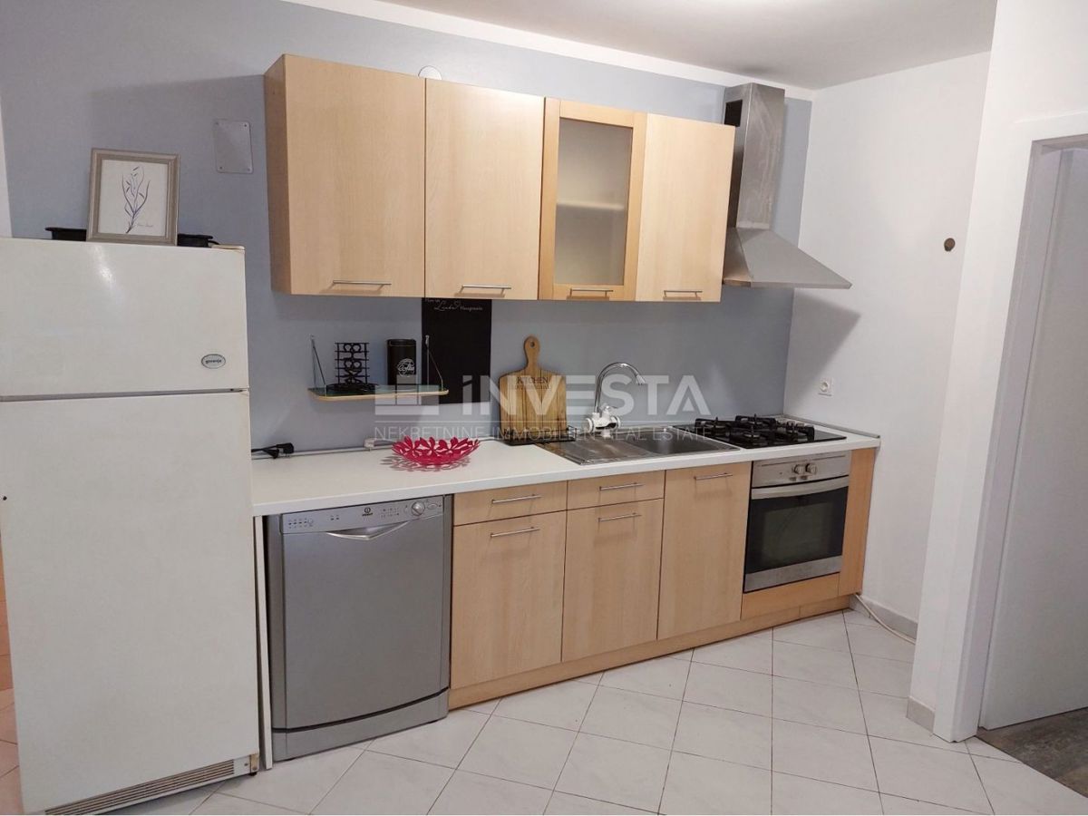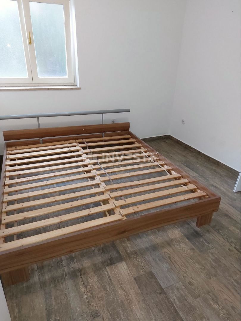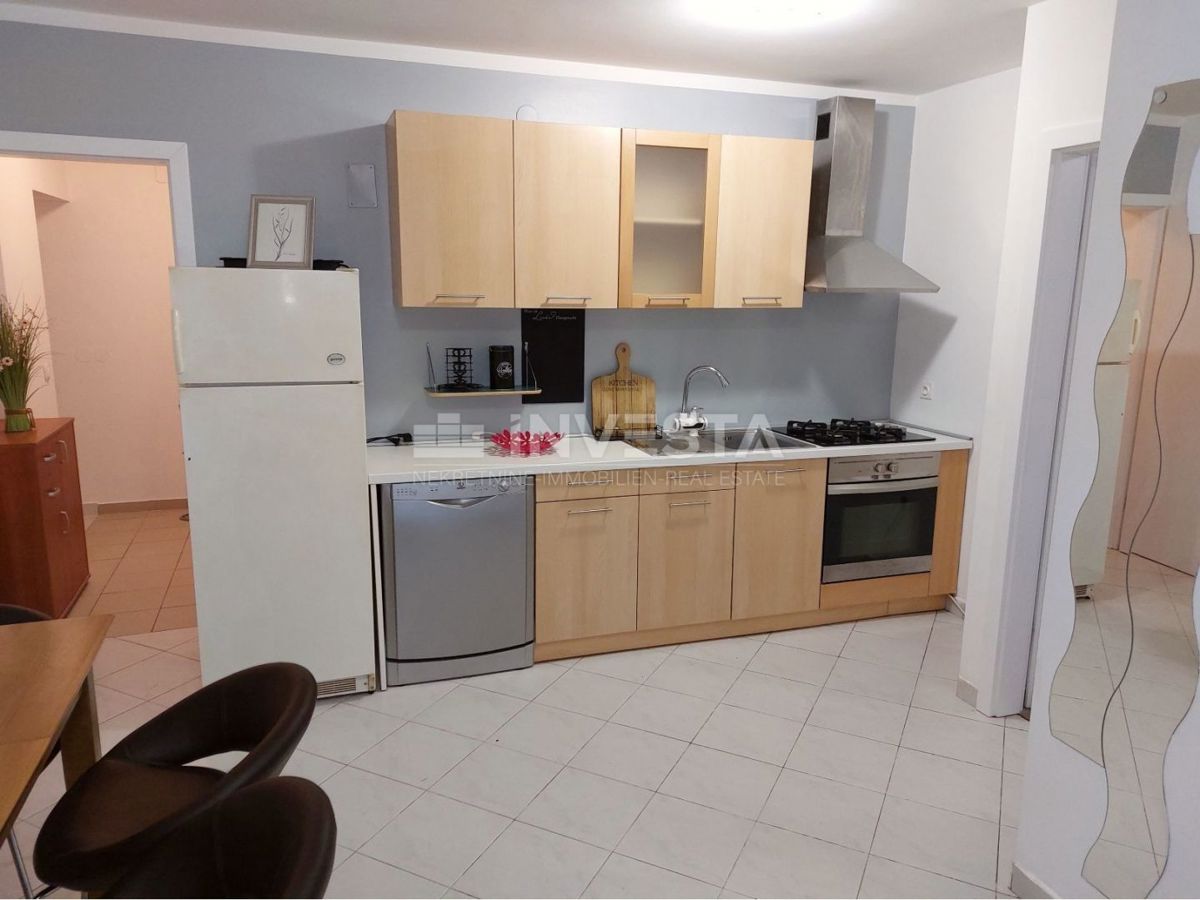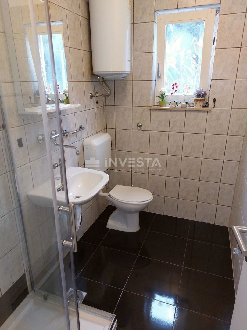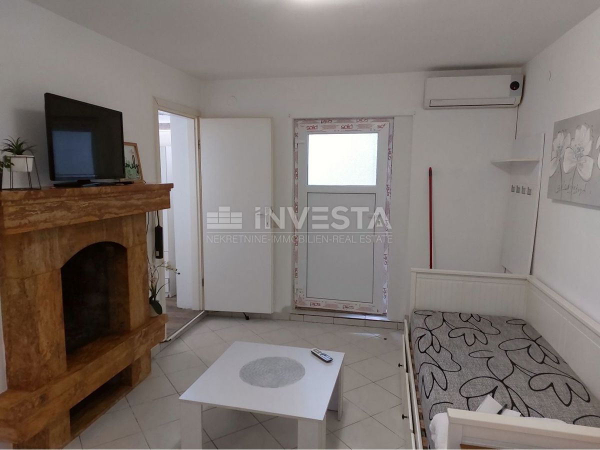 For sale: an apartment located 2 km from the center of Poreč and 900 meters from the beach. It is situated in the basement of a small residential building and consists of two bedrooms, a bathroom, a living room with a dining area, and a kitchen. The apart