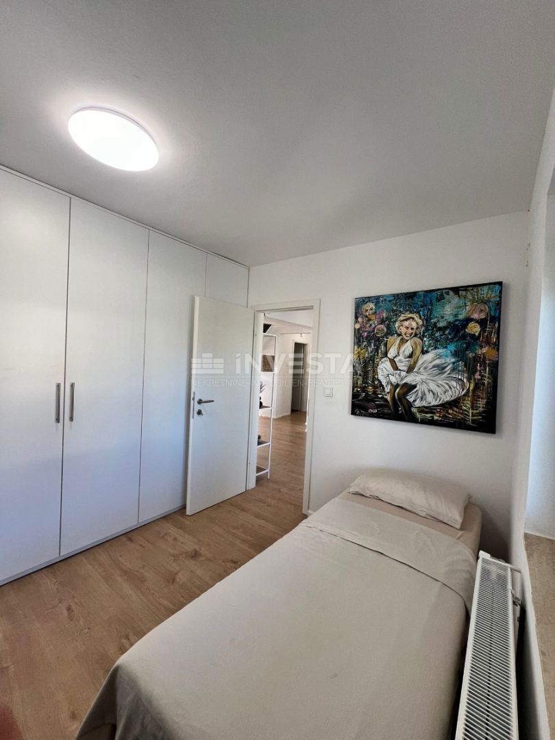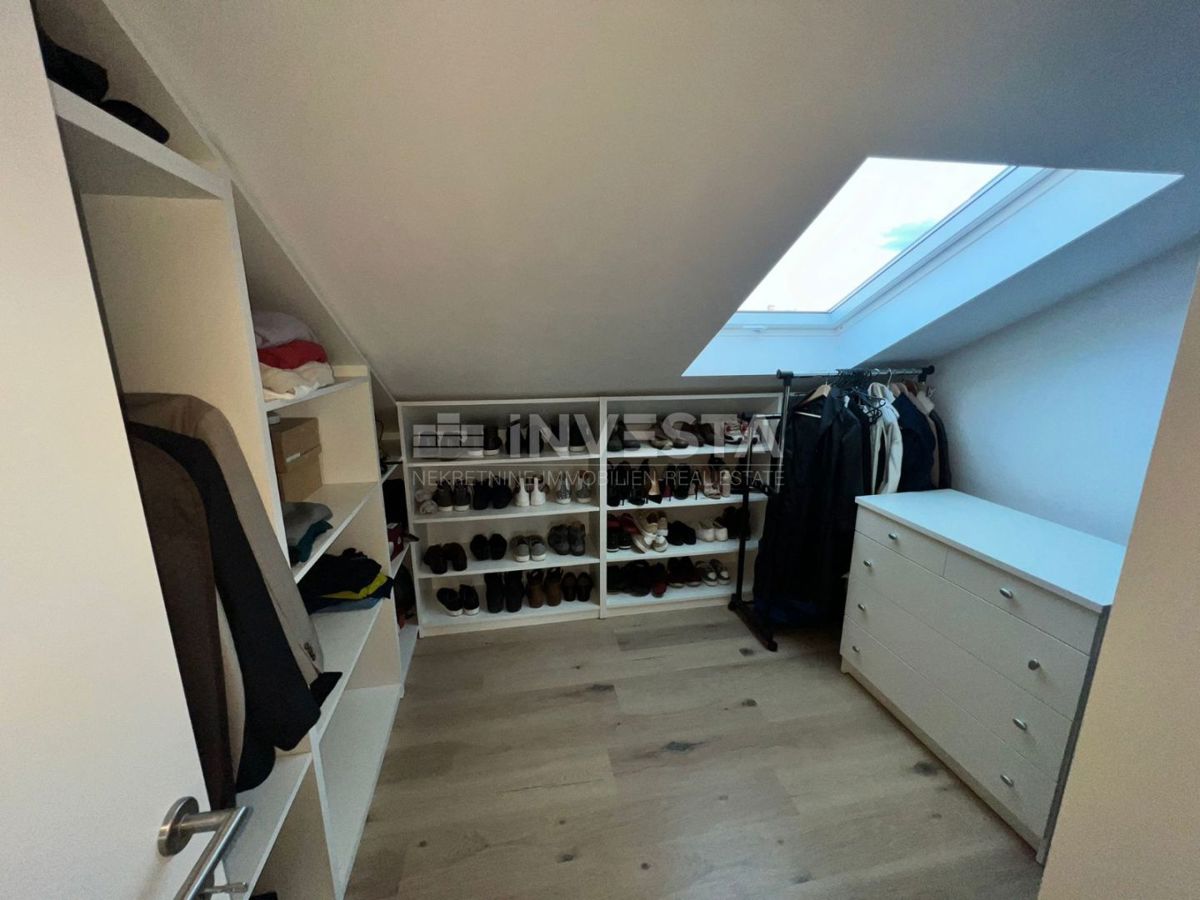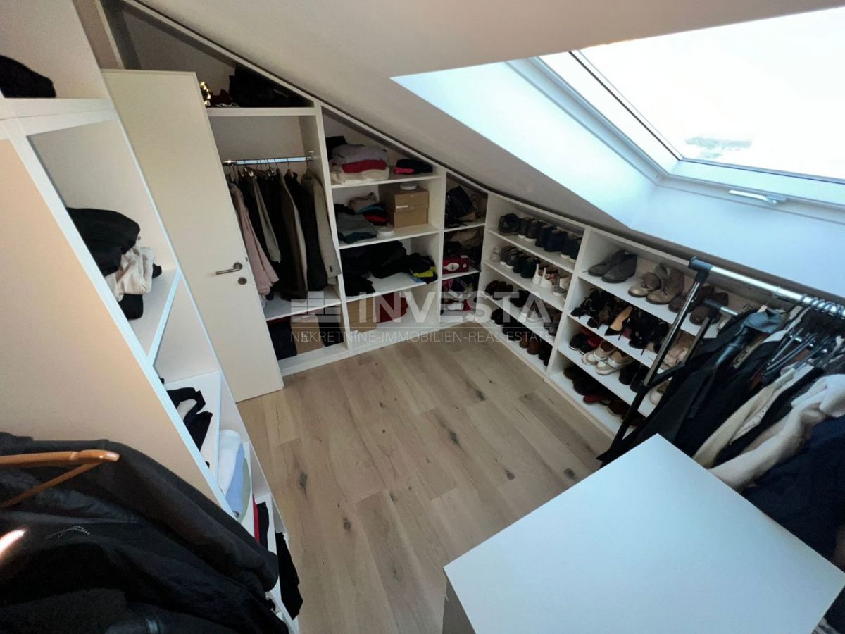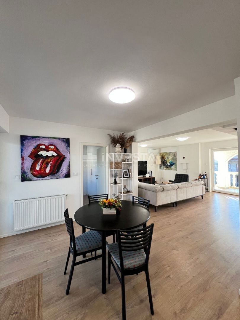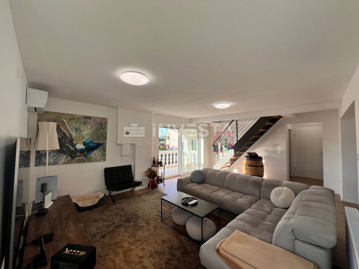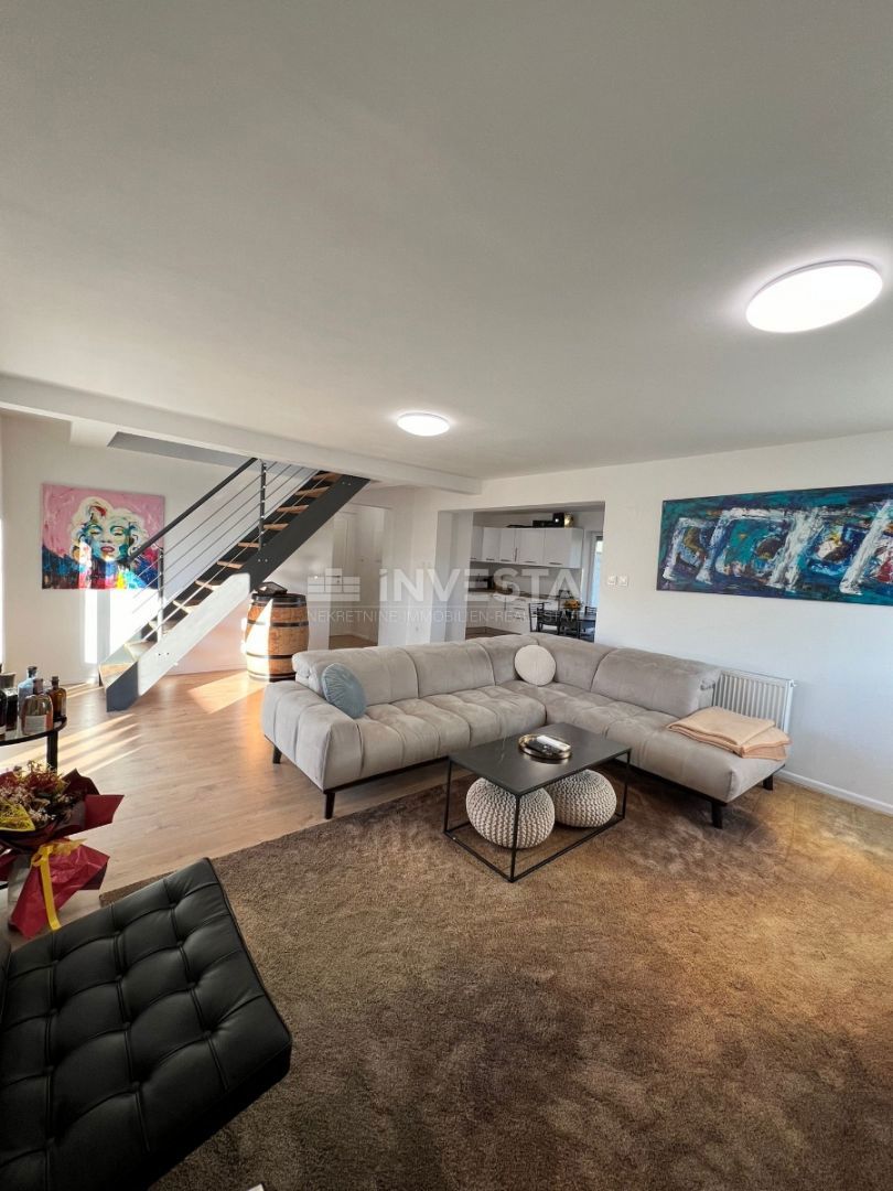 Not far from the center of Poreč, a luxurious apartment of 125.33 m² is for sale. The apartment spans two levels: the first and second floors. On the first floor, there is an entrance hallway, a bathroom, one bedroom, a kitchen, and a dining area, as wel