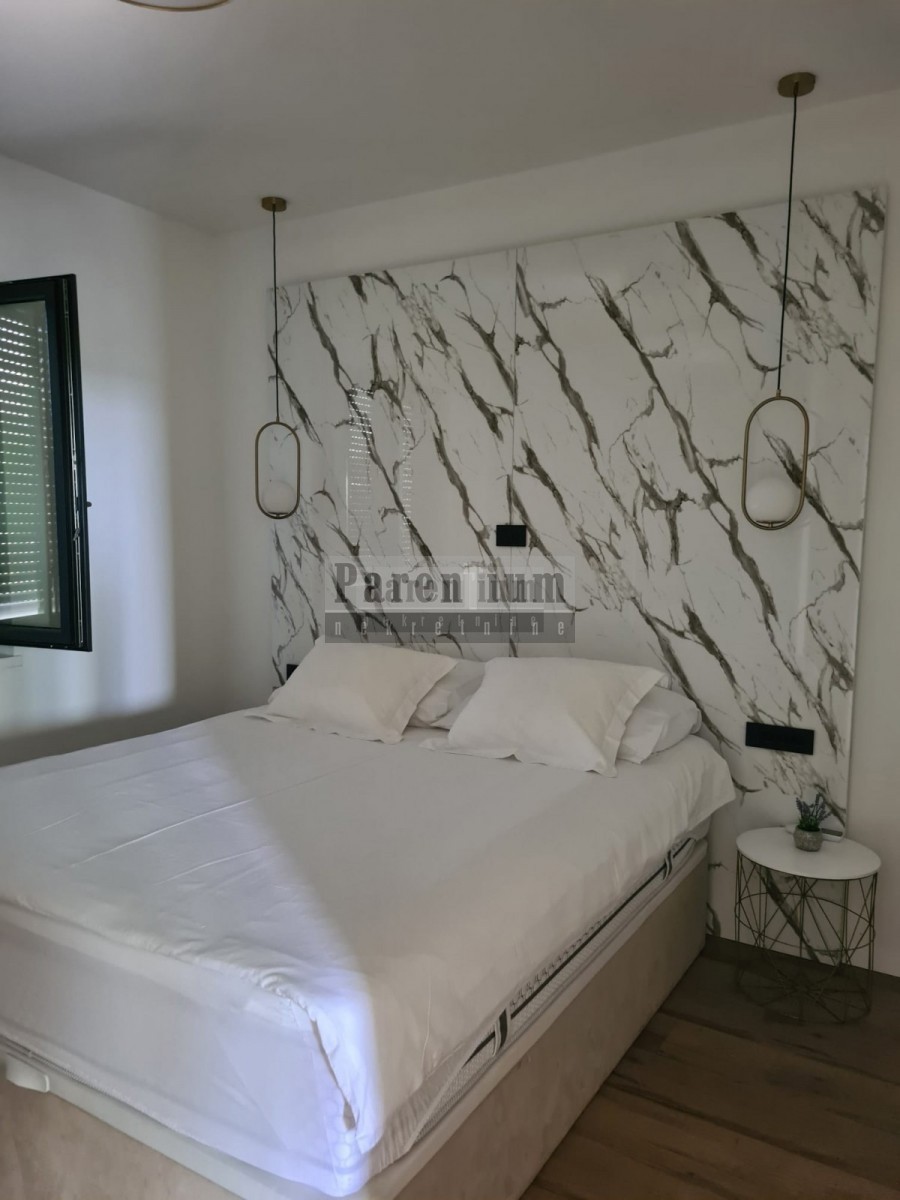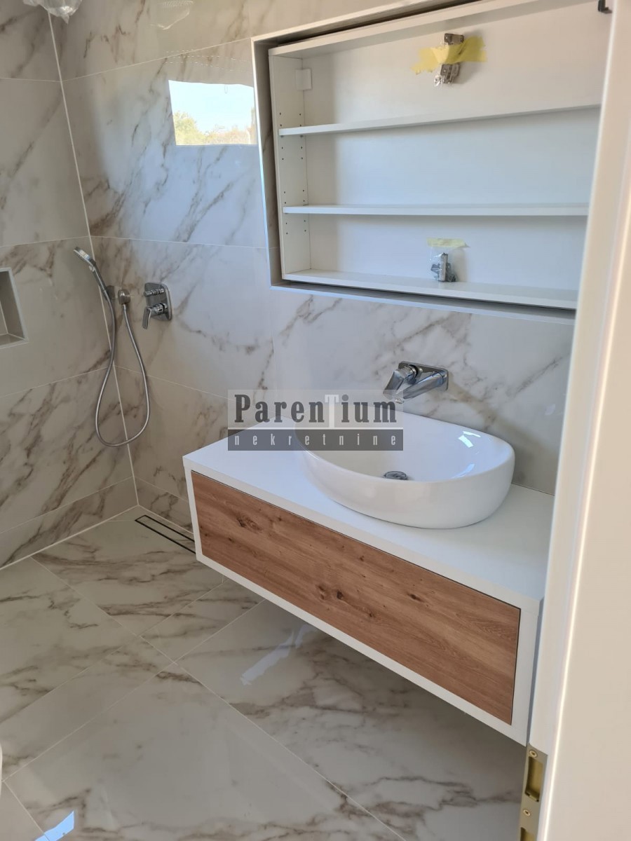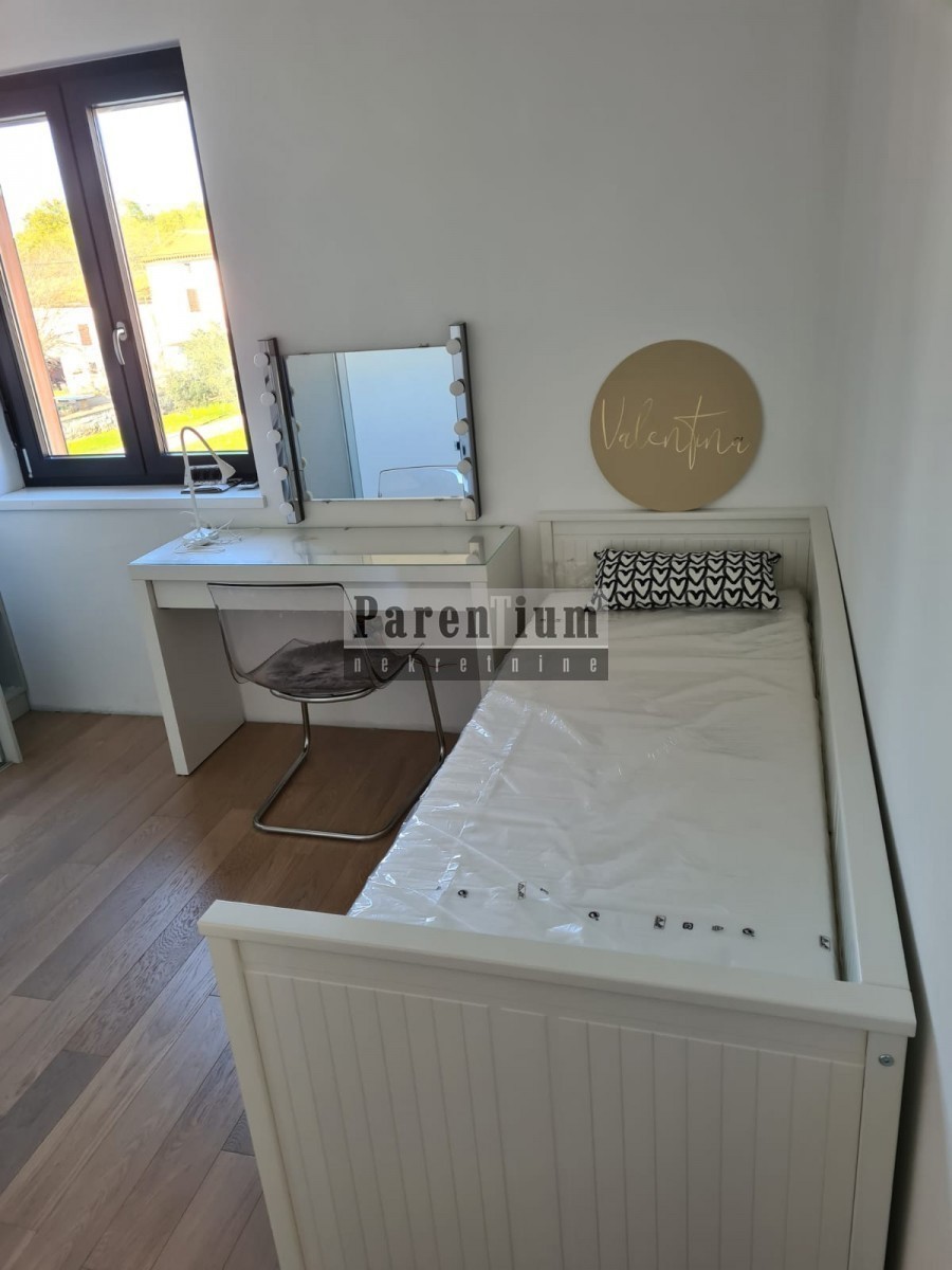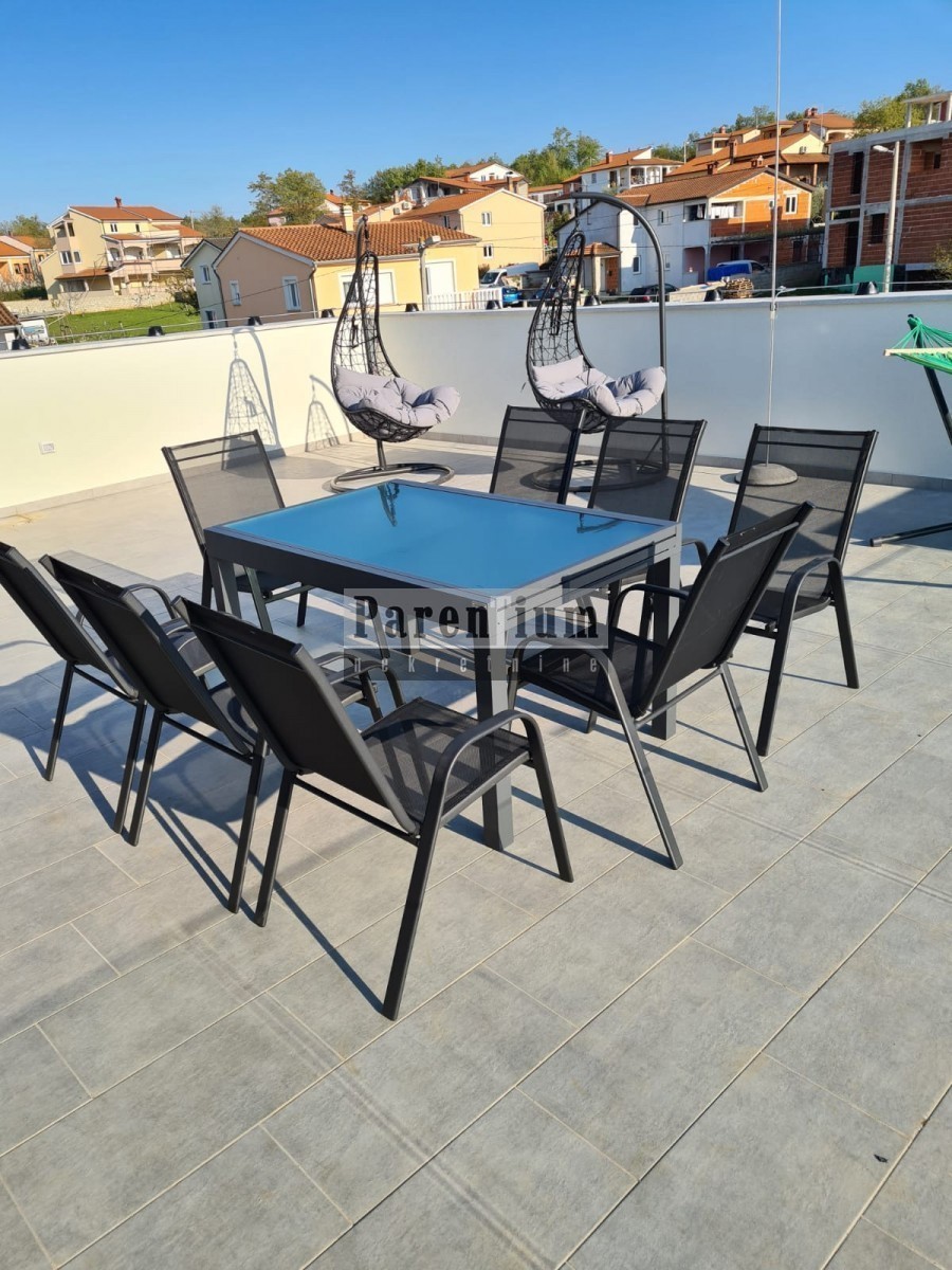 Poreč, surroundings An apartment for sale on the first floor, with two bedrooms and a living room, a kitchen with a dining room, a terrace and a bathroom, as well as a wardrobe and a pantry. The apartment has access to the roof terrace with a view of th