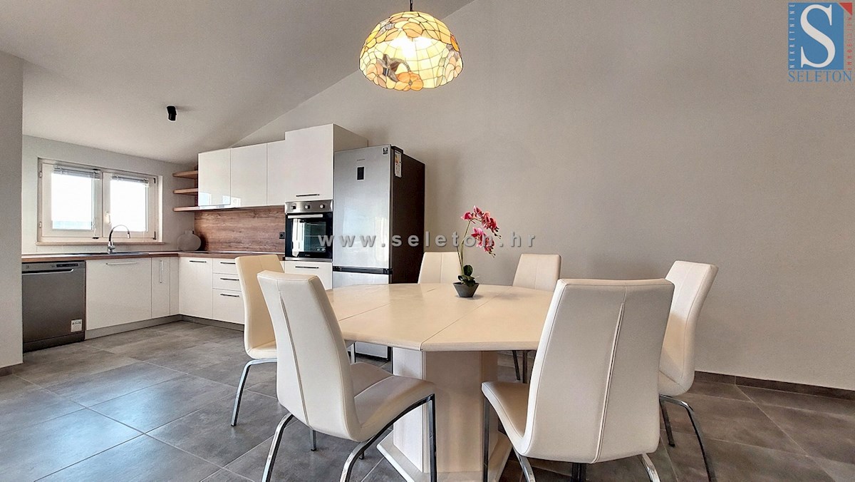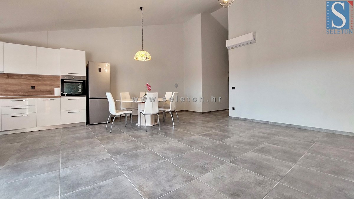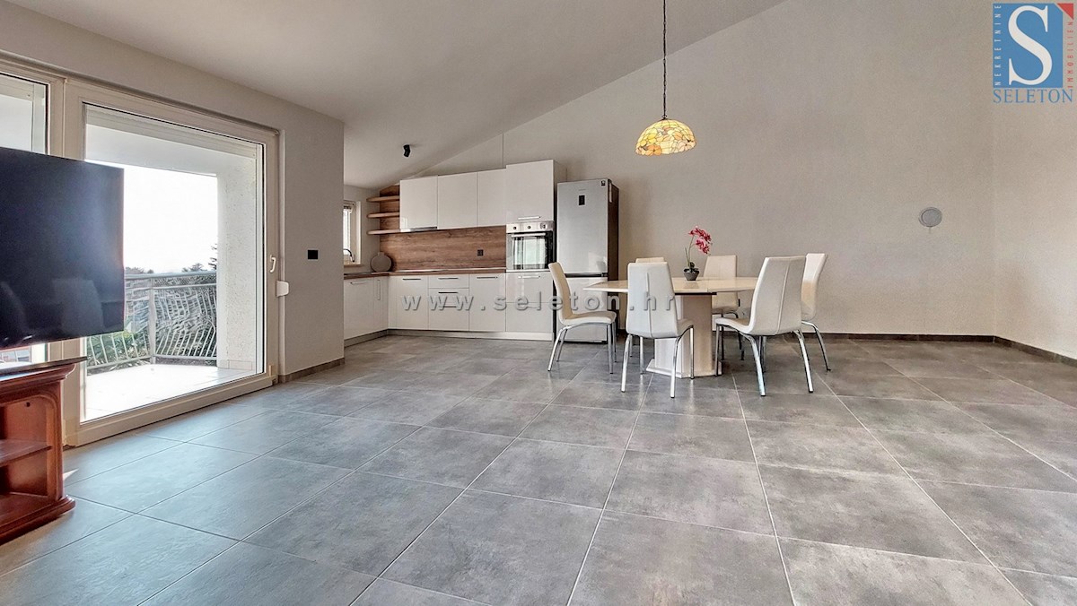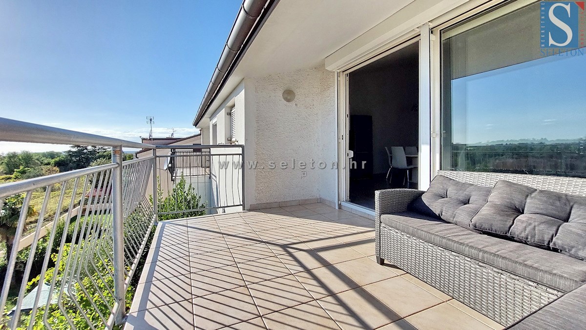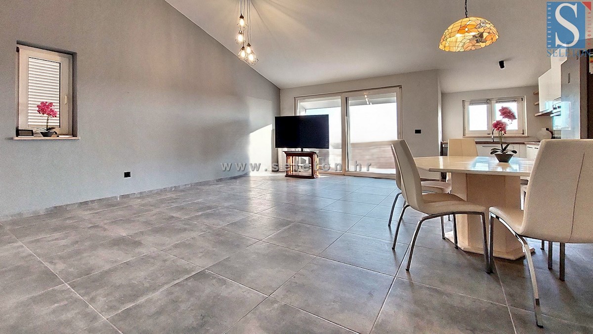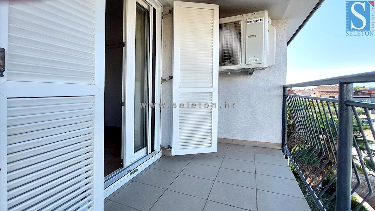 Poreč, in a quiet urban area, an apartment of 88 m² is for sale, consisting of a living room, kitchen, dining room, terrace with a view of the sea, hallway, bathroom and two bedrooms, one of which has a terrace (with minimal modifications, one more room c