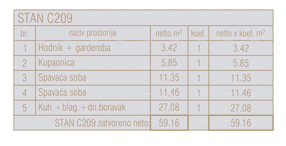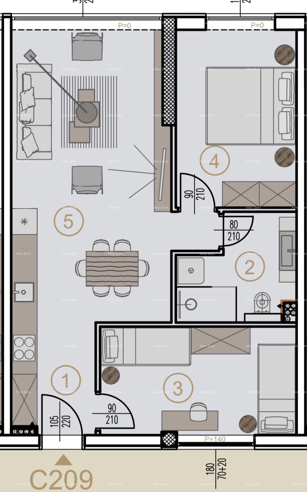 The residential-business building is divided into three units, the central, southern and northern volumes. It will have a total of 78 apartments and 18 business units. The building has a swimming pool and an underground garage. The apartments are sold on