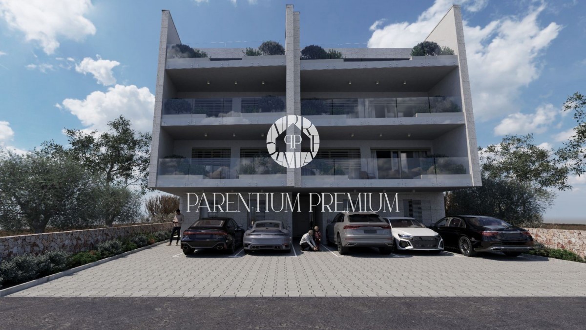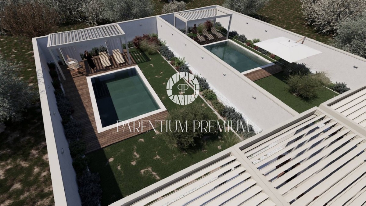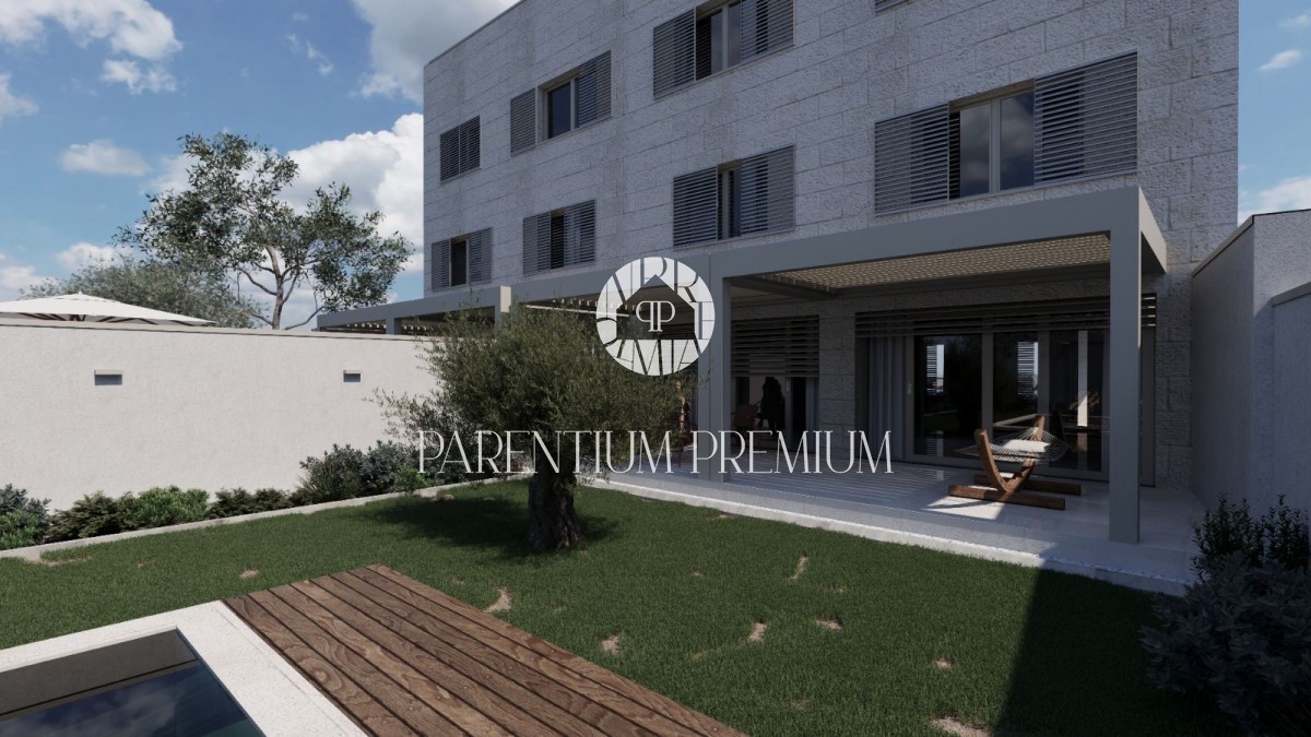 Istria, Poreč area A modern ground floor apartment with a swimming pool and a garden is for sale, just 2km from the sea. The apartment has a total area of 87.46 m2 and consists of an entrance hall, bathroom, two bedrooms, one of which has its own bathr