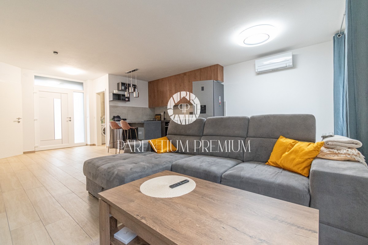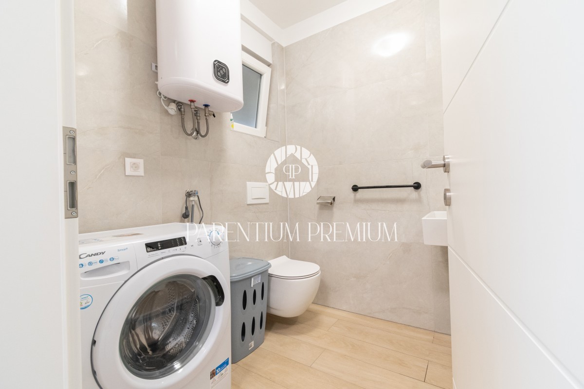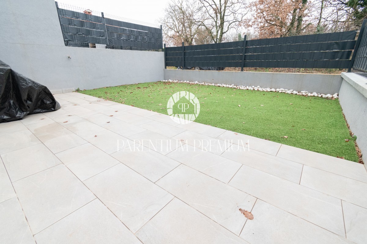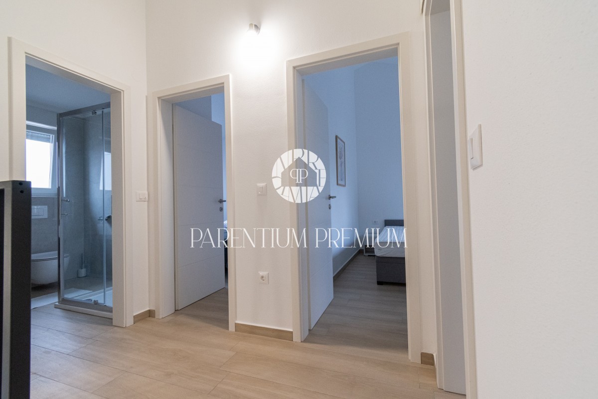 Istria, Poreč A new two-story apartment for sale, located in a quiet part of Poreč within walking distance of all amenities necessary for life. The ground floor consists of an entrance hall, toilet, storage room, kitchen with dining room and living room