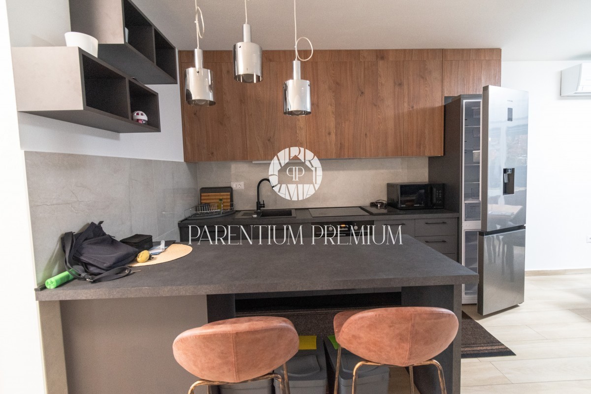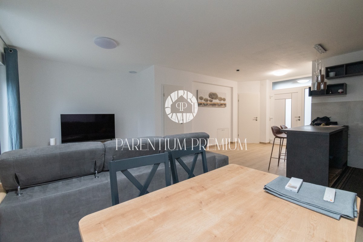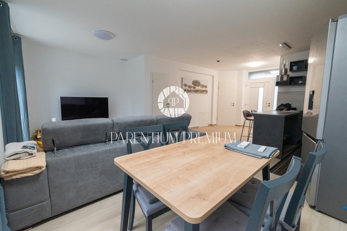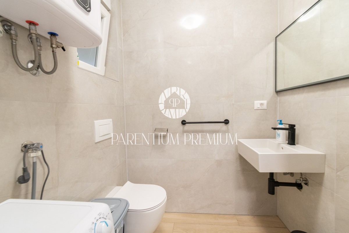 Istria, Poreč A new two-story apartment for sale, located in a quiet part of Poreč within walking distance of all amenities necessary for life. The ground floor consists of an entrance hall, toilet, storage room, kitchen with dining room and living room