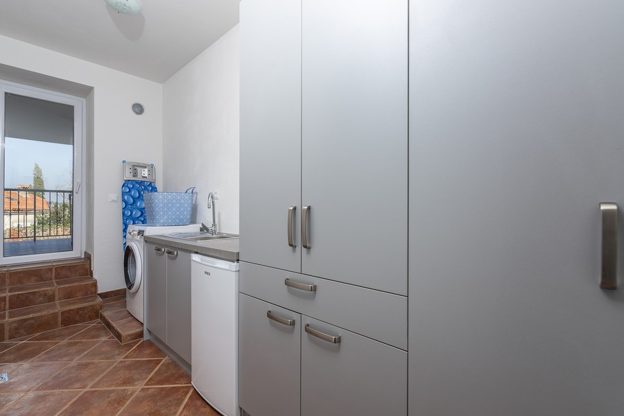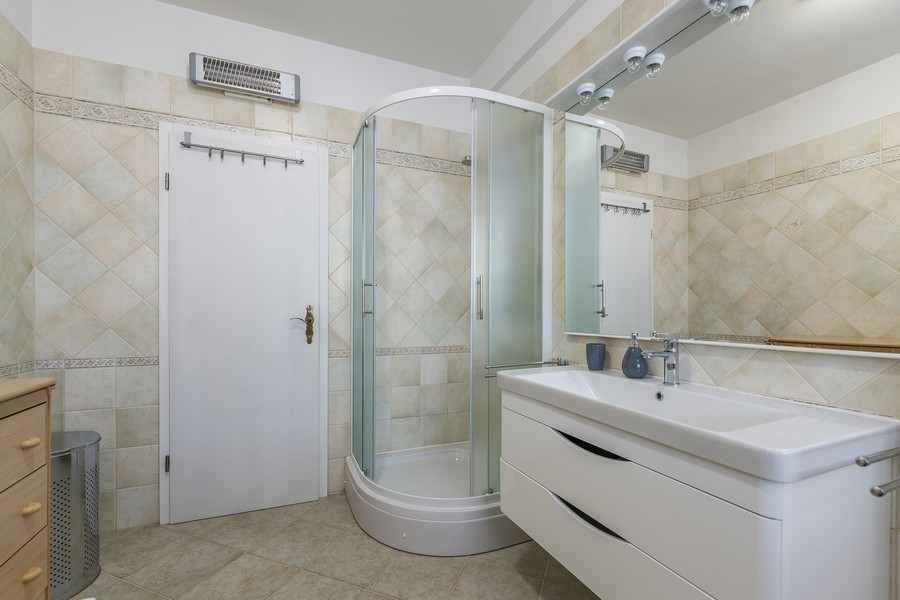 It consists of two floors, on the 1st floor there are 4 bedrooms with double beds (one has access to the balcony), bathroom, storage room and laundry room which leads to another balcony. On the 2nd floor there is a living room with kitchen and dining are
