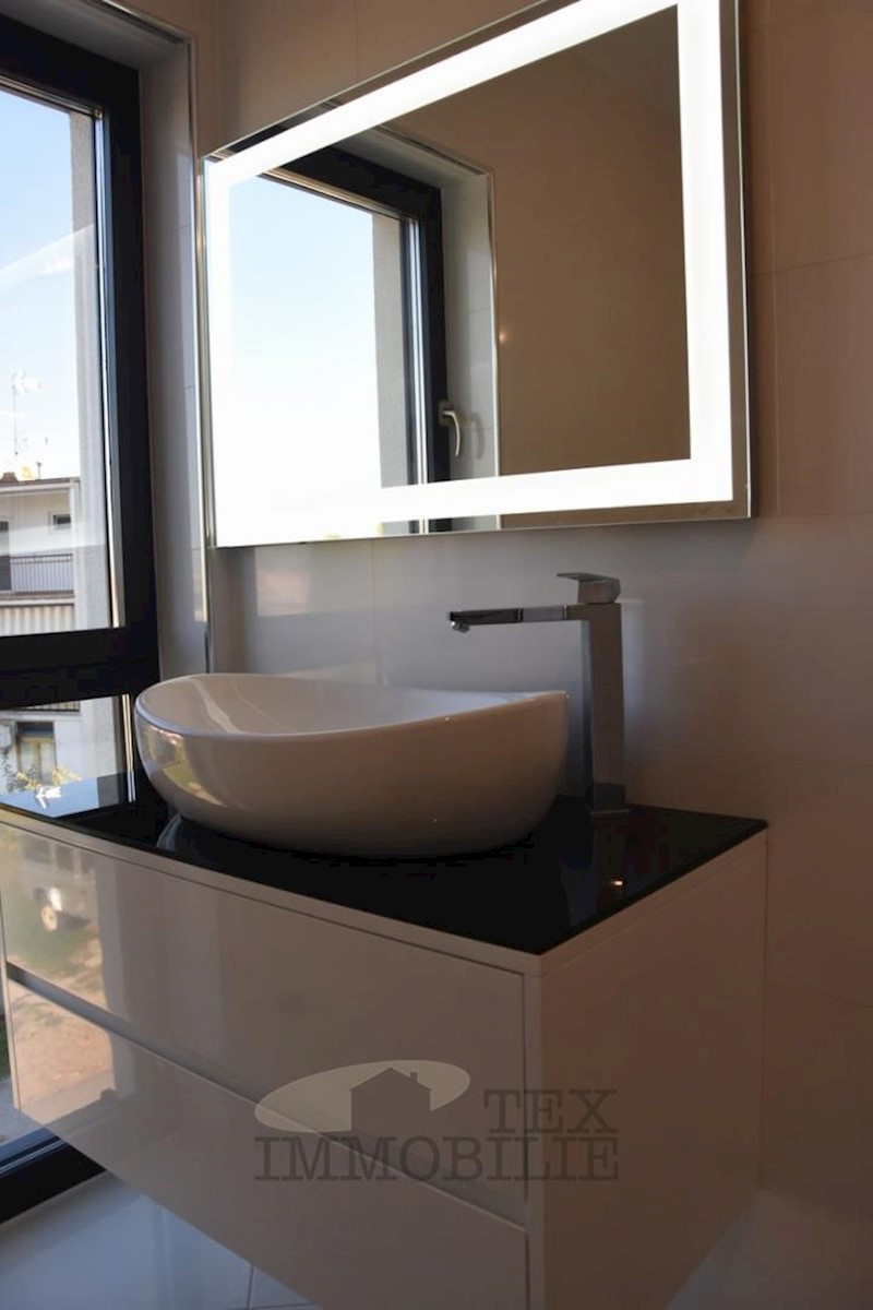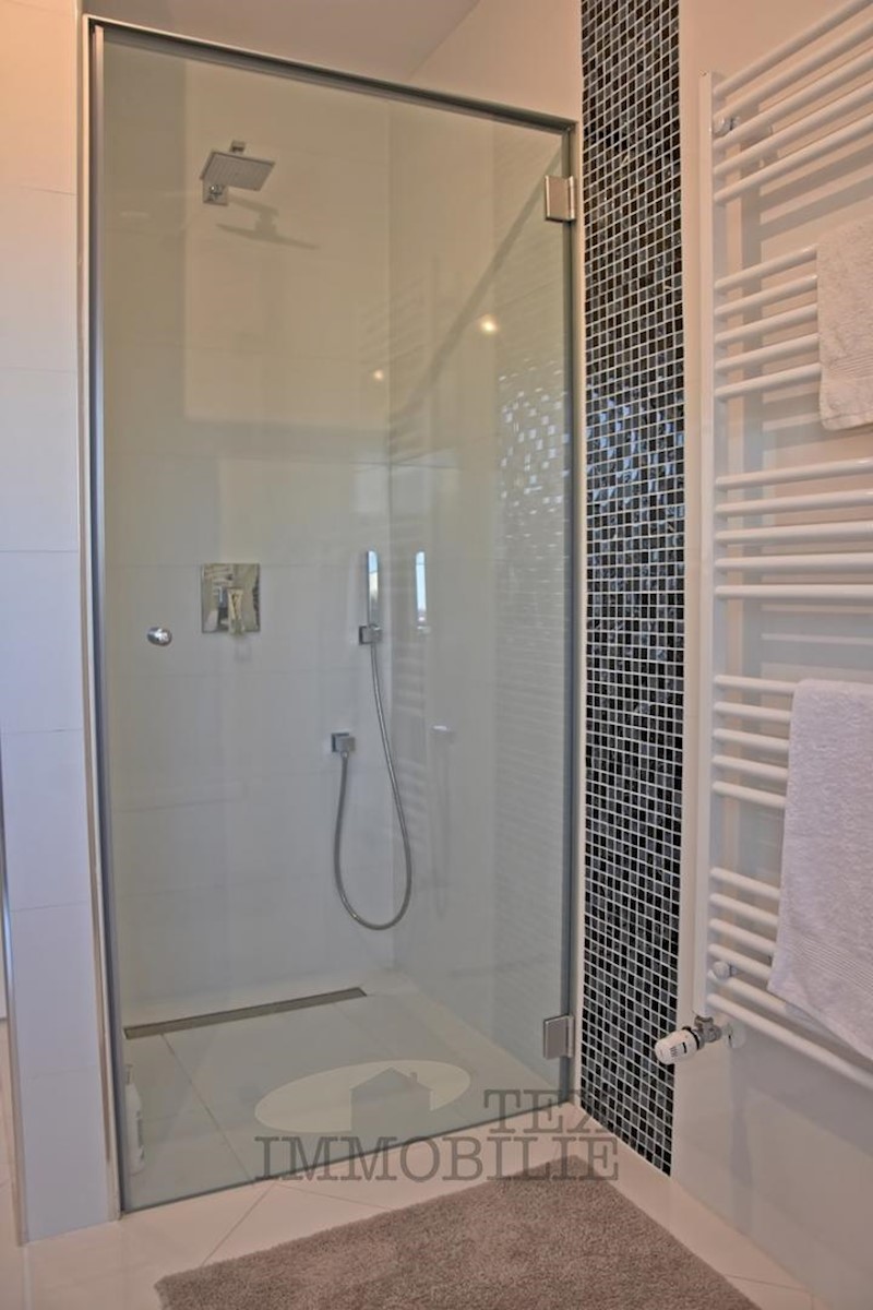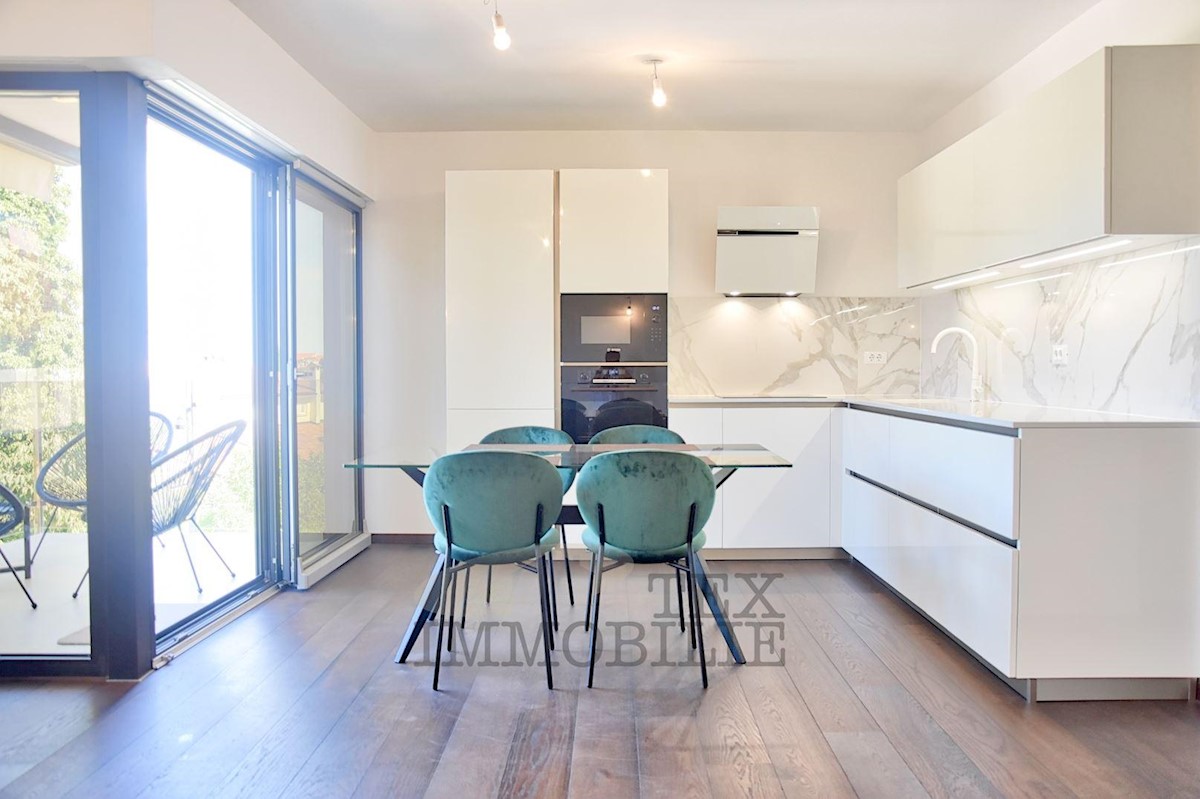 Luxurious apartment of (78.17 m2 apartment + 19.28 m2 storage and parking in the garage + 13.50 m2 outdoor parking) is for sale in a modern new building on the 1st floor of the highest quality in an exclusive location in Porec, 200 m from the sea and the
