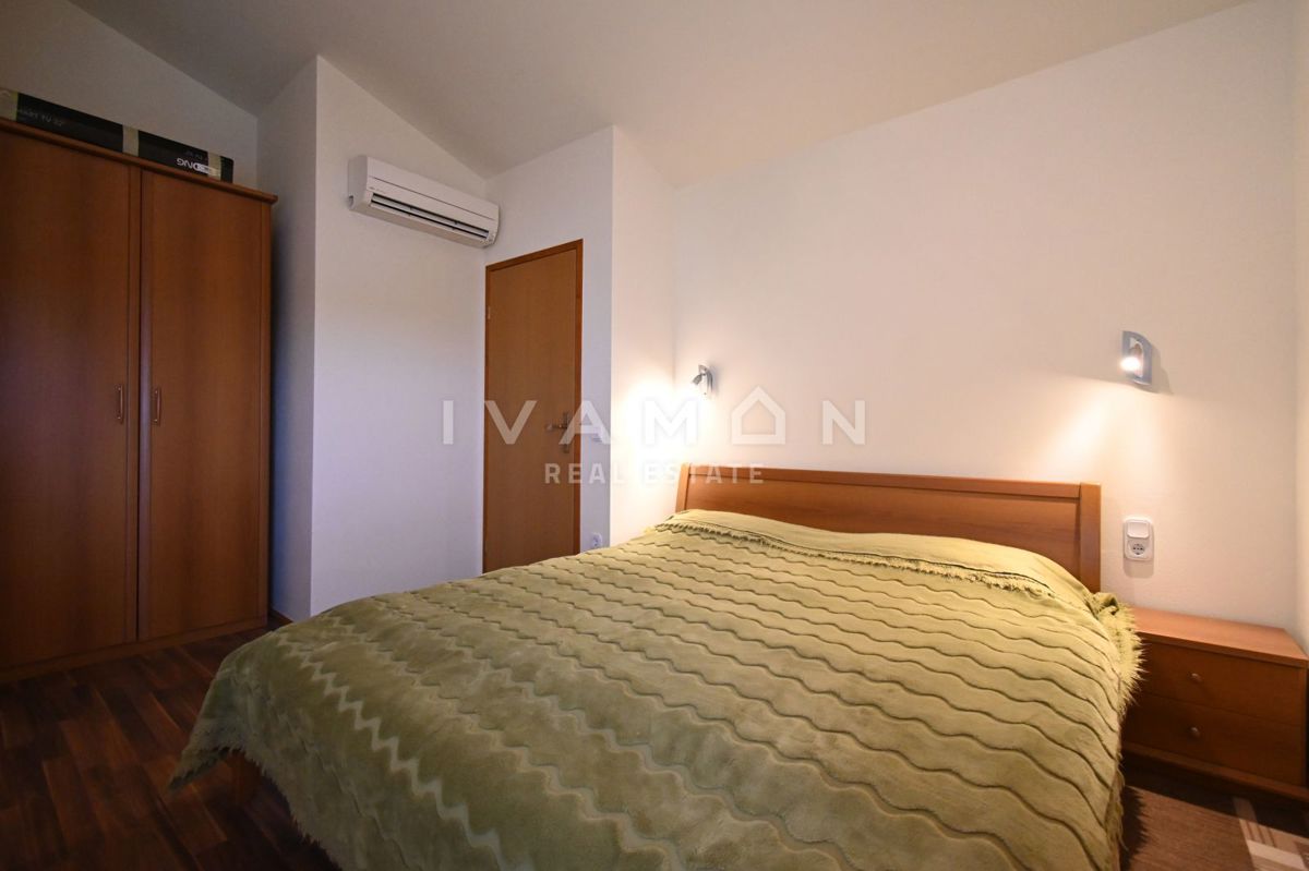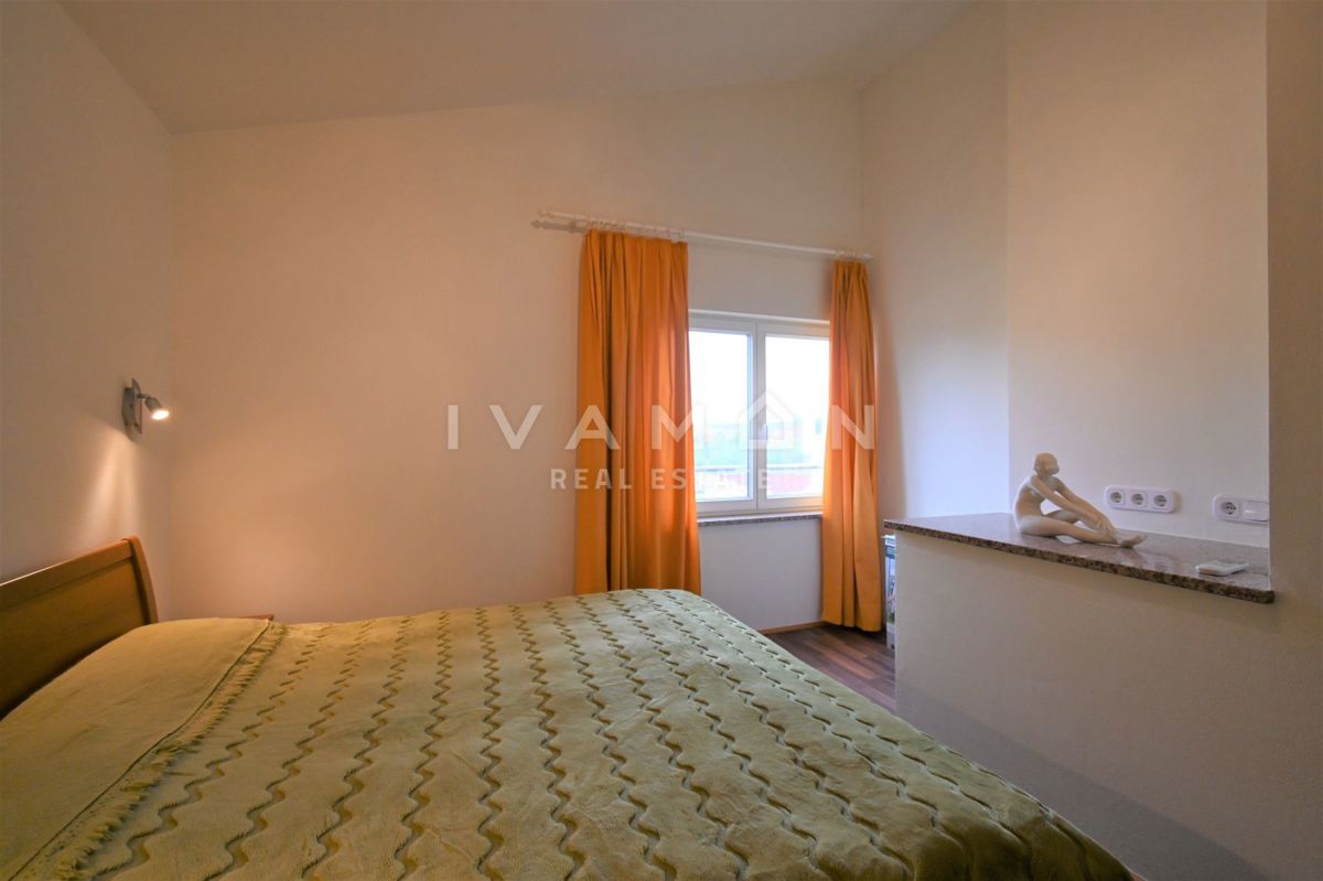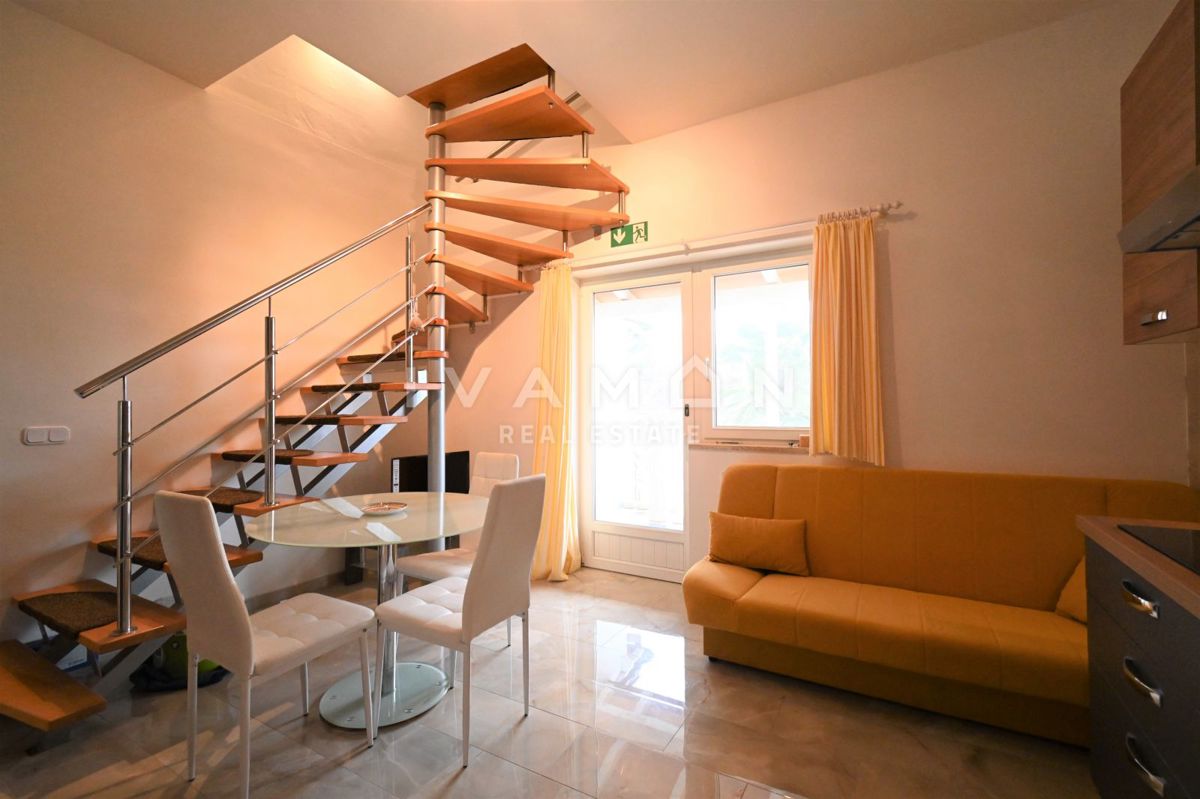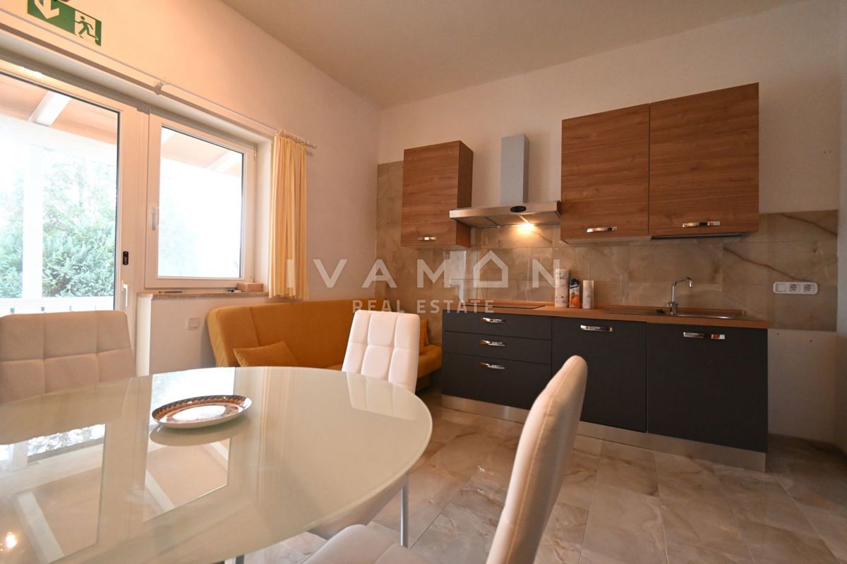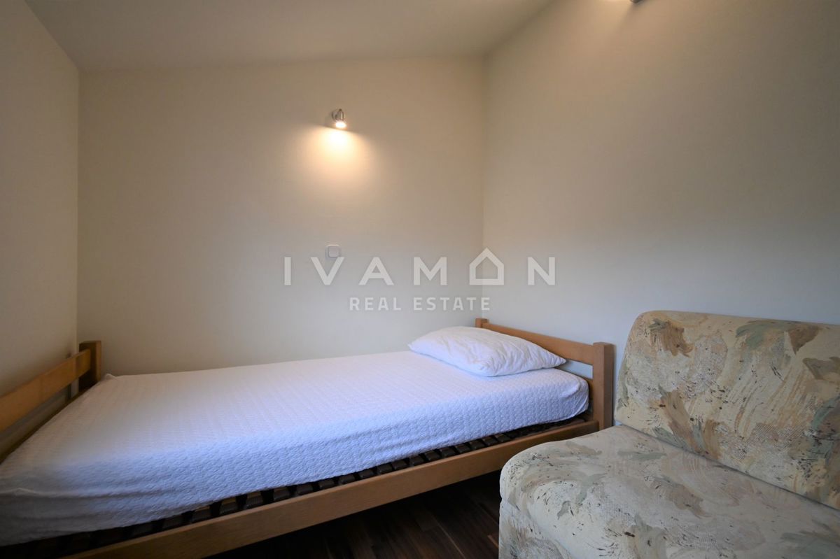 Not far from the center of Poreč, at a distance of 2 km from the beach, a renovated apartment on the ground floor of a residential building is for sale. The apartment has an area of 50 m2, spread over two floors. On the ground floor there is a living r