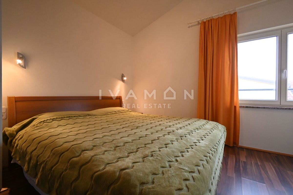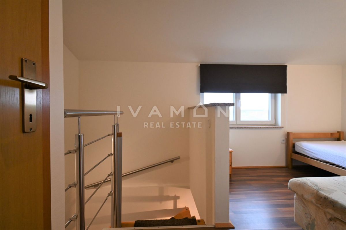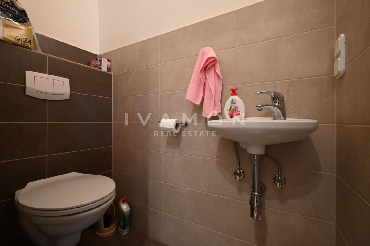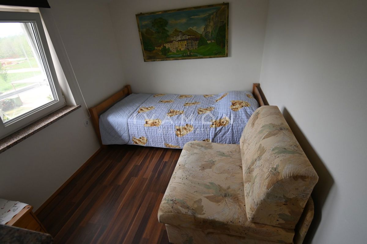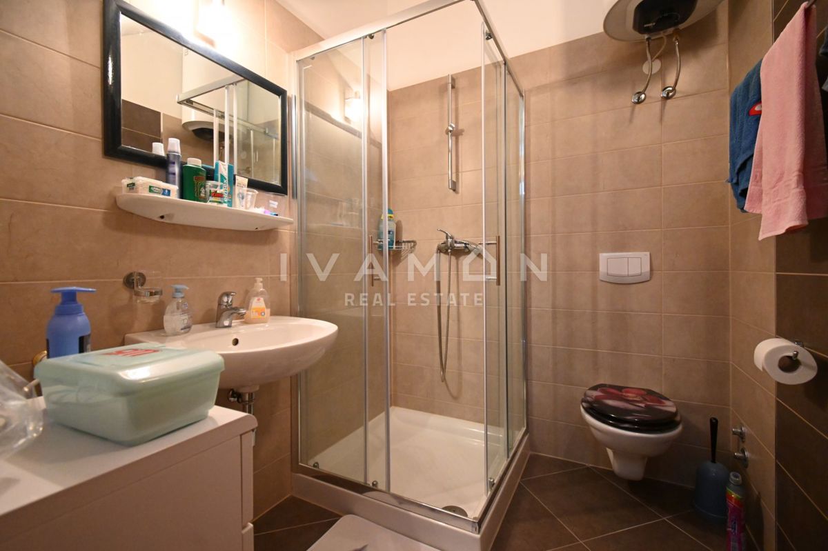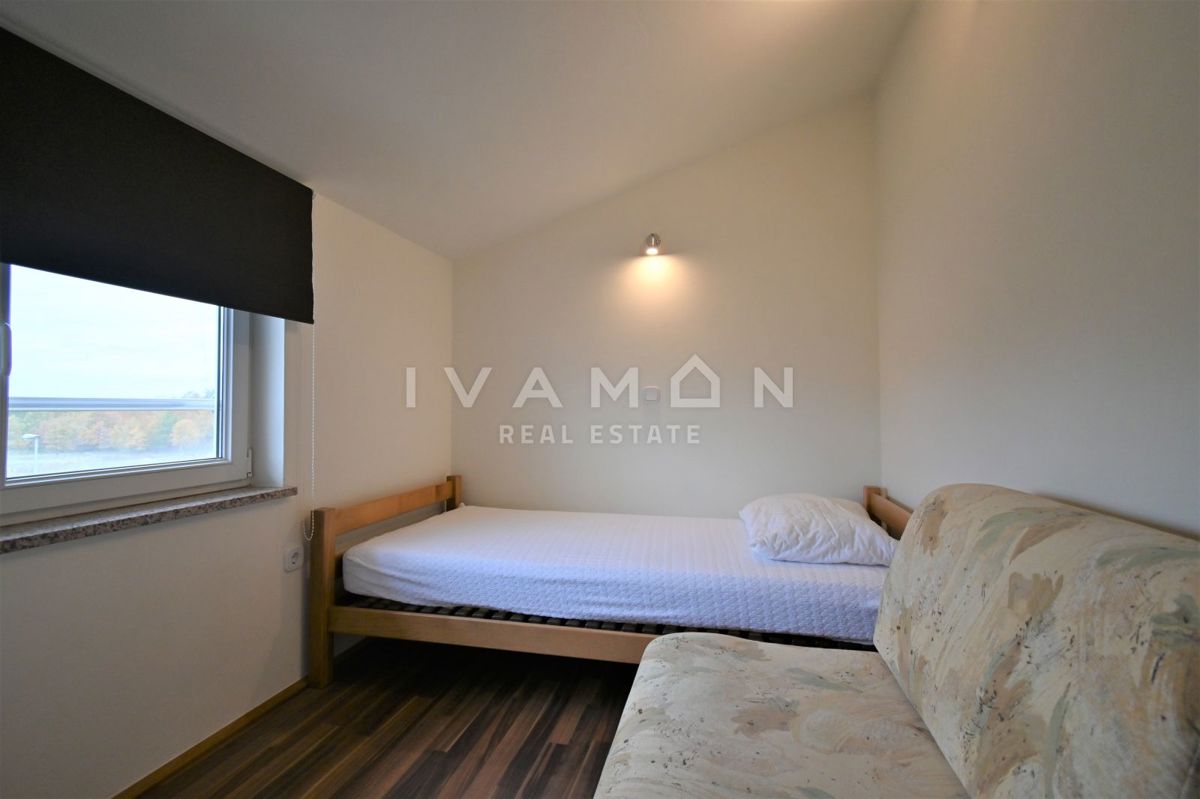 Not far from the center of Poreč, at a distance of 2 km from the beach, a renovated apartment on the ground floor of a residential building is for sale. The apartment has an area of 50 m2, spread over two floors. On the ground floor there is a living r