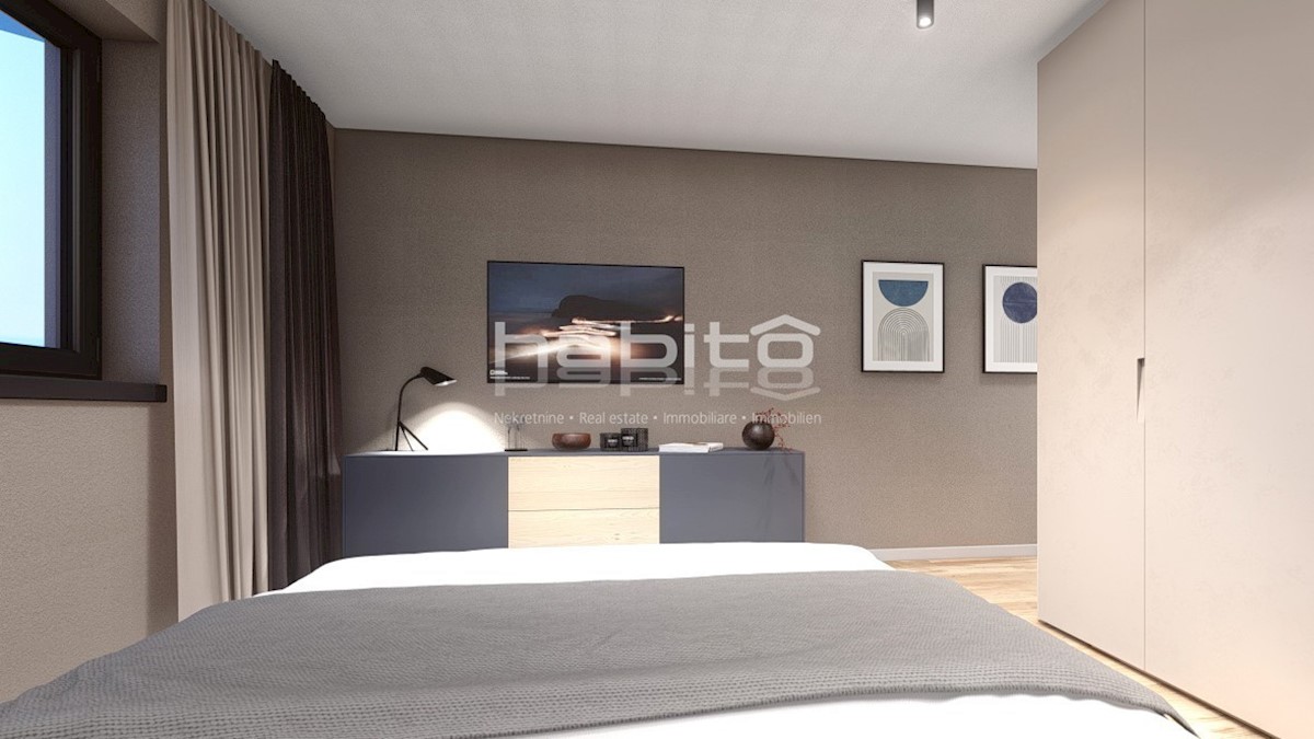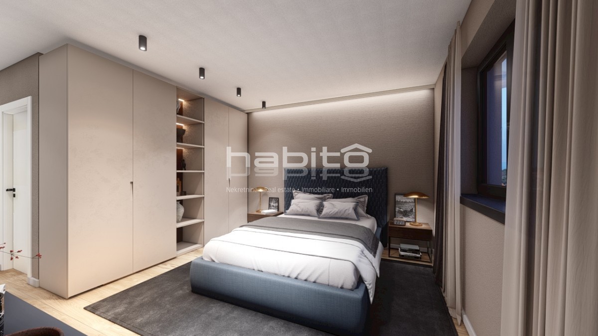 This exclusive apartment of 253 m2 in Porec consists of a large living room, kitchen and dining room, 5 bedrooms, 5 bathrooms, 2 storage rooms, a garage and a spacious roof terrace of 182 m2. The apartment has underfloor heating with a heat pump and air c