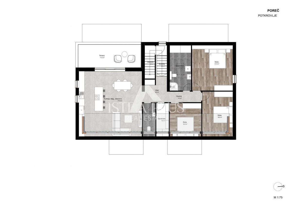 S25 Apartment 5 Staircase 4.40 m2 Entrance 6.10 m2 Hallway 4.30 m2 toilet 4.70 m2 Storage room 4.90 m2 Room 1 12.20 m2 Room 2 16.00 m2 Room 3, 21.60 m2 Bathroom 11.50 m2 Kitchen, dining room & living room 48.30 m2 Terrace (19.90 m2 x 0.75) 1