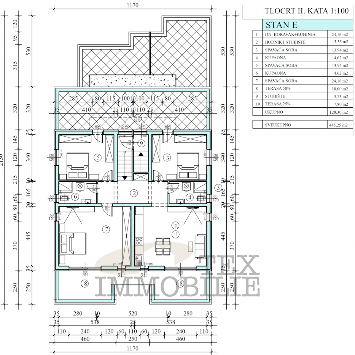 For sale are four apartments, located 8km from the sea and Poreč. In the immediate vicinity, 50 m away, there is a bakery, market, and cafe. The apartment E (120,30 m2 + 4,29 m2 storage) will have living room, 3 sleeping rooms, two terraces and a 2bathroo