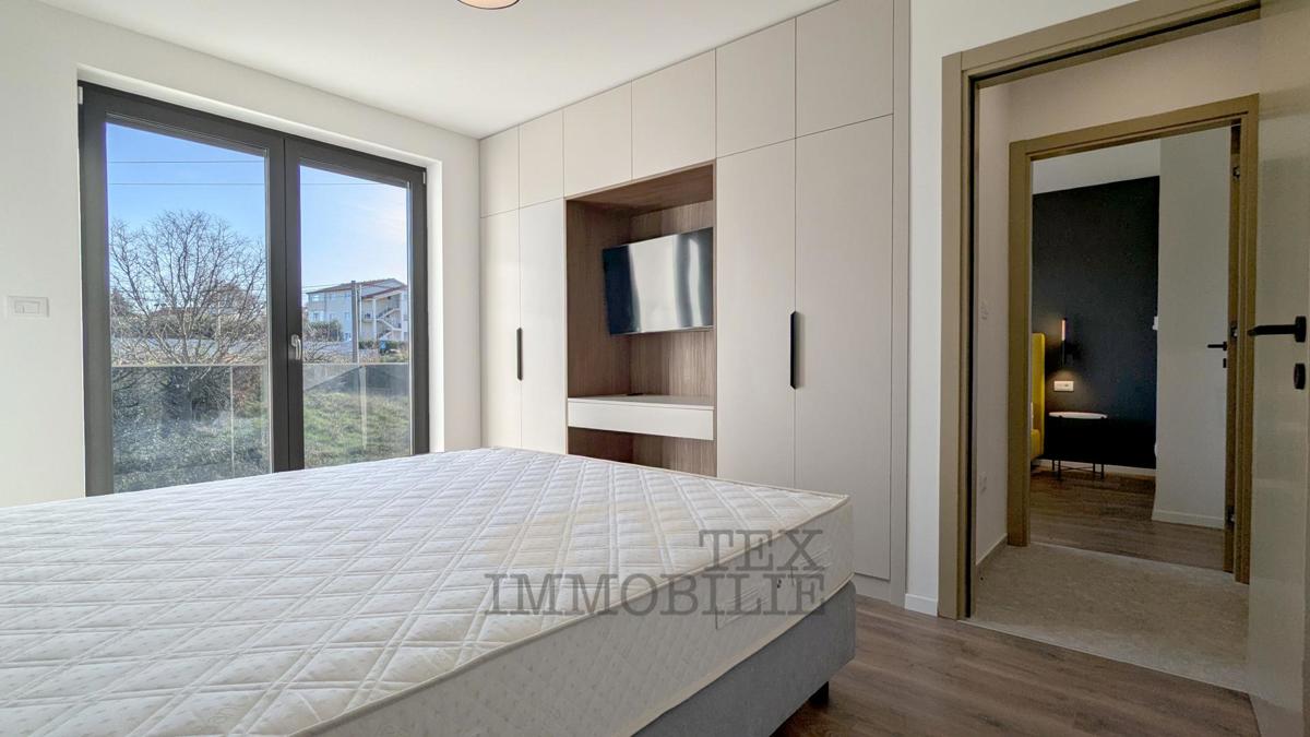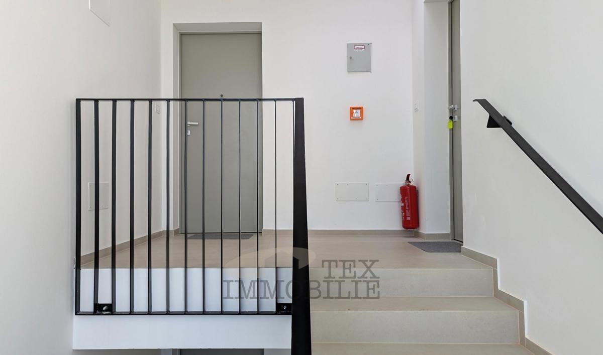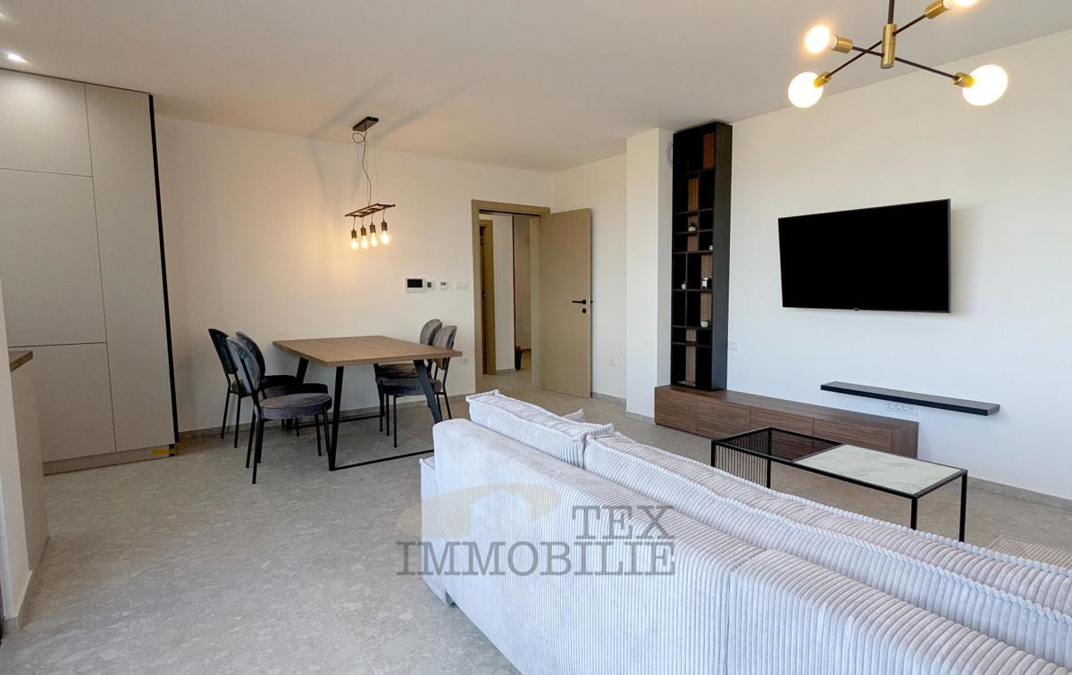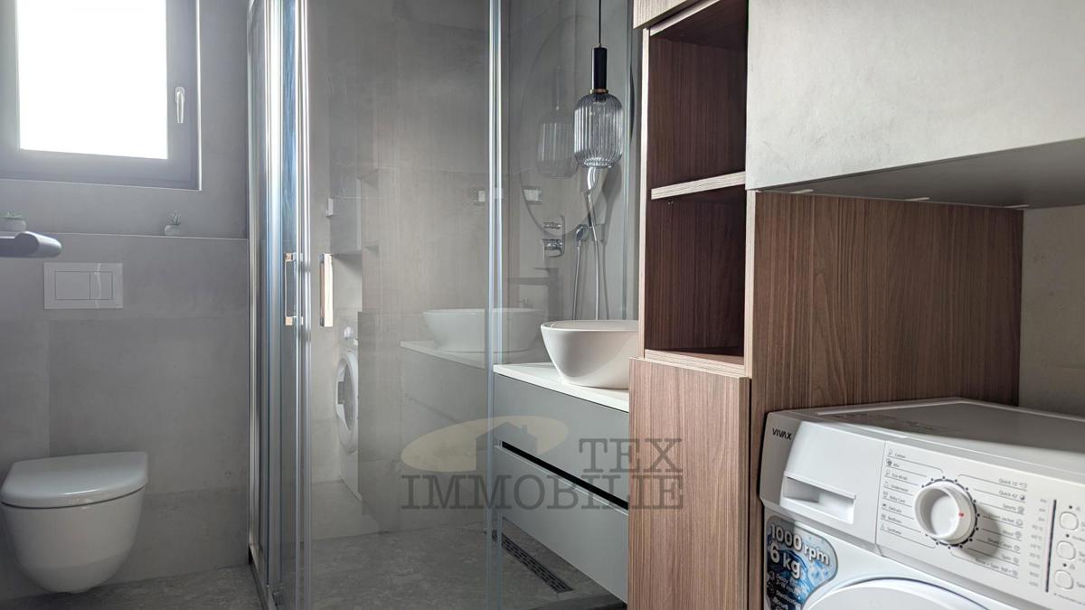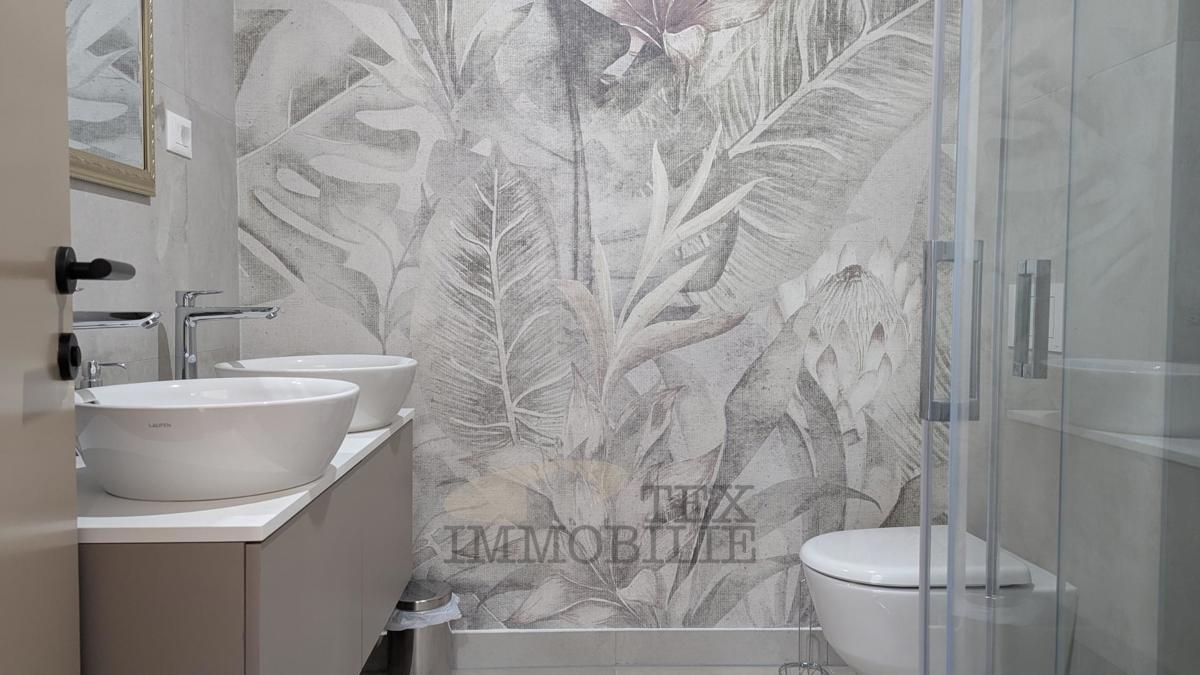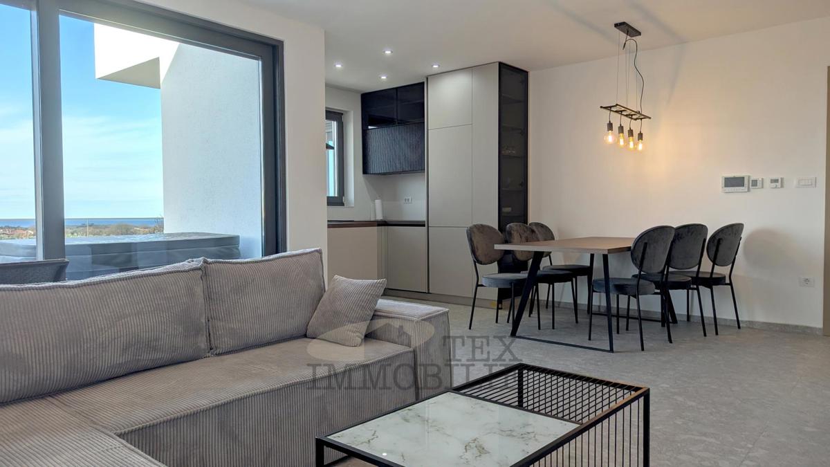 A brand new apartment for sale in a quiet village near Poreč, just 4 km from the sea. This apartment has a total area of 96.56 m2, including a 15.63 m2 terrace with a jacuzzi. It consists of a spacious living room with kitchen and dining area, hallway,