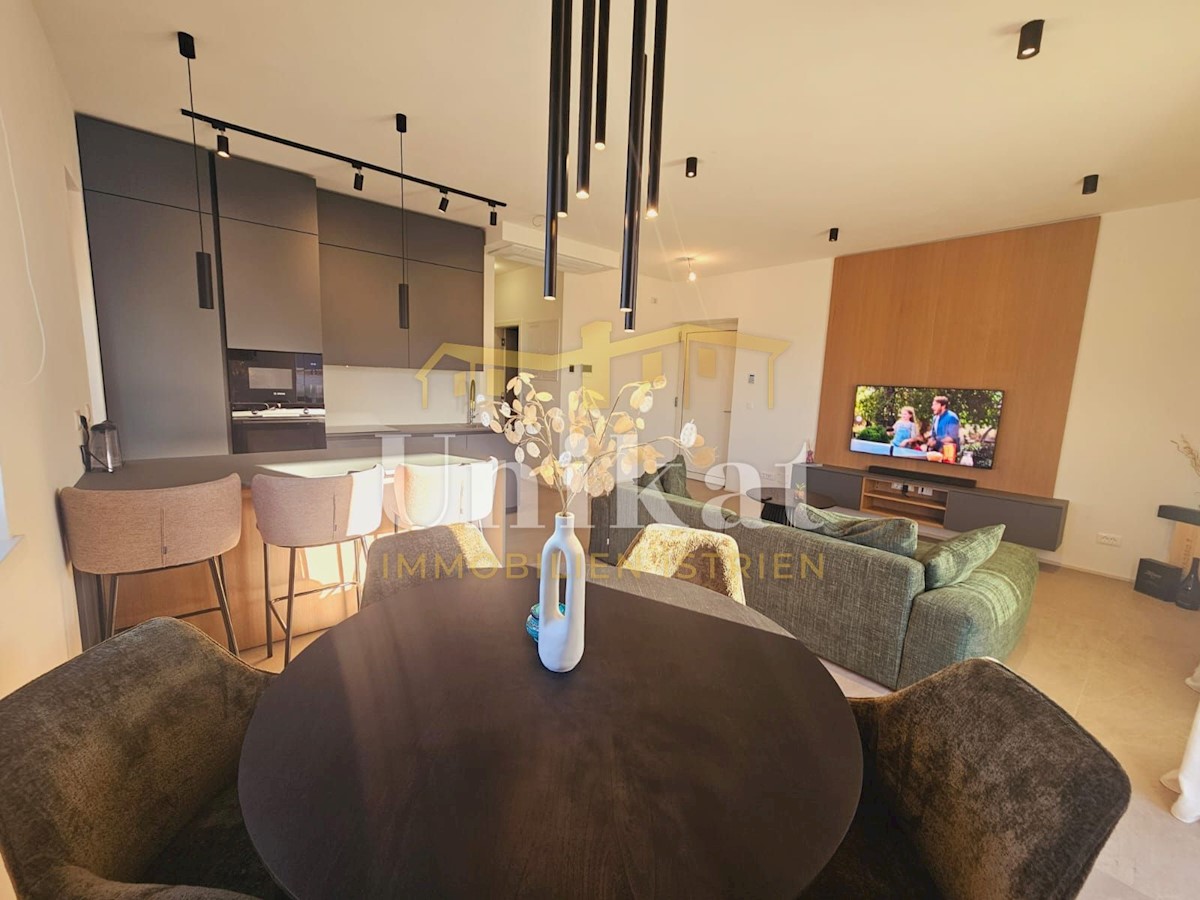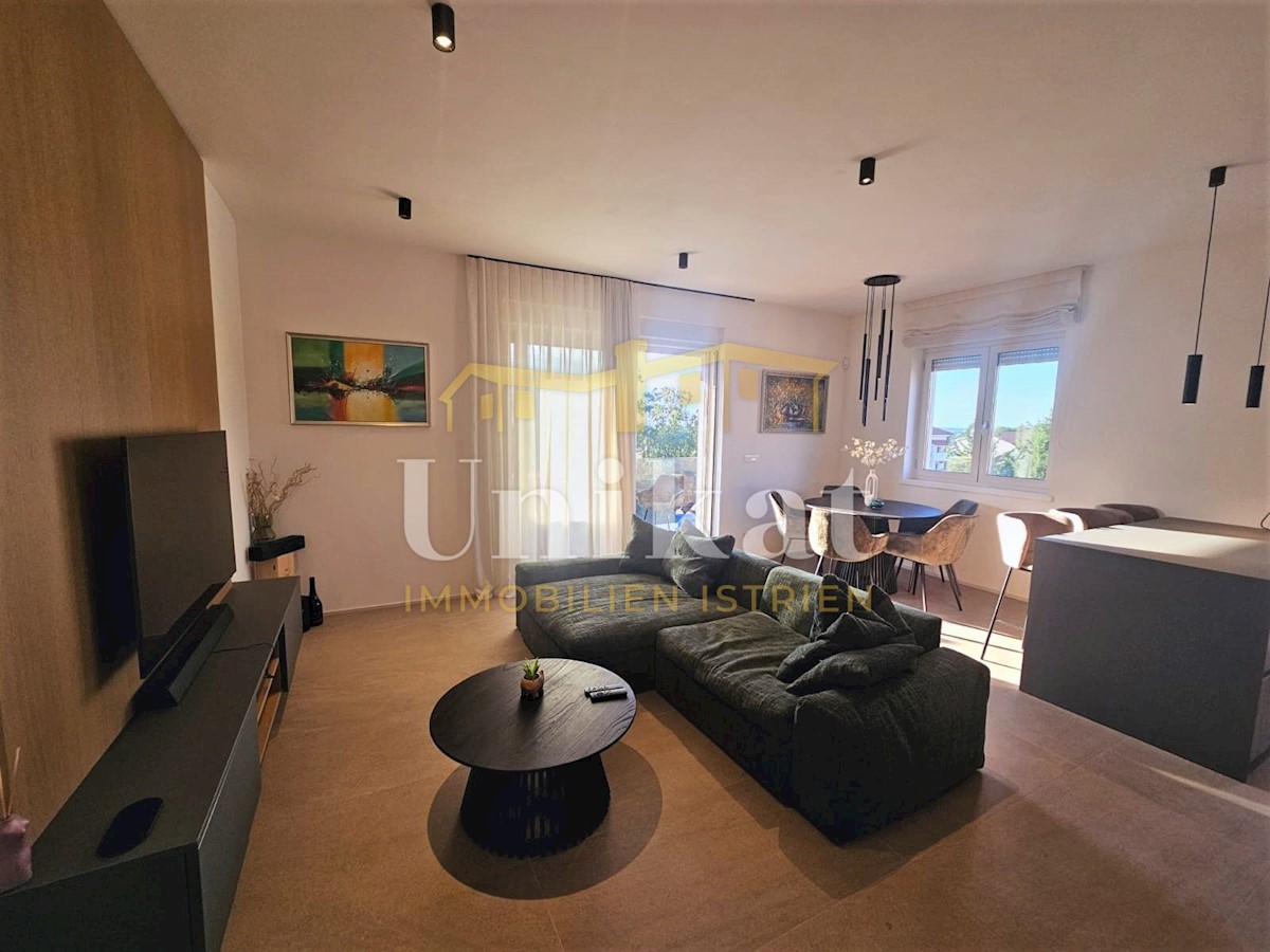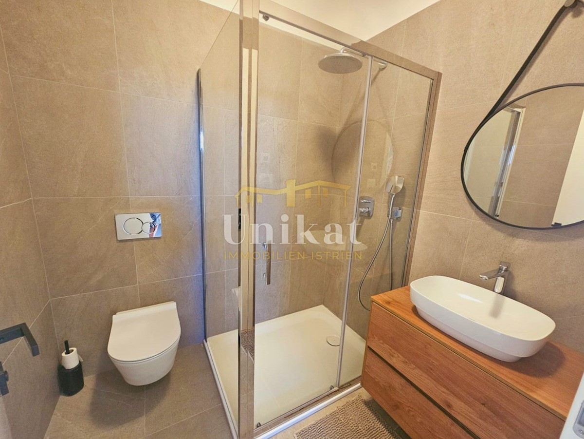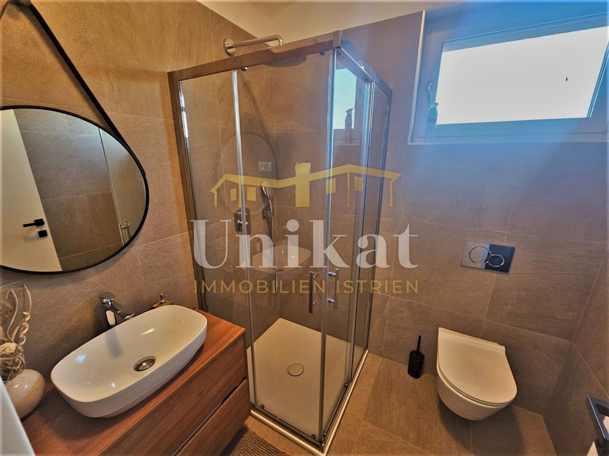 Apartment in a new building, only 2 km from the sea and the center of Poreč. It consists of a hallway, living room with kitchen and dining area, two bedrooms and two bathrooms, which makes a net living area of 64 m2. The balcony has a surface of 12 m2 and