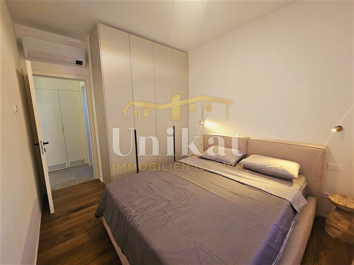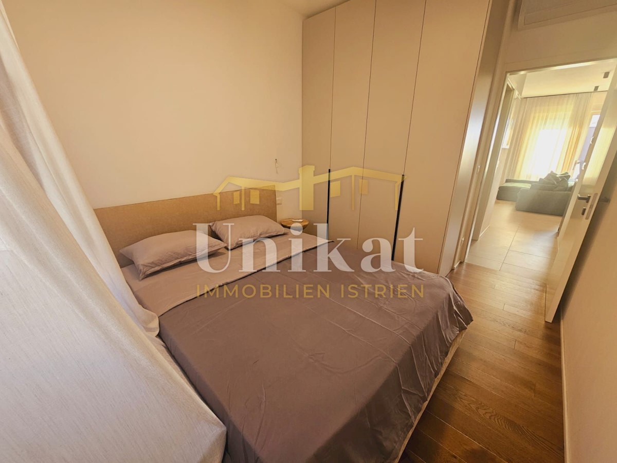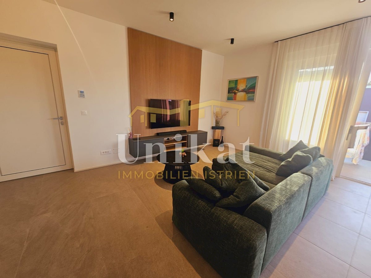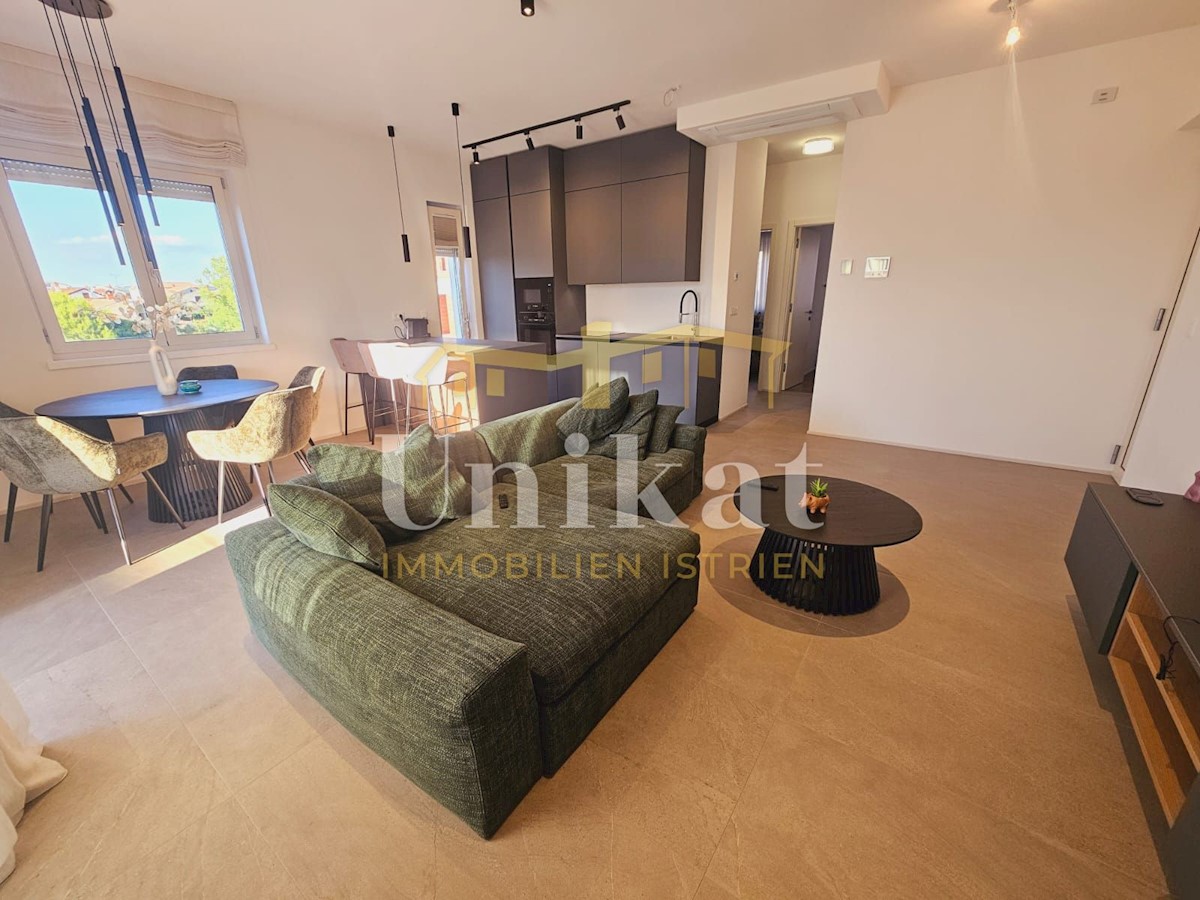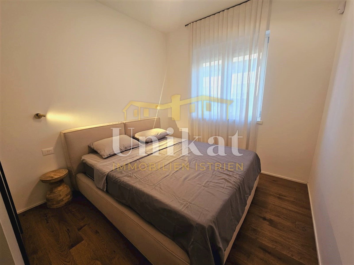 Apartment in a new building, only 2 km from the sea and the center of Poreč. It consists of a hallway, living room with kitchen and dining area, two bedrooms and two bathrooms, which makes a net living area of 64 m2. The balcony has a surface of 12 m2 and
