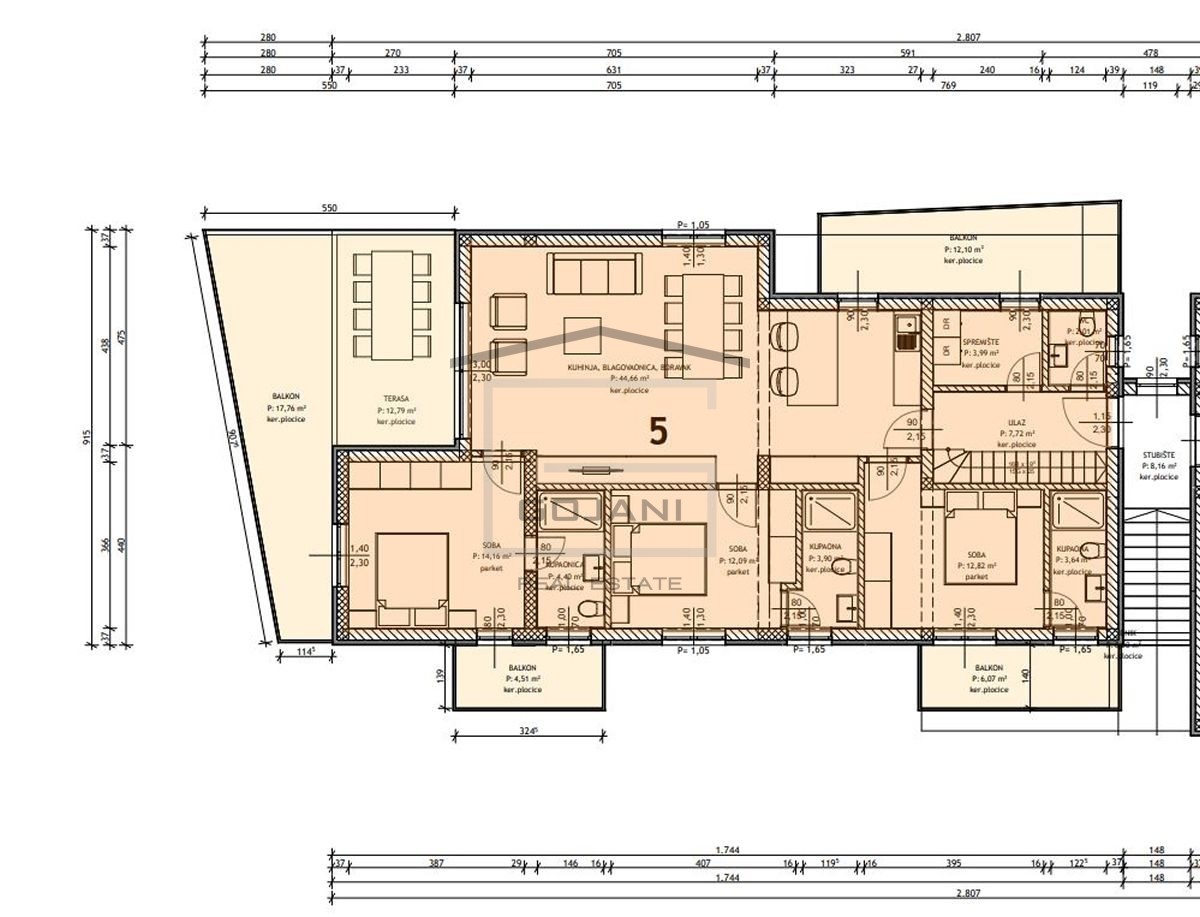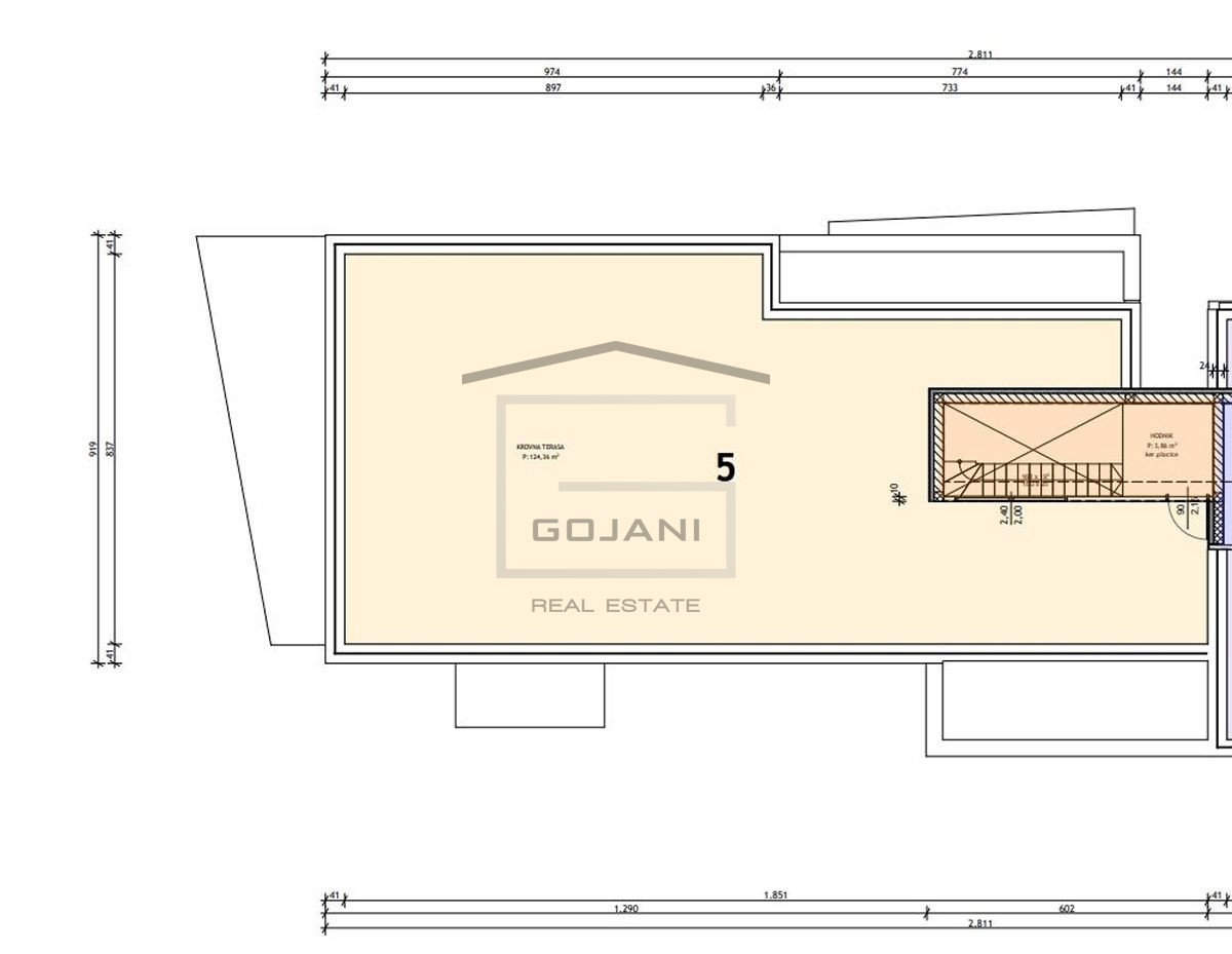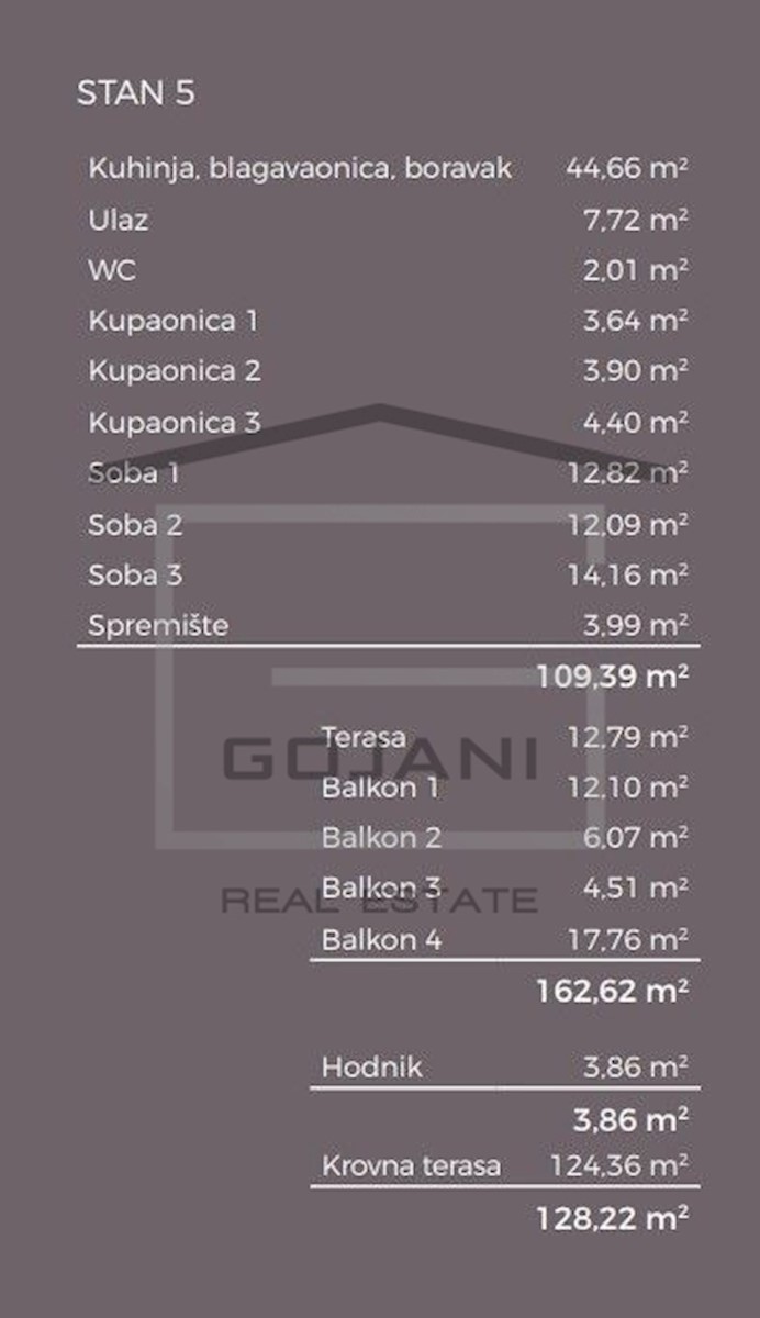 A spacious apartment on top of a new urban villa is located in a nice residential area in Poreč, only 1500 m away from the sea and the center. The apartment is located on the second floor and consists of 109 m2 net usable area, 162 m2 terrace + 128 m2 roo