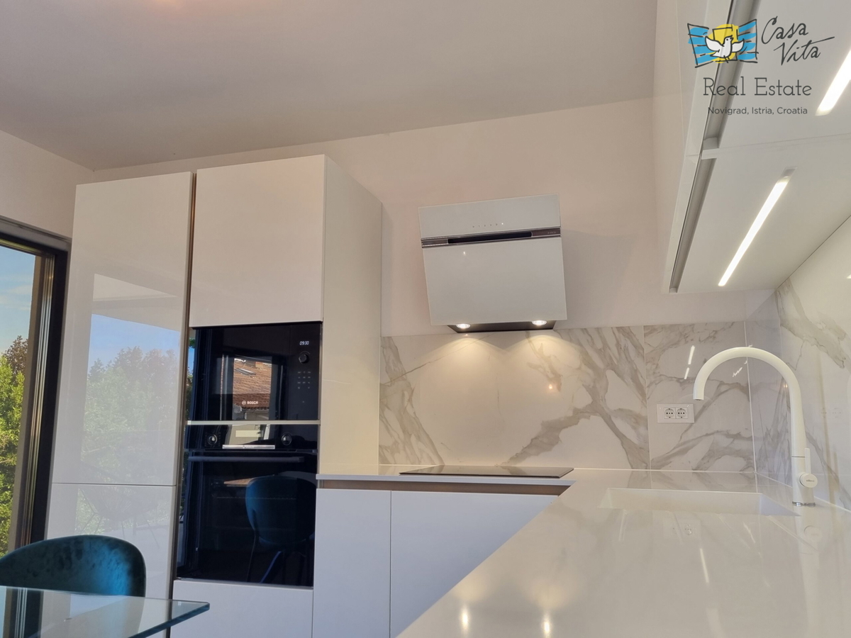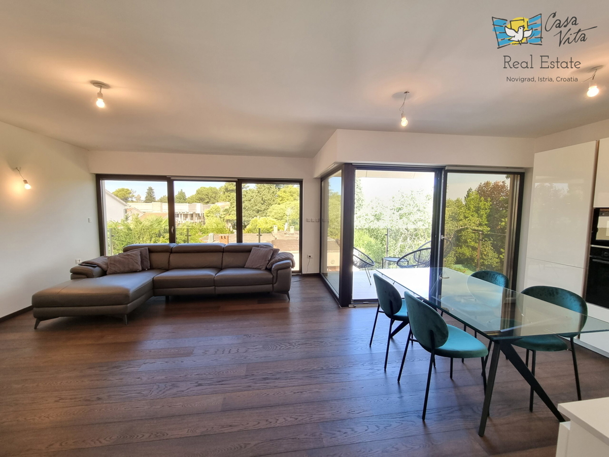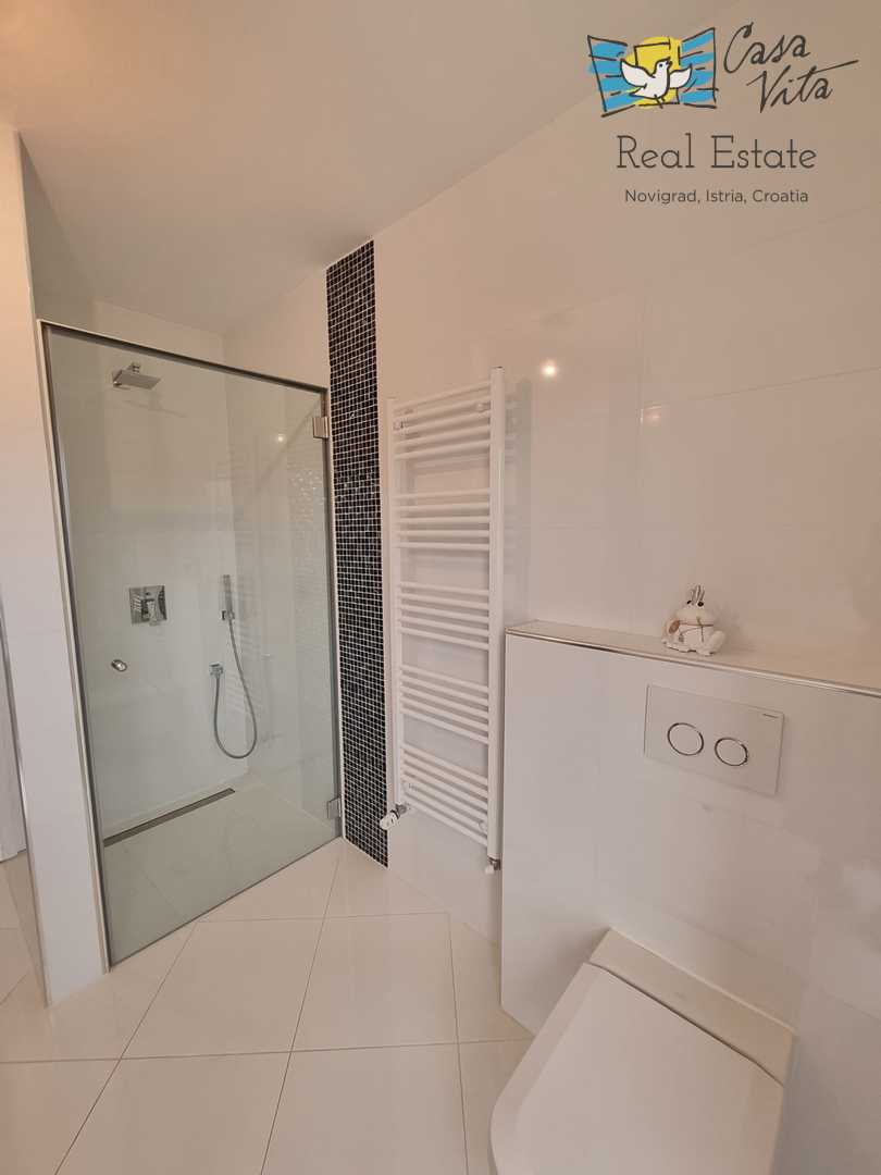Istra, Poreč A luxurious apartment for sale in a quiet street in the center of Poreč, only 150 meters from the sea. It is located on the first floor of a building with 5 residential units, an underground garage and an elevator. The apartment has an area