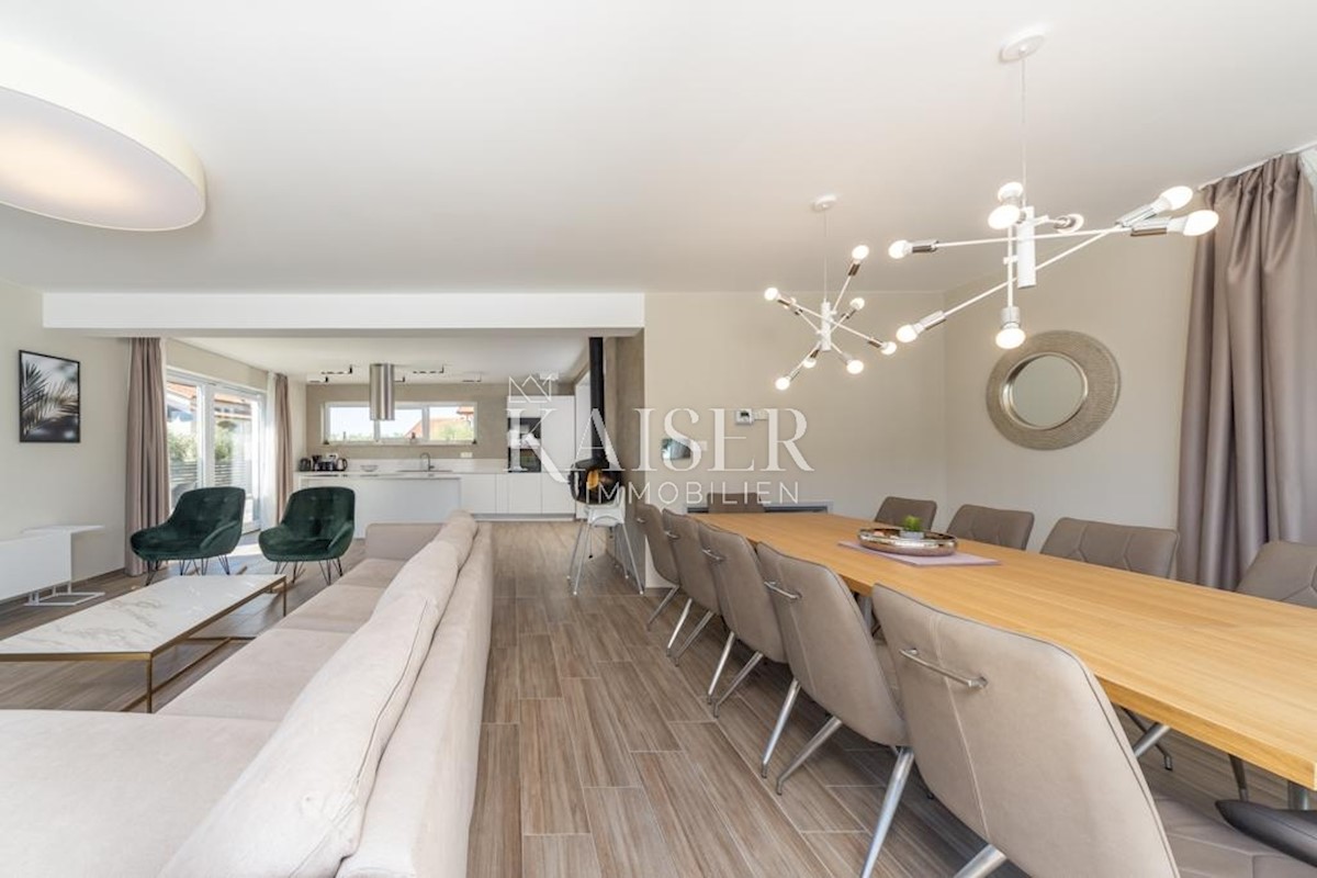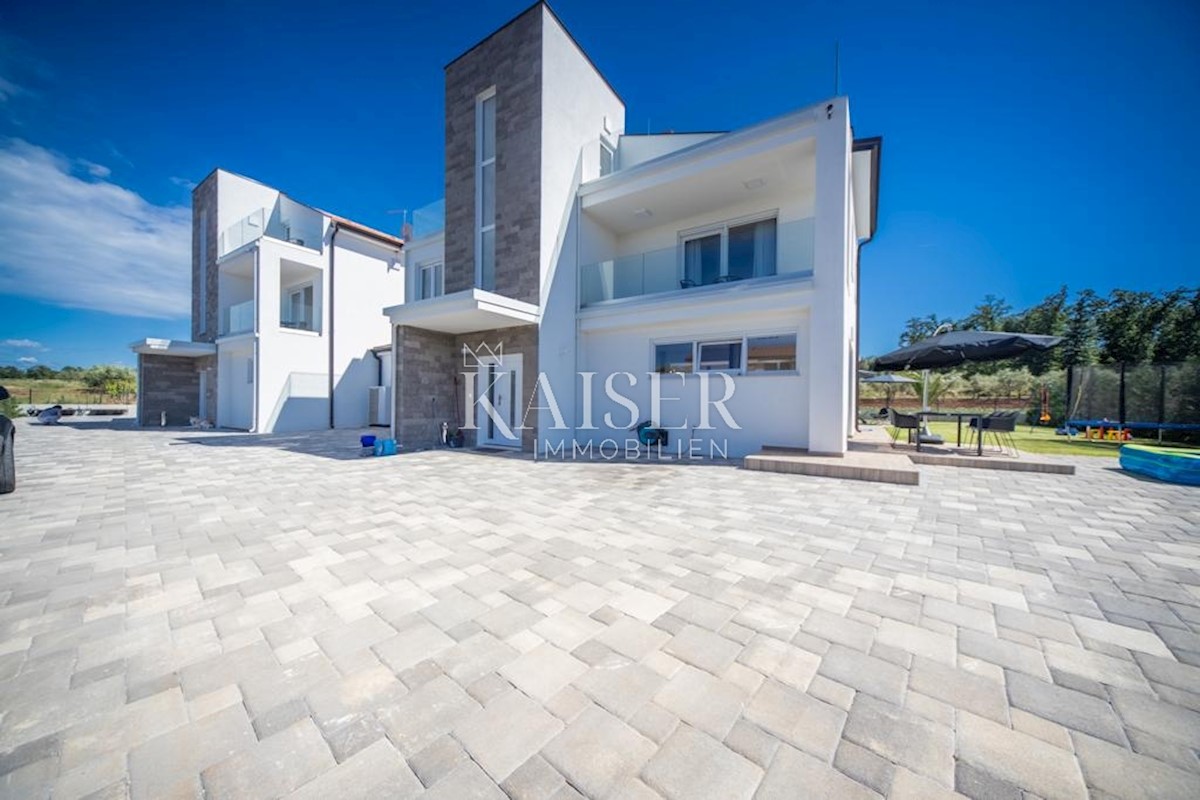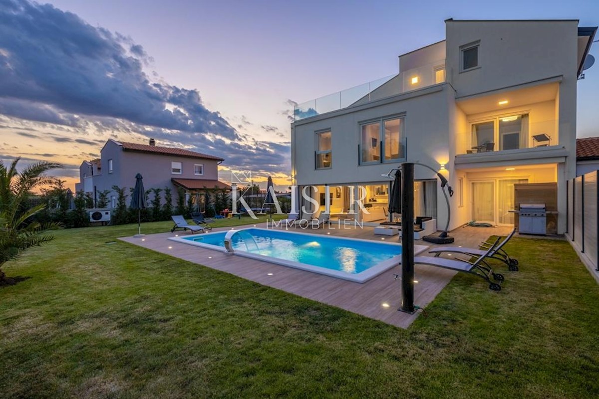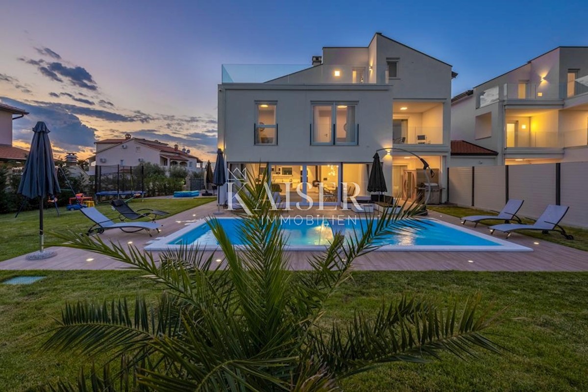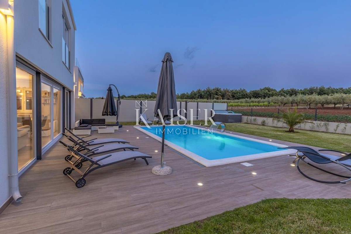 Kaiser Immobilien präsentiert Ihnen eine freistehende Villa mit Pool und Meerblick in der Nähe von Poreč. Das Haus besteht aus einem Erdgeschoss und zwei Etagen mit sechs Schlafzimmern, drei Badezimmern, einer Toilette, einem Wohnzimmer, einer Küche, eine
