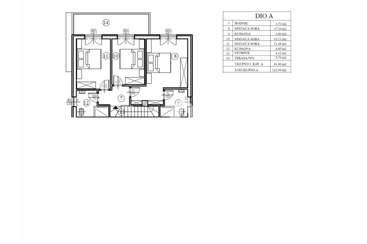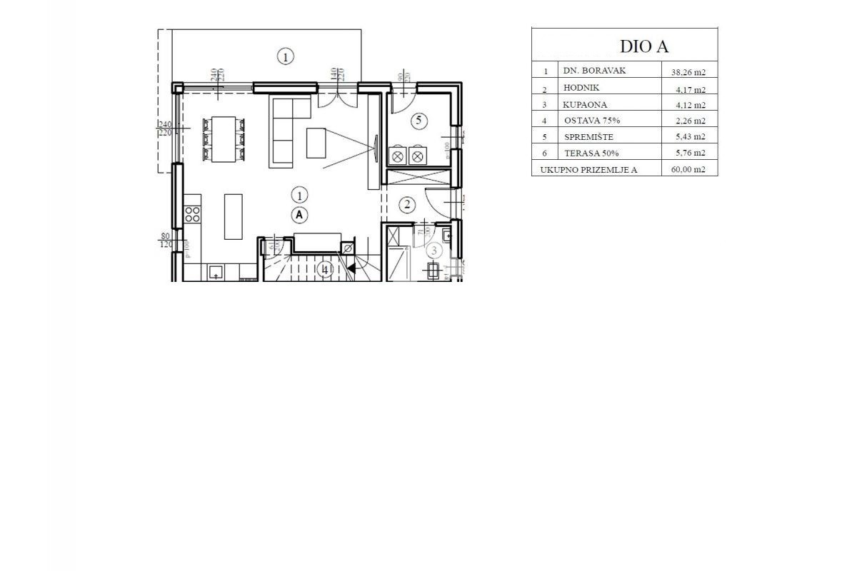 K124 Das Haus besteht aus Erdgeschoss und Obergeschoss. Im Erdgeschoss gibt es einen Flur, ein Badezimmer, eine Küche mit Esszimmer und Wohnzimmer, einen Abstellraum, einen Abstellraum und eine großzügige Terrasse, die teilweise überdacht ist und mit der