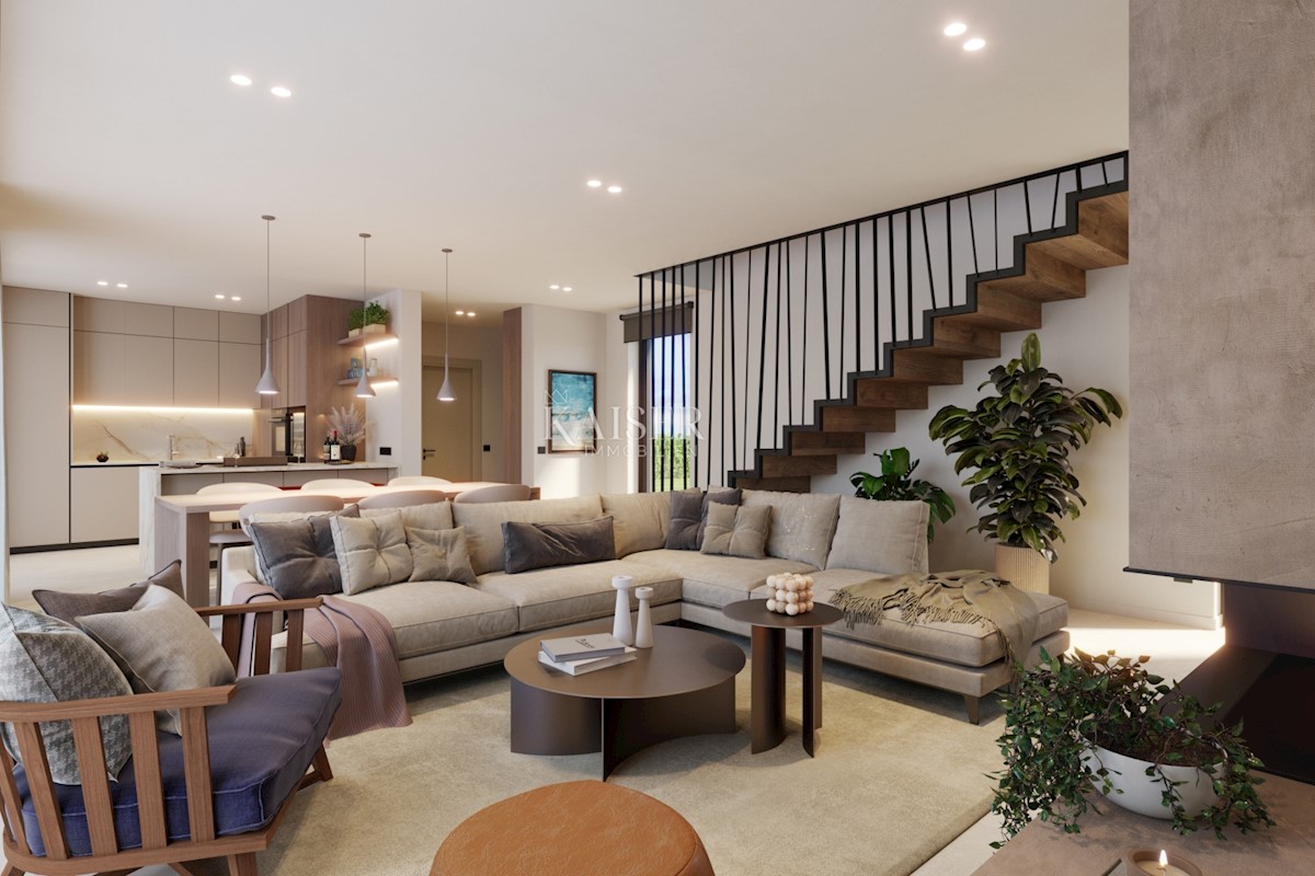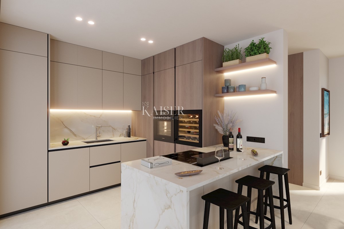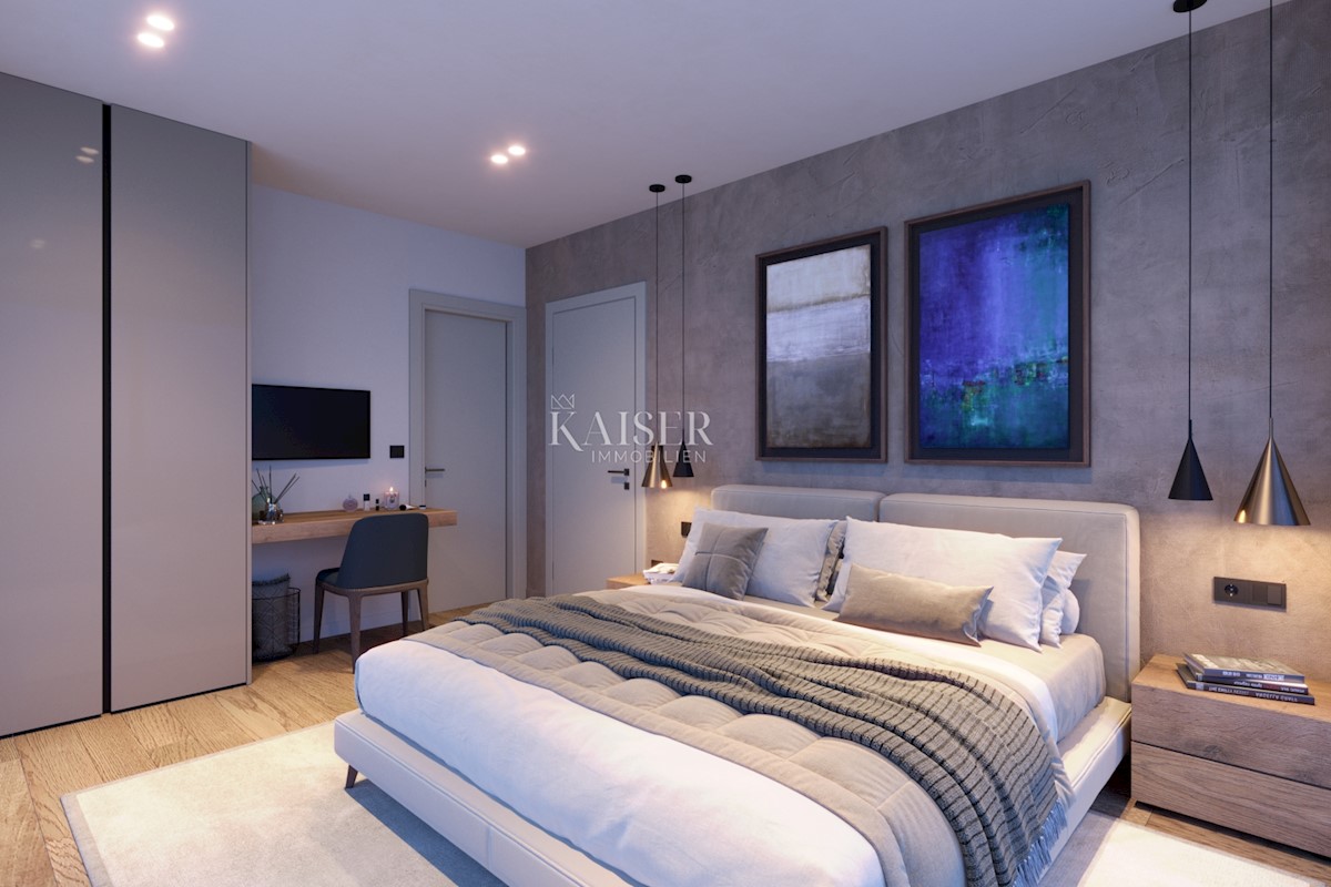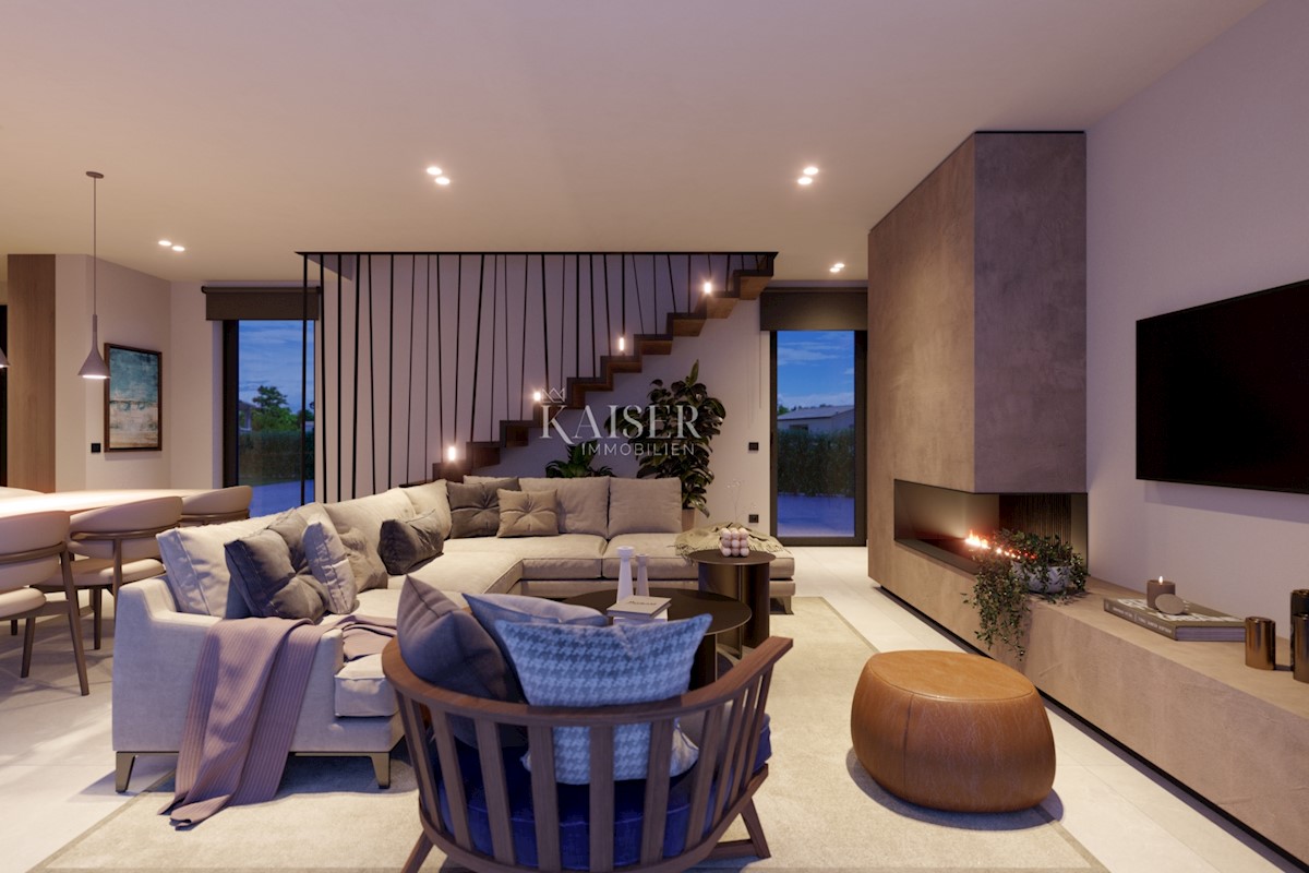 Kaiser Immobilien bietet eine moderne Villa mit Meerblick zum Verkauf an. Die Villa ist als eine Hälfte eines Doppelhauses konzipiert und befindet sich auf einem eigenen eingezäunten Grundstück von 500 m². Die Gesamtfläche beträgt 208 m2 Nettowohnfläche.