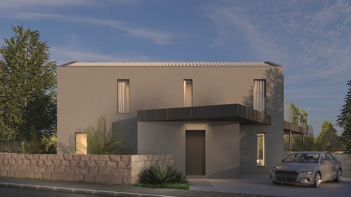 Umgebung von St. Lovreč, ca. 12 km von Vrsar und dem Meer entfernt, ein freistehendes Haus mit Swimmingpool in einem neuen Gebäude mit 134 m2 Nettofläche auf zwei Etagen - Erdgeschoss: Flur, Wohnzimmer, Küche und Esszimmer, Toilette, Abstellraum und überd