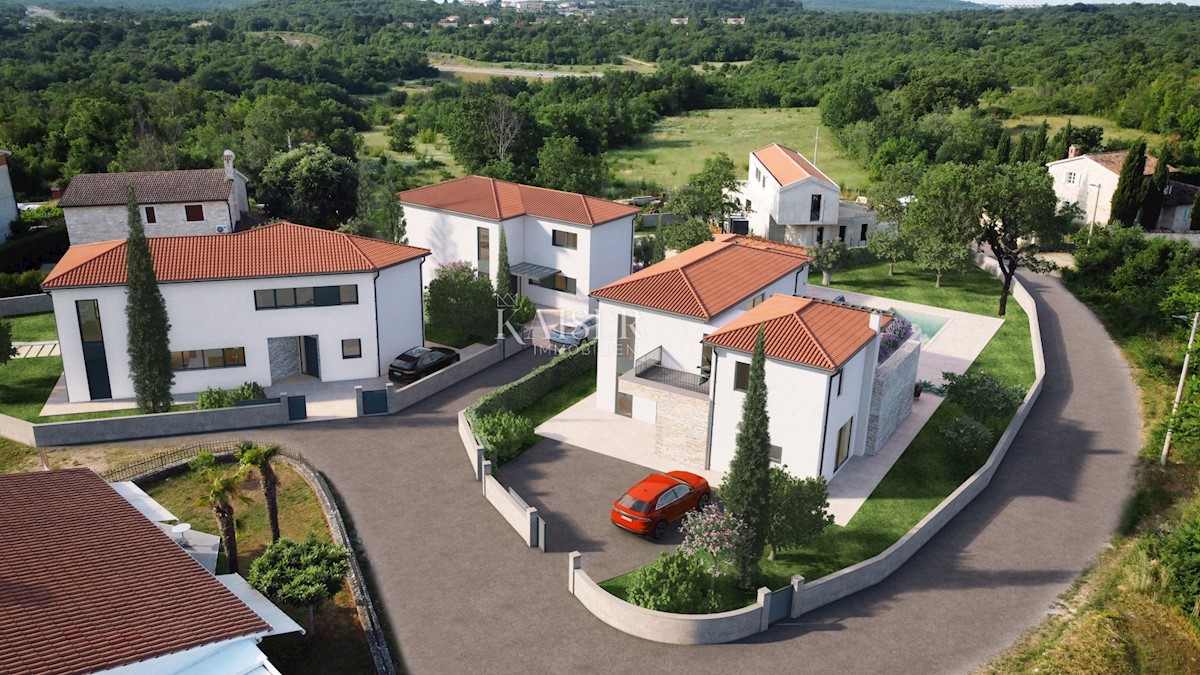 Kaiser Immobilien präsentiert eine neue moderne Villa in der Nähe von Poreč. Die Villa befindet sich in einer neuen Siedlung aus drei ähnlichen Villen, nur 11 km von der Stadt Poreč und den ersten Stränden entfernt. Seine Lage ist eine sehr friedliche aut