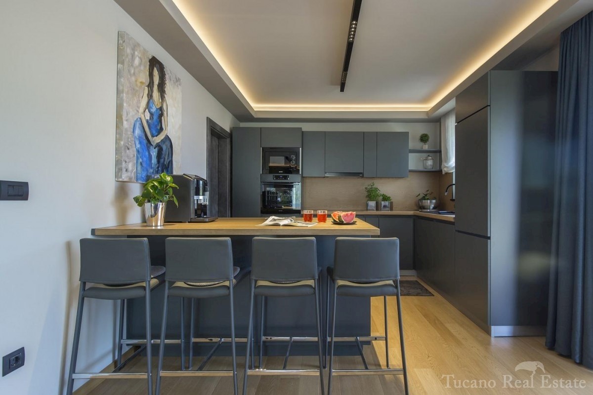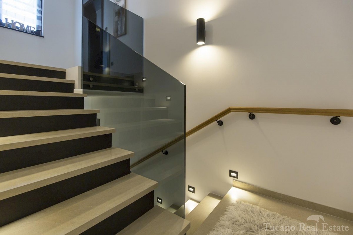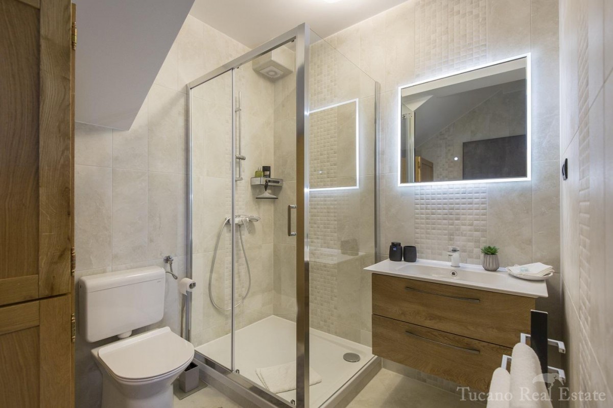 Zum Verkauf steht diese wunderschön eingerichtete Doppelhaushälfte in der Nähe der Stadt Poreč. Das Haus liegt nur 3 km vom Meer und schönen Stränden entfernt. Die Wohnfläche dieser Immobilie beträgt 158m2. Die Fläche des angelegten Gartens beträgt 550 m2