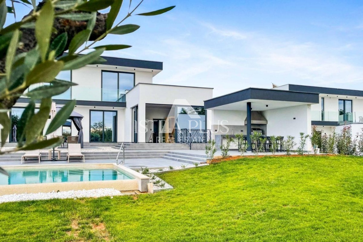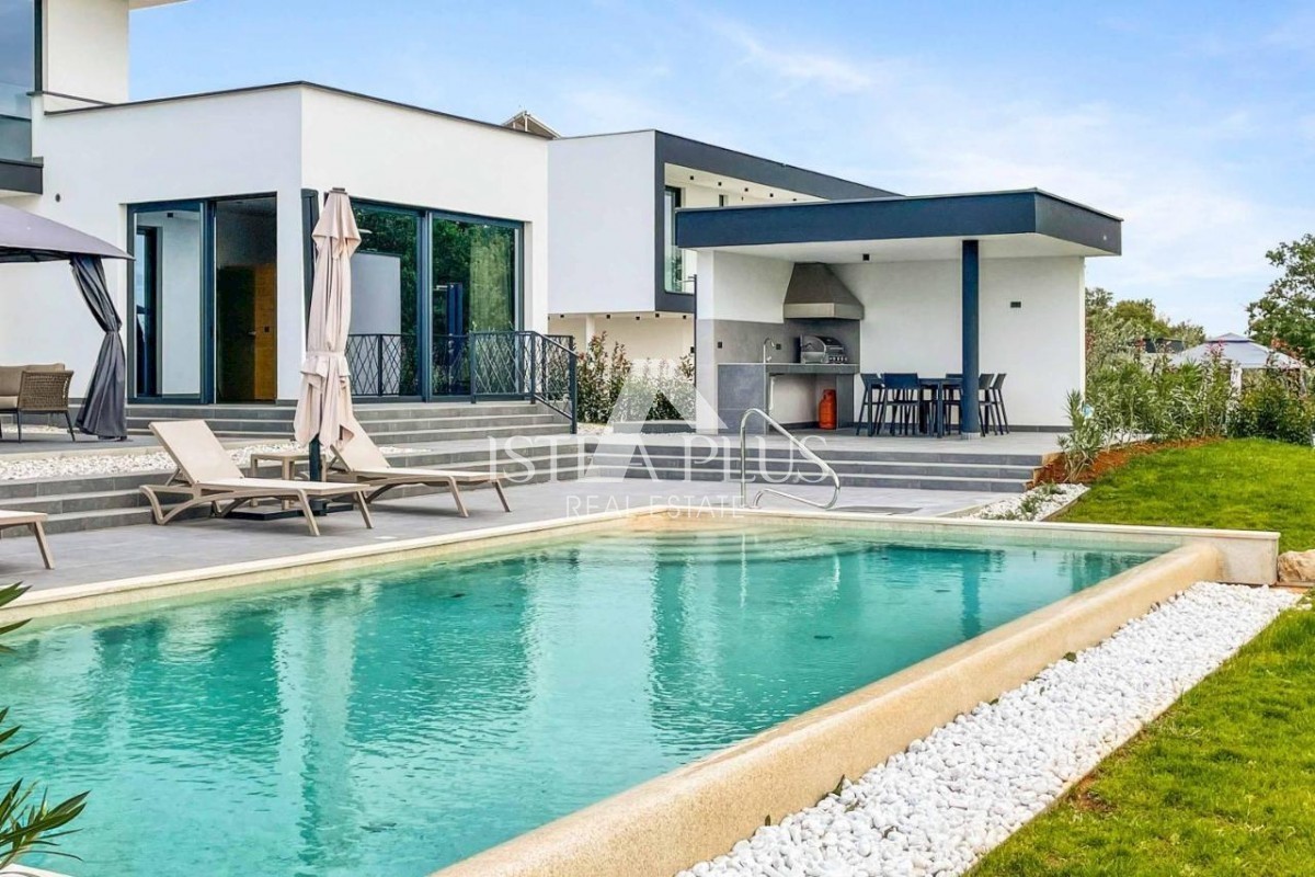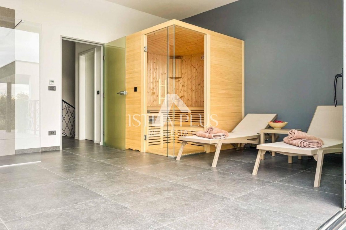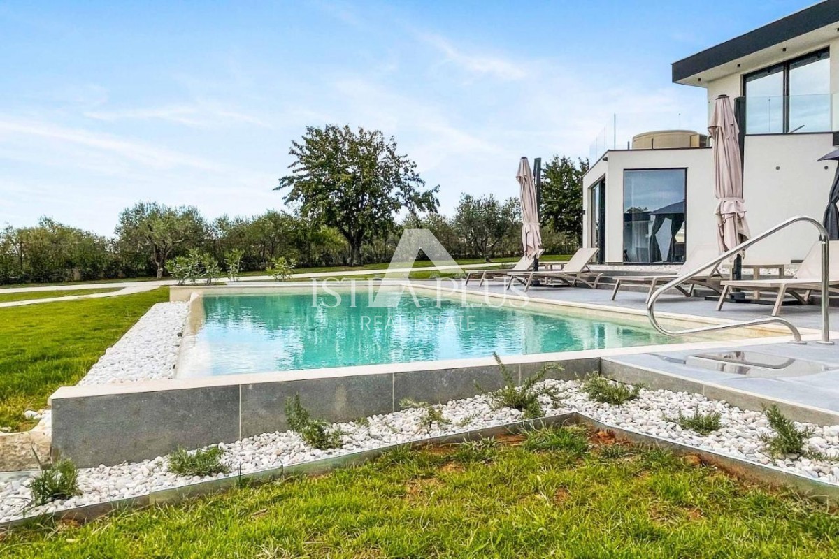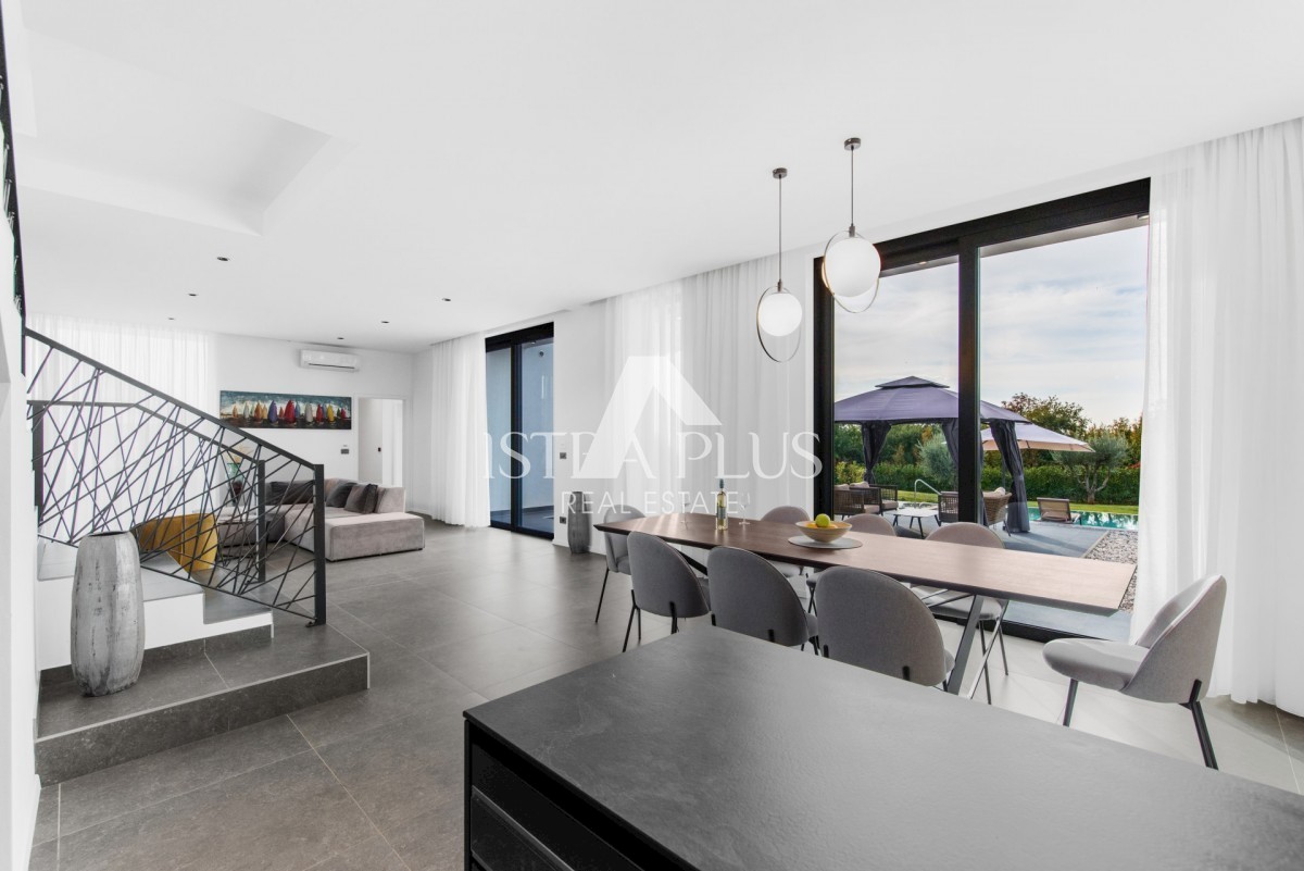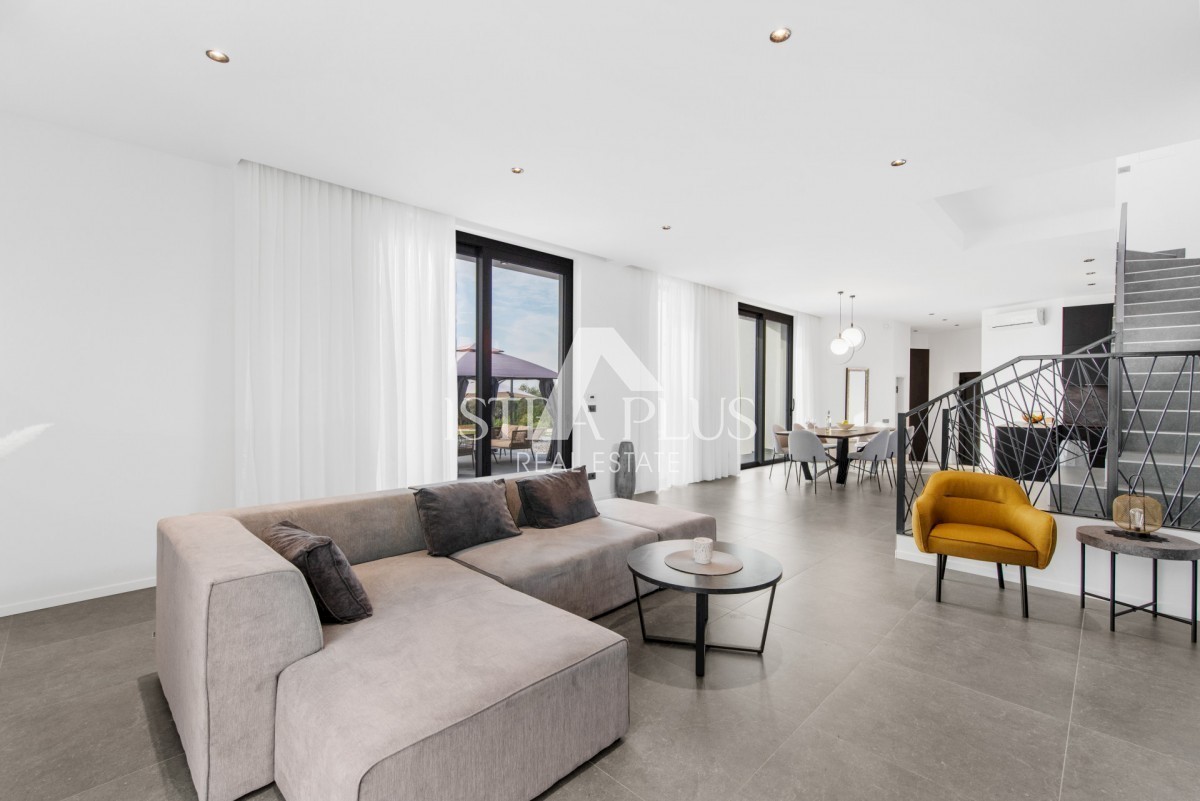 K178 Eine moderne Luxusvilla mit wunderschönem Design in ruhiger Umgebung, 10 km von Poreč entfernt. Die Villa erstreckt sich über drei Etagen mit einer Gesamtfläche von 306 m2 Wohnfläche und liegt auf einem Grundstück von 1753 m2. Im Erdgeschoss gibt es