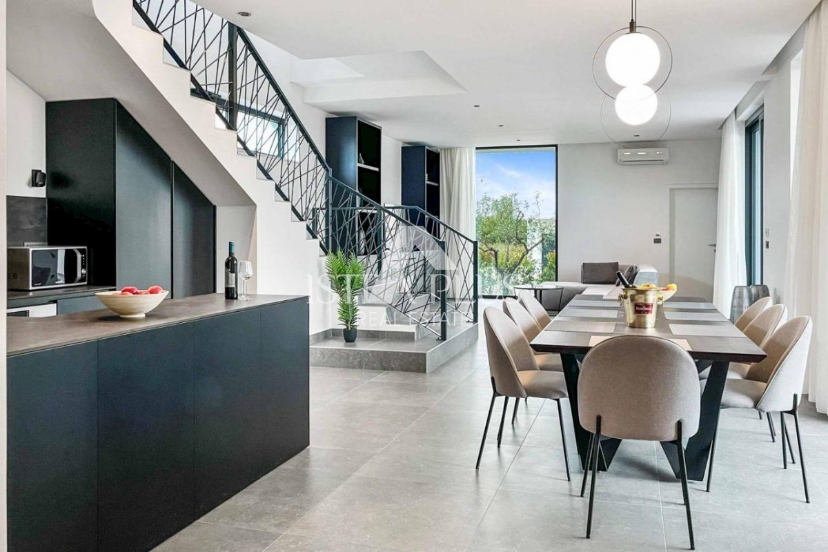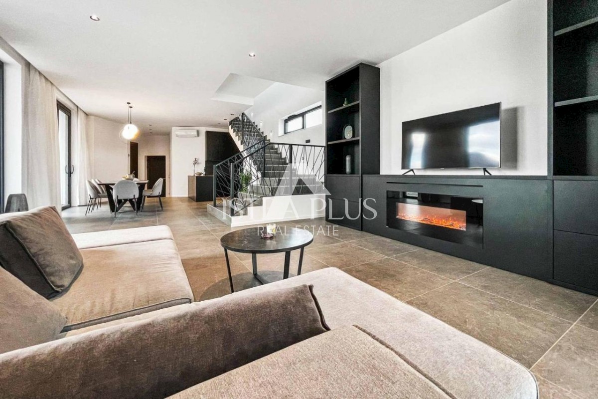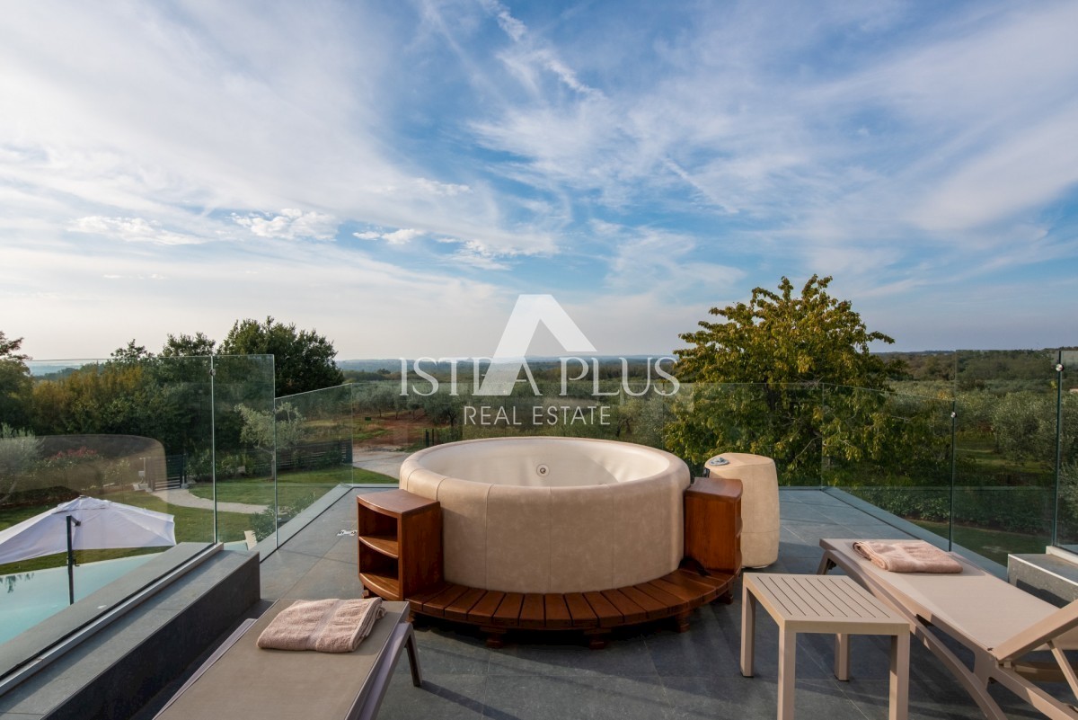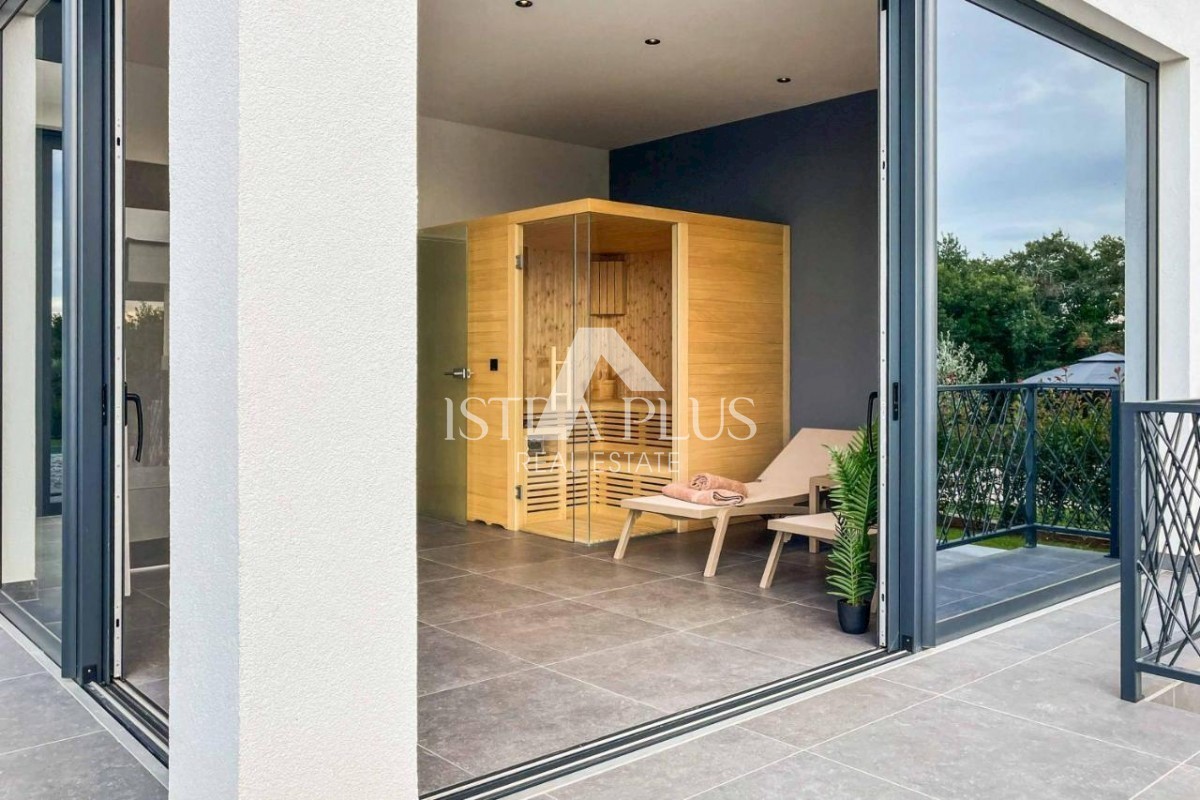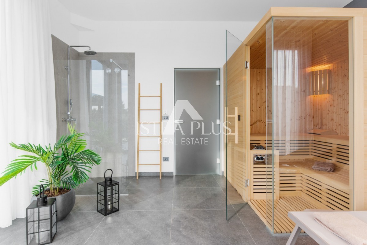 K178 Eine moderne Luxusvilla mit wunderschönem Design in ruhiger Umgebung, 10 km von Poreč entfernt. Die Villa erstreckt sich über drei Etagen mit einer Gesamtfläche von 306 m2 Wohnfläche und liegt auf einem Grundstück von 1753 m2. Im Erdgeschoss gibt es