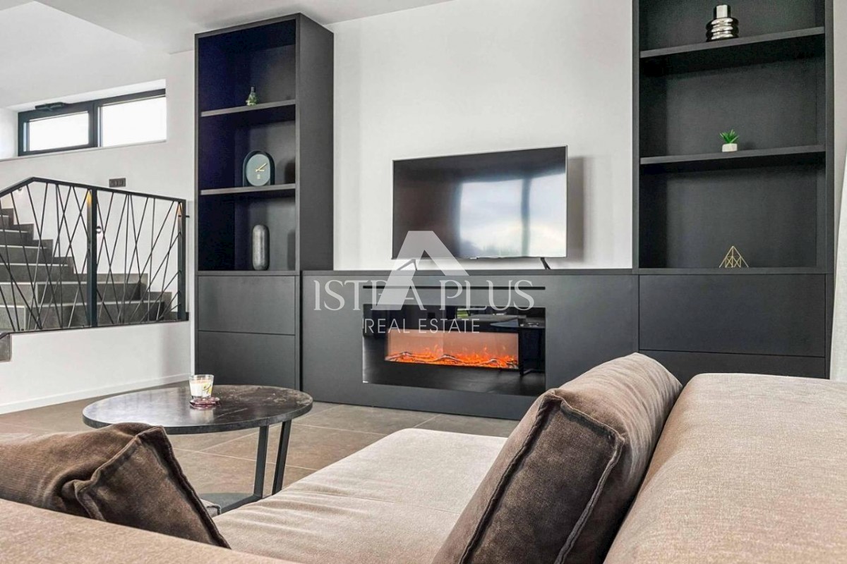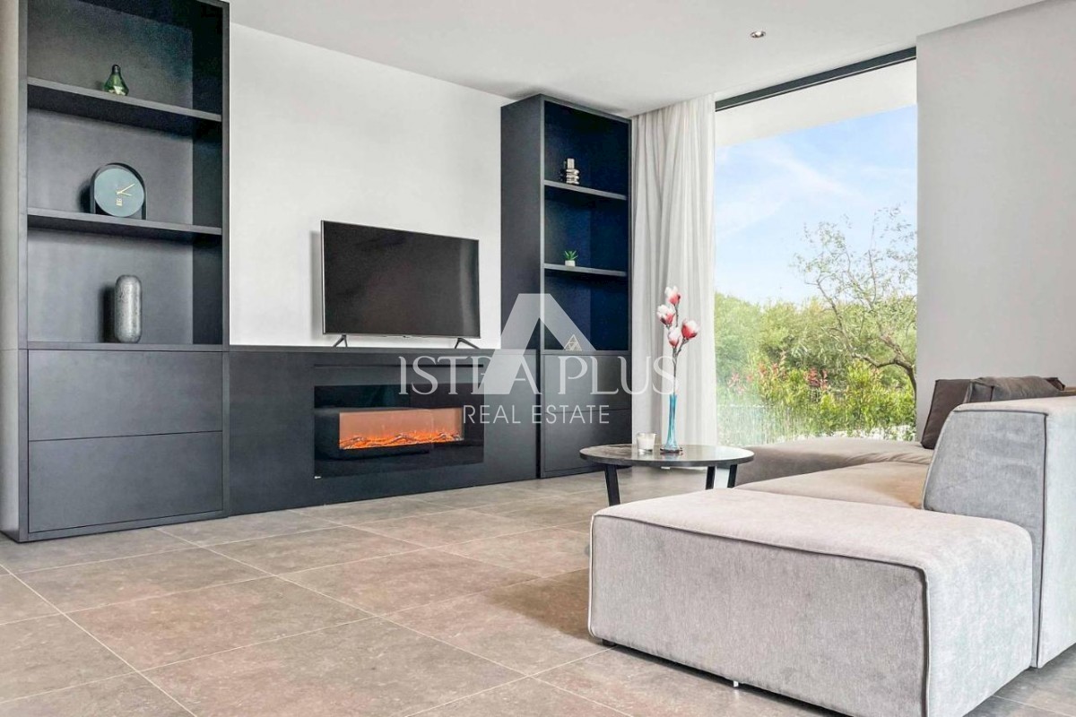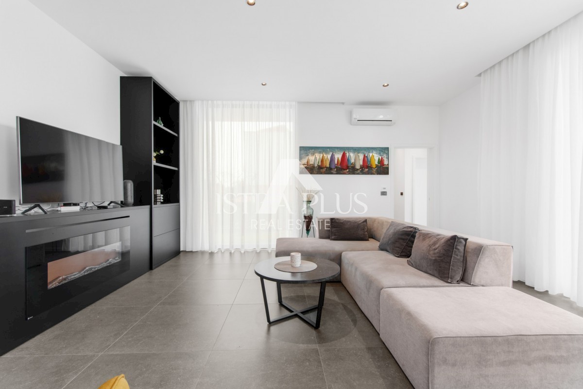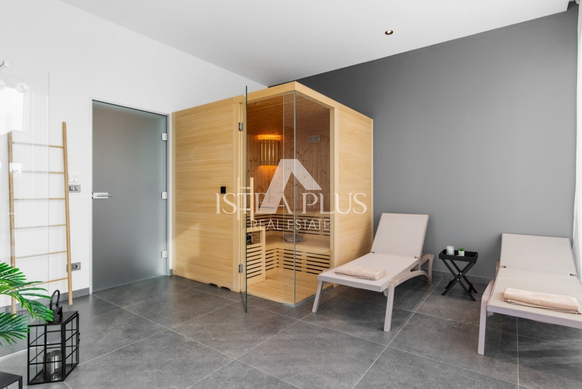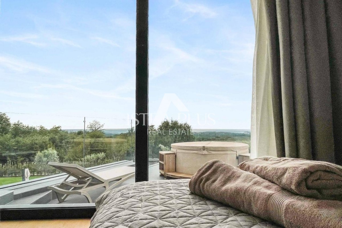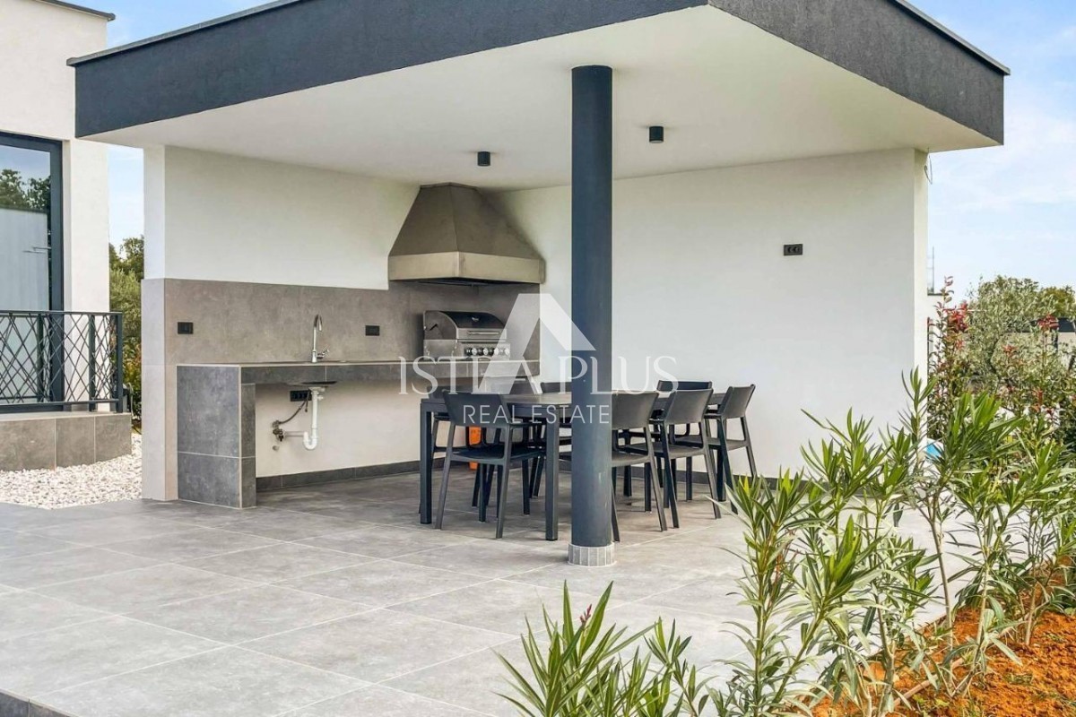 K178 Eine moderne Luxusvilla mit wunderschönem Design in ruhiger Umgebung, 10 km von Poreč entfernt. Die Villa erstreckt sich über drei Etagen mit einer Gesamtfläche von 306 m2 Wohnfläche und liegt auf einem Grundstück von 1753 m2. Im Erdgeschoss gibt es