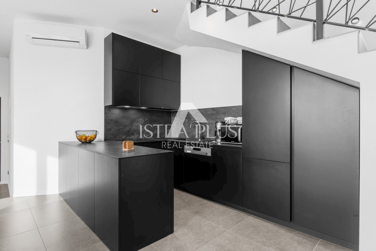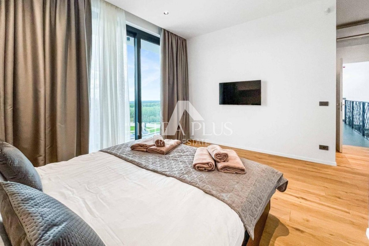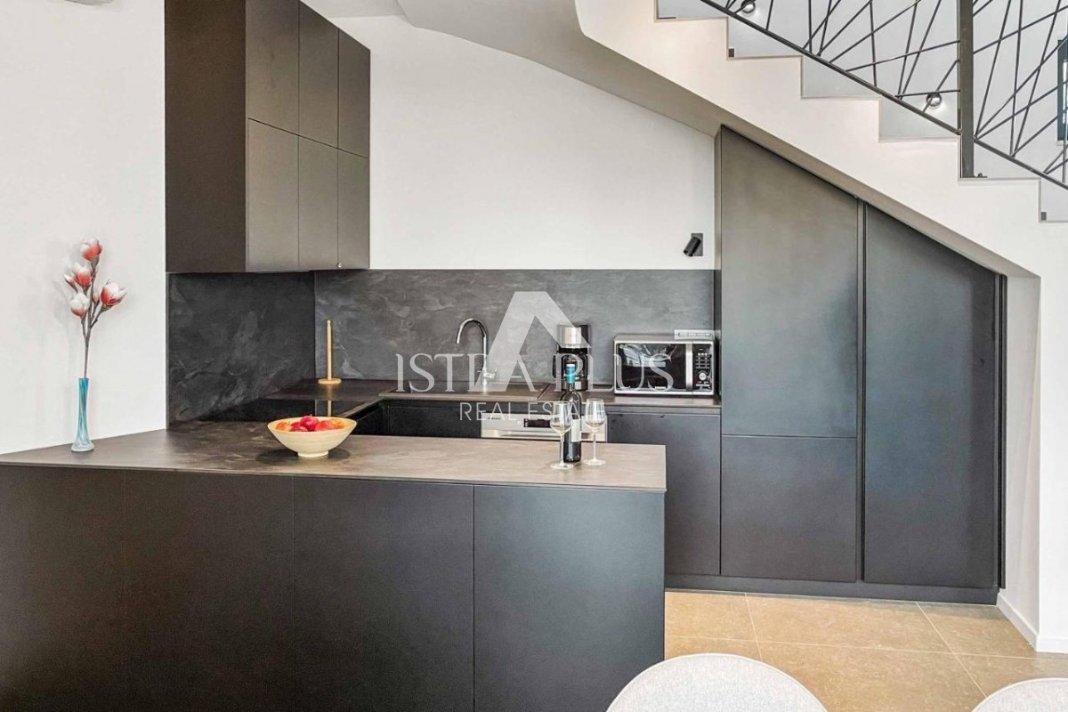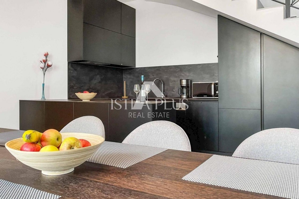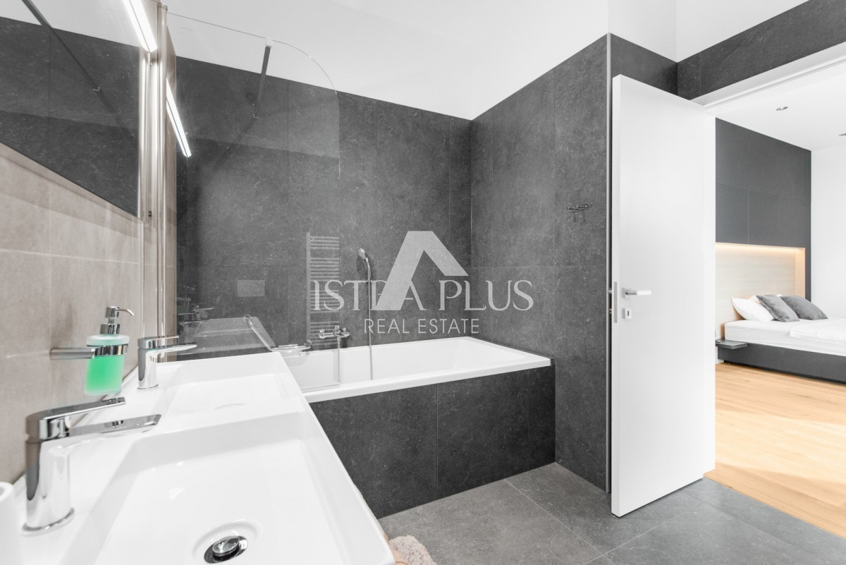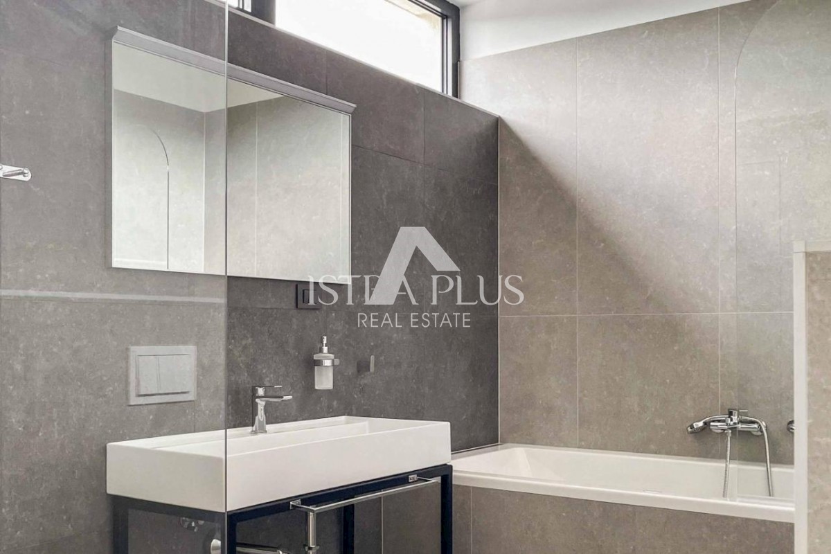 K178 Eine moderne Luxusvilla mit wunderschönem Design in ruhiger Umgebung, 10 km von Poreč entfernt. Die Villa erstreckt sich über drei Etagen mit einer Gesamtfläche von 306 m2 Wohnfläche und liegt auf einem Grundstück von 1753 m2. Im Erdgeschoss gibt es