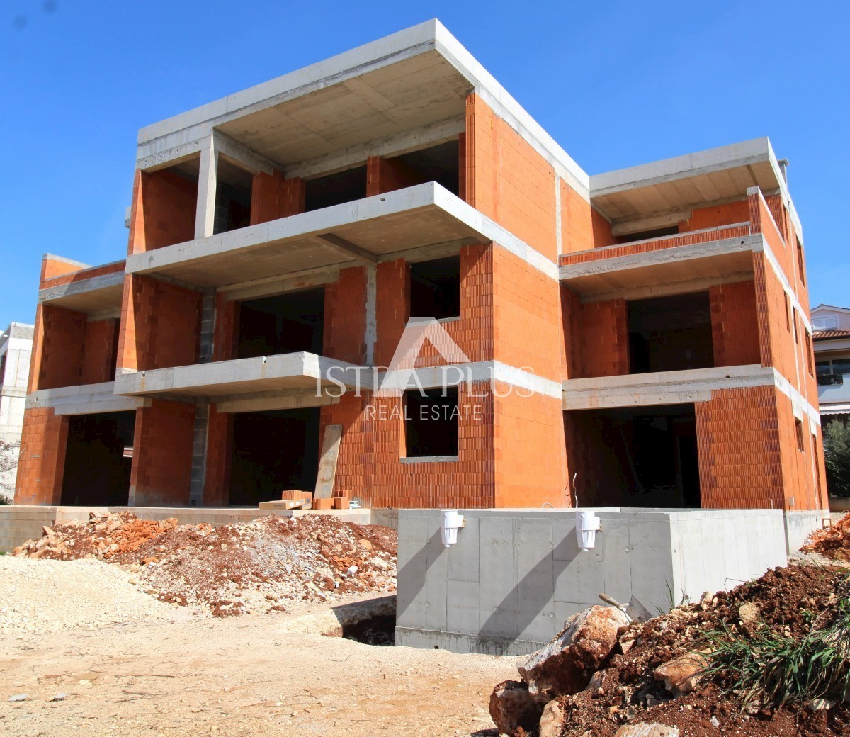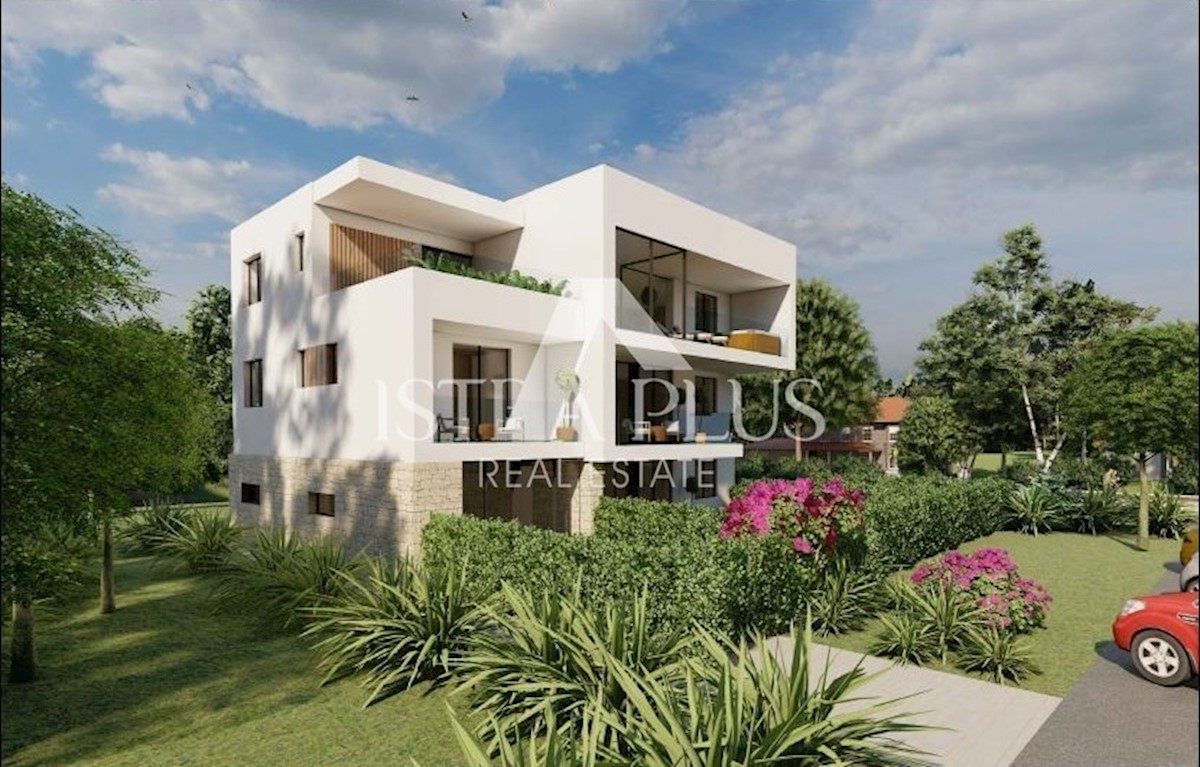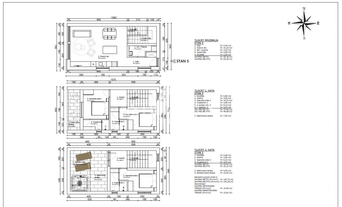 K183 Das Haus erstreckt sich über drei Etagen und verfügt über eine Gesamtnettofläche von 122,18m2 mit überdachten Terrassen. Im Erdgeschoss befinden sich ein Esszimmer, eine Küche und ein Wohnzimmer nach dem Open-Space-Konzept mit Zugang zur Terrasse und