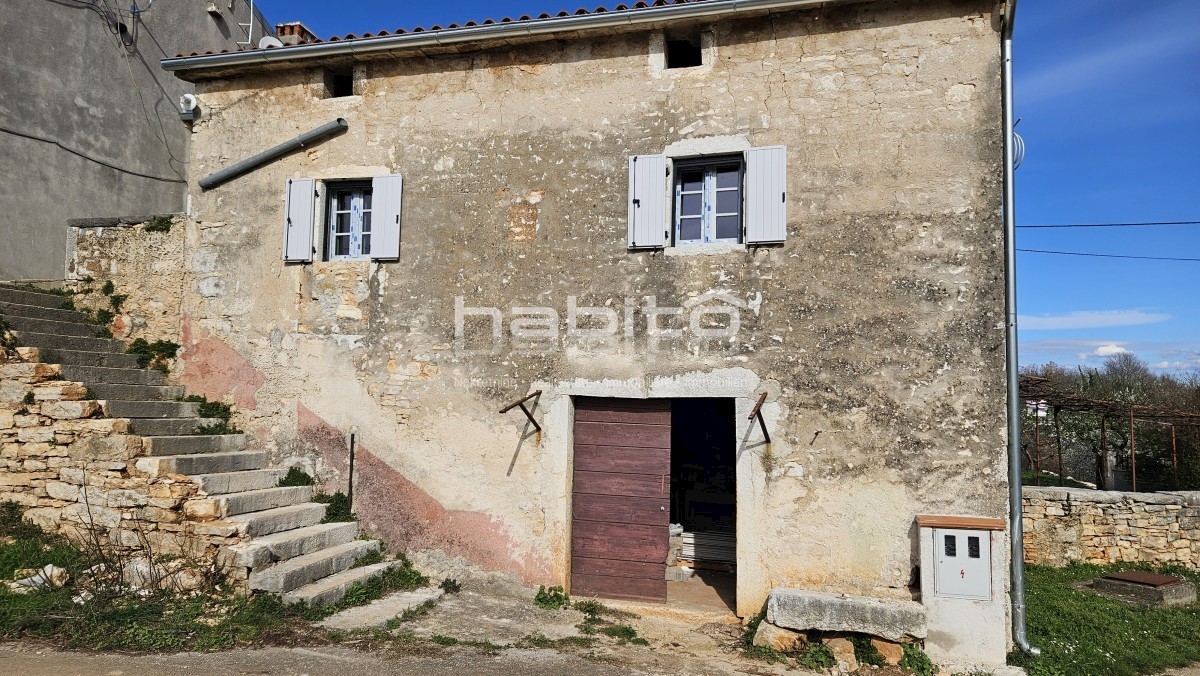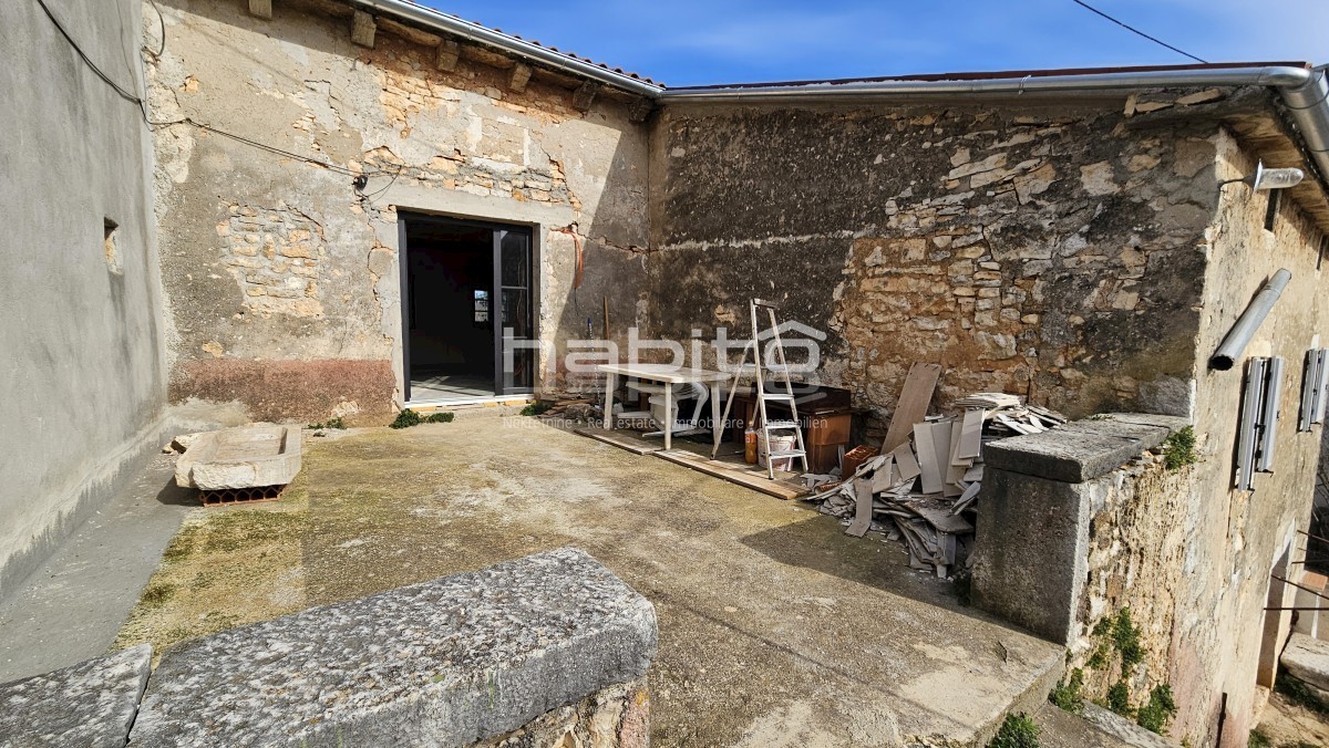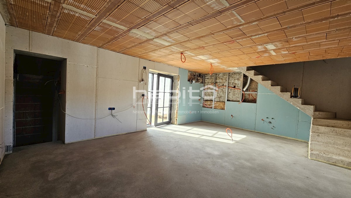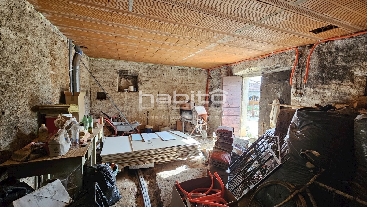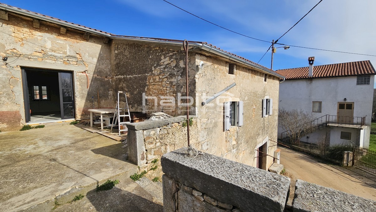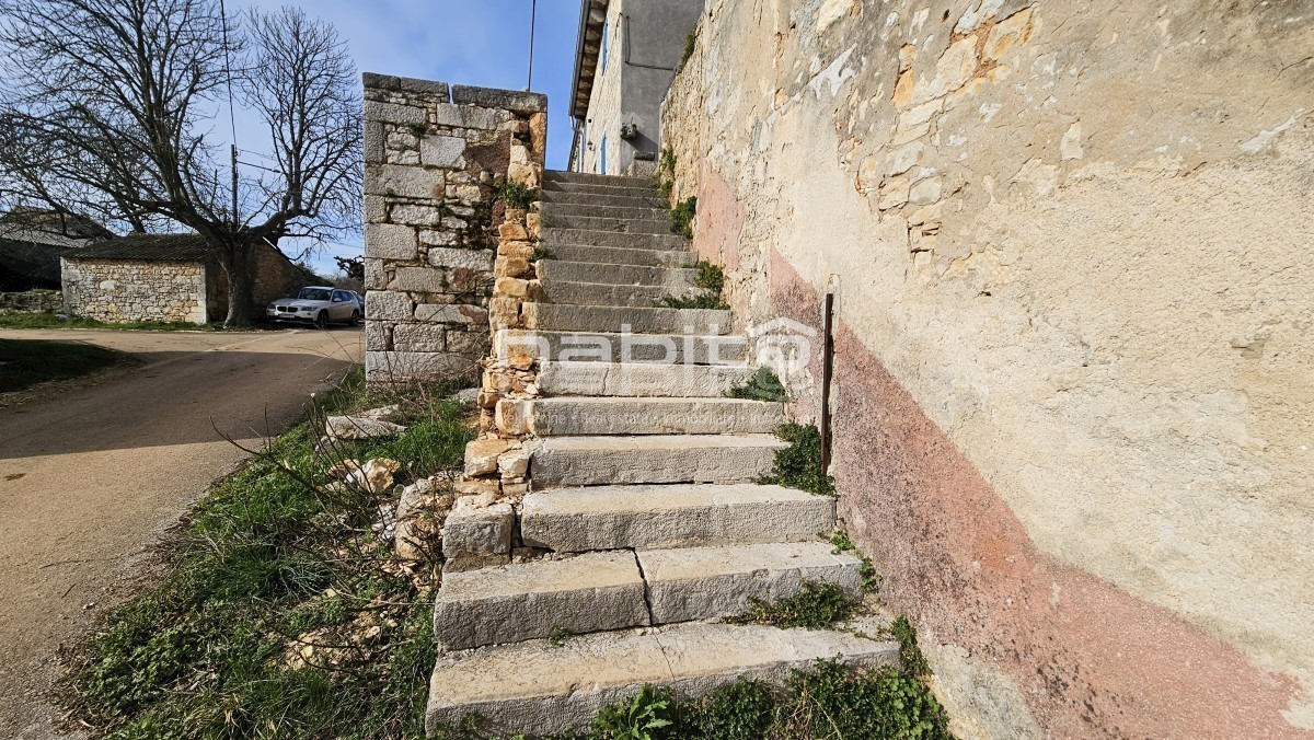 Steinhaus zum Verkauf in der Nähe von Višnjan und 15 km von Poreč entfernt Dies ist das letzte Haus in einer Reihe, das 2023 bis zur Rohbauphase renoviert wurde. Das Haus bietet 210 m2 Wohnfläche und 234 m2 Garten (mit einem Nebengebäude von ca. 35 m2 Br