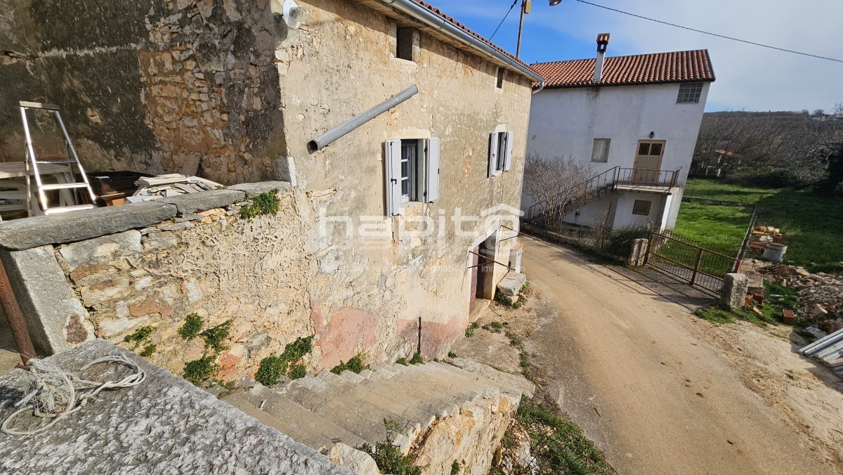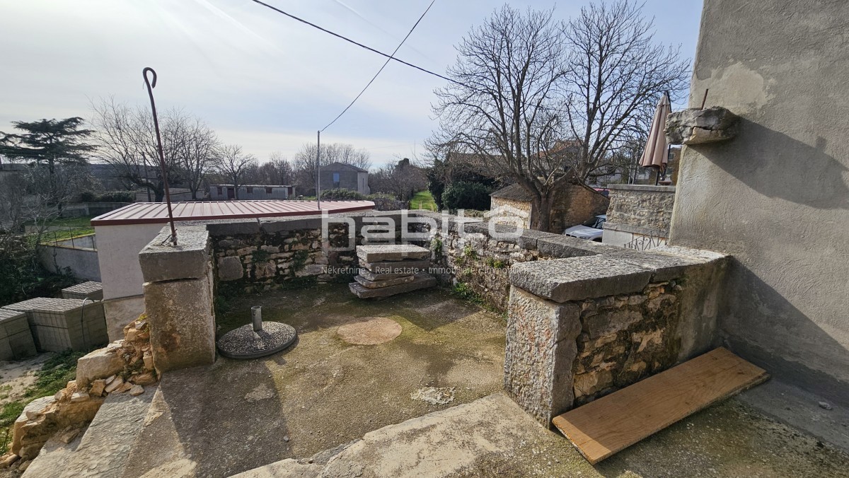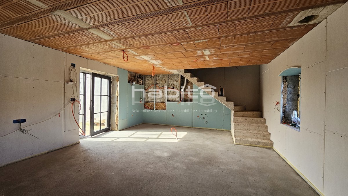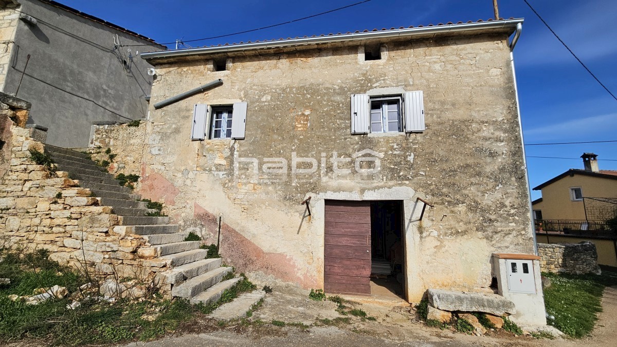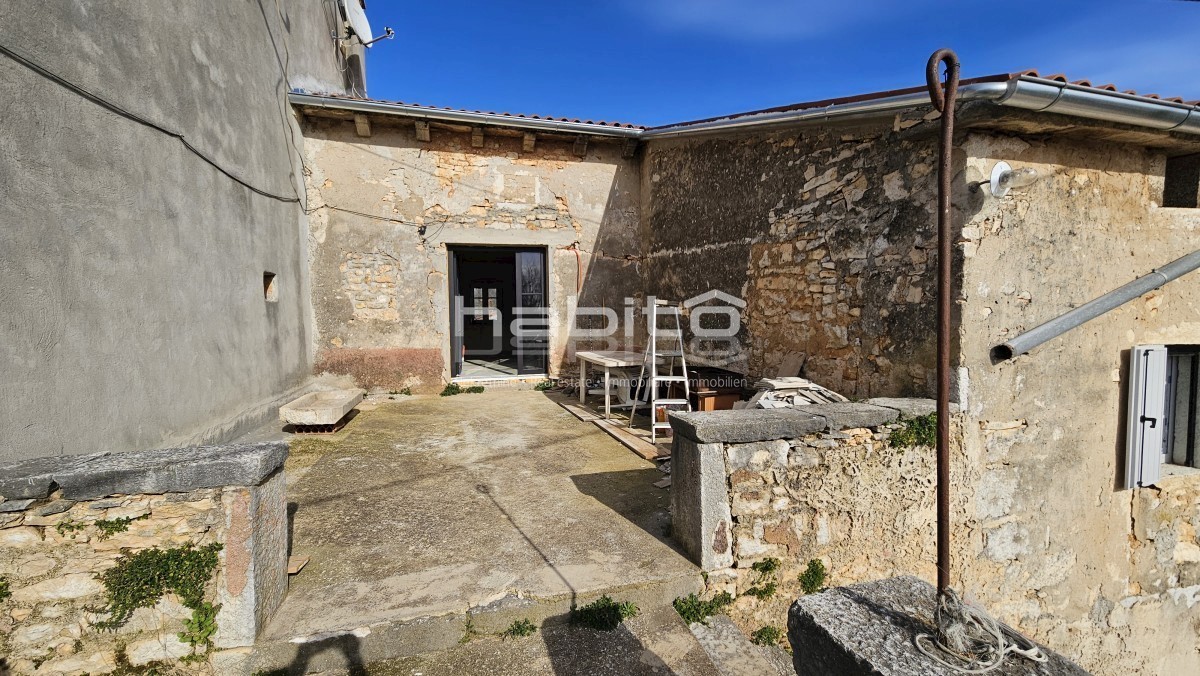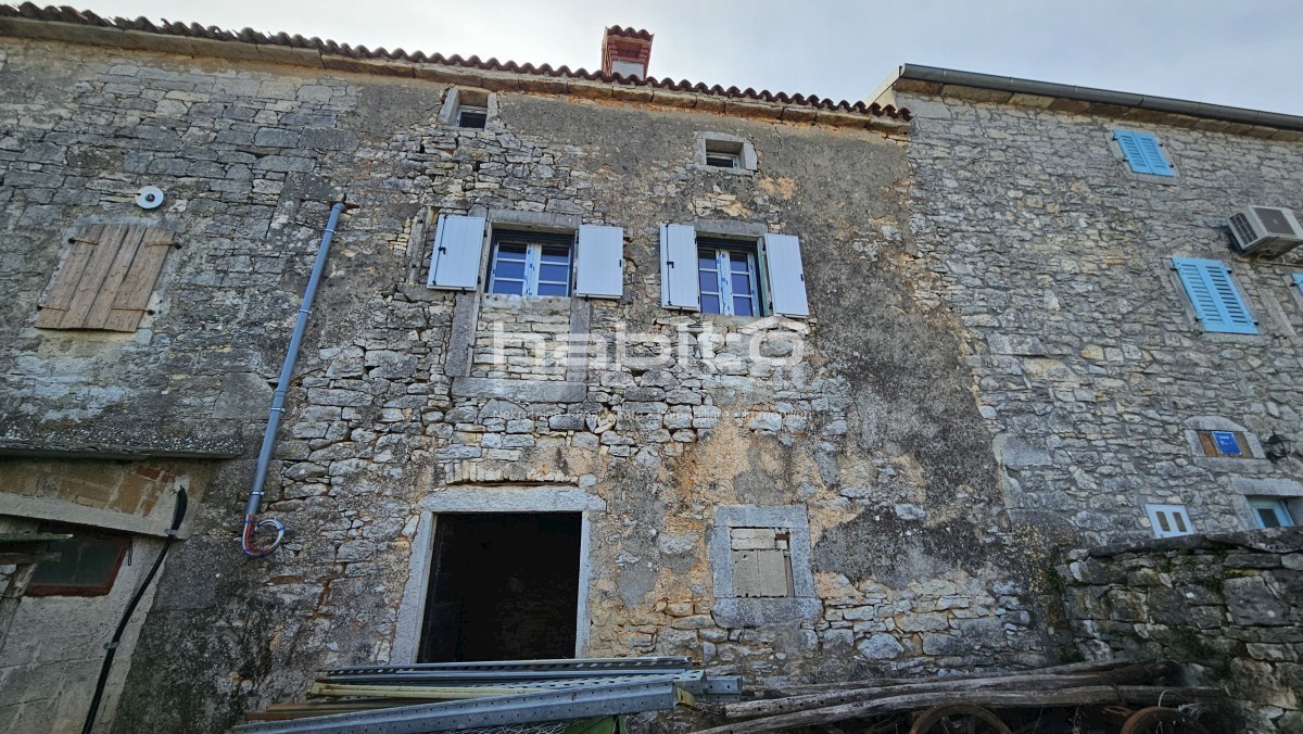 Steinhaus zum Verkauf in der Nähe von Višnjan und 15 km von Poreč entfernt Dies ist das letzte Haus in einer Reihe, das 2023 bis zur Rohbauphase renoviert wurde. Das Haus bietet 210 m2 Wohnfläche und 234 m2 Garten (mit einem Nebengebäude von ca. 35 m2 Br