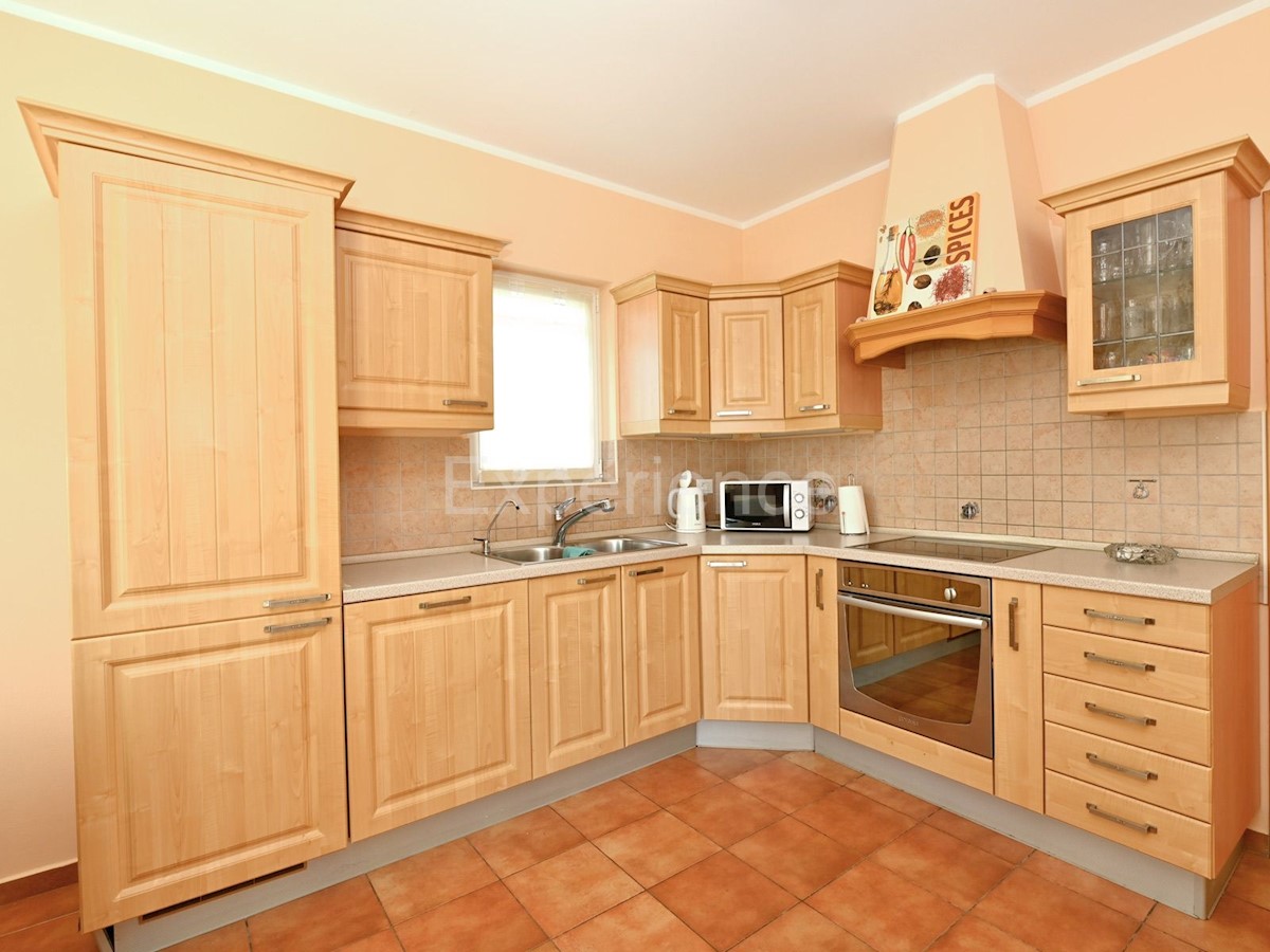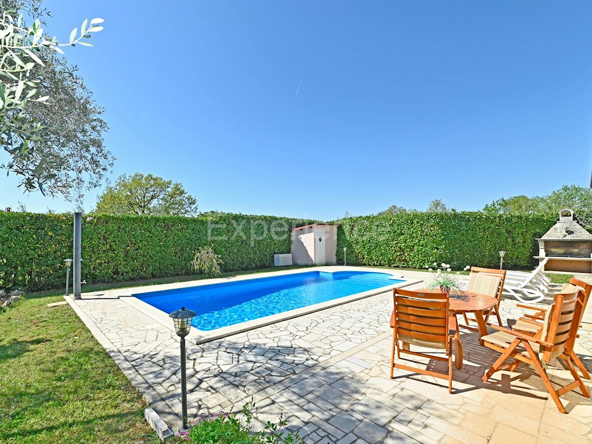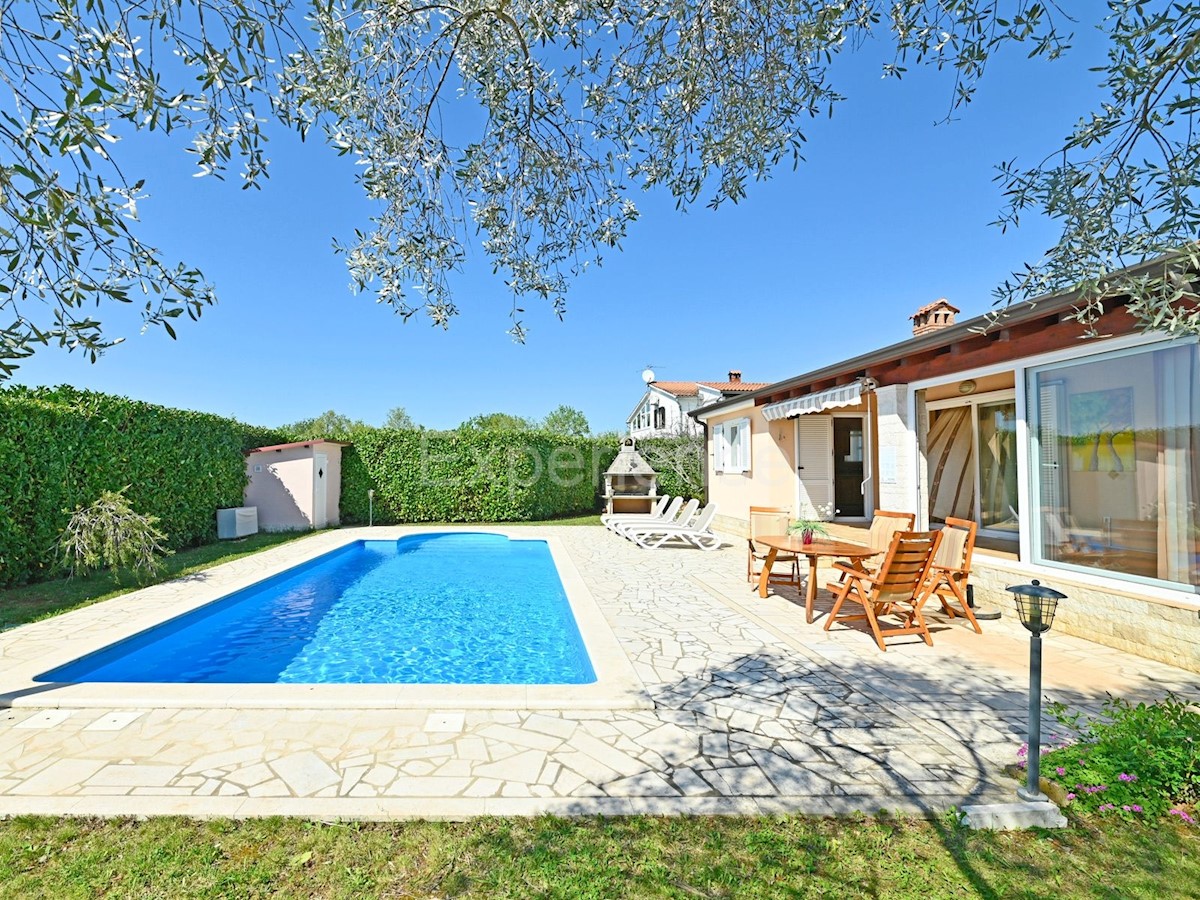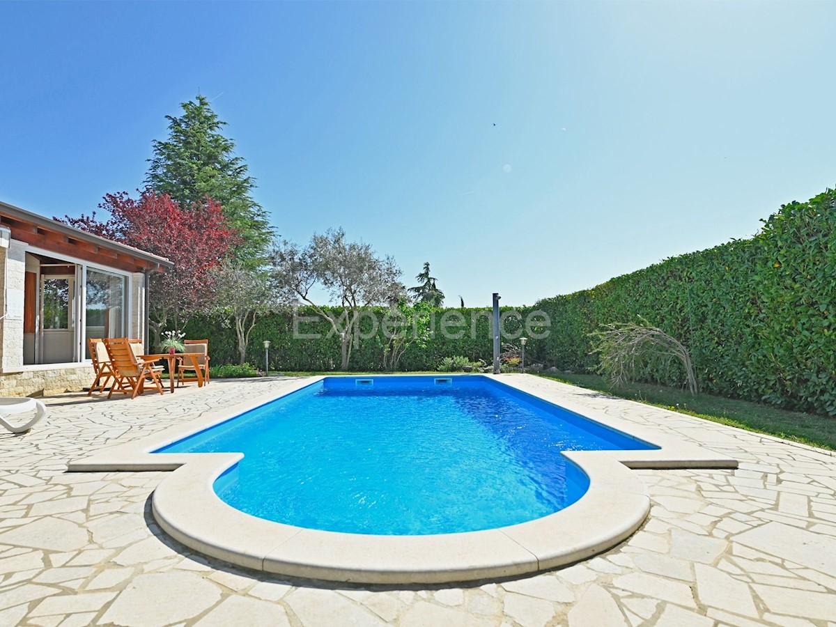In der Nähe von Poreč, in einer sehr ruhigen Umgebung, ca. 8 km von der Küste und dem Stadtzentrum entfernt steht ein einstöckiges Haus mit Swimmingpool und einer Gesamtfläche von 116 m² zum Verkauf. Das Haus wurde 2008 gebaut. Es erstreckt sich über eine