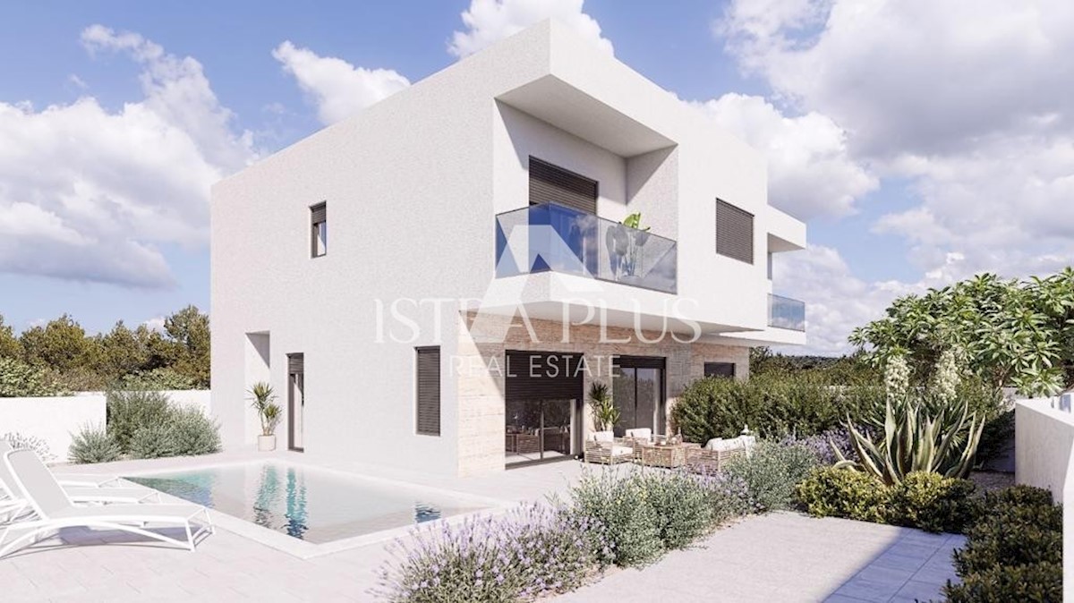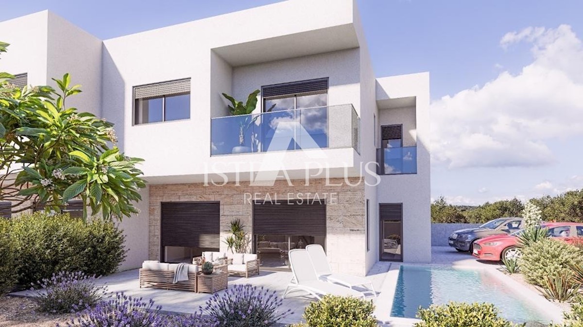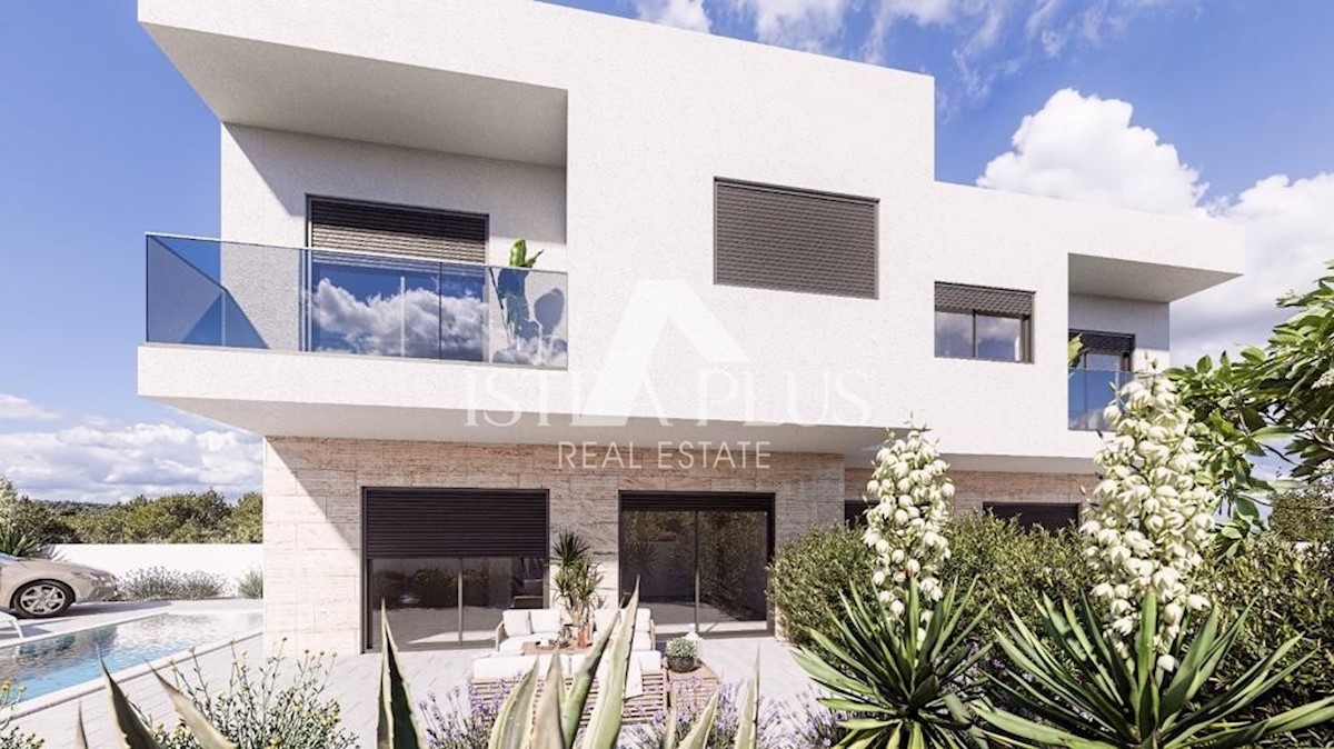K206 Doppelhaushälfte mit Pool, Whirlpool und Meerblick. Das Haus erstreckt sich über 2 Etagen und liegt auf einem Grundstück von 550m2. Im Erdgeschoss gibt es eine Eingangshalle, ein Badezimmer, einen Abstellraum, eine Küche mit Esszimmer und ein offenes