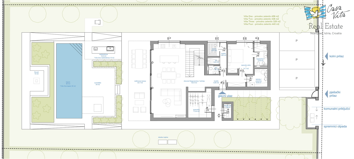 Istrien , Poreč Zum Verkauf steht ein Villenkomplex, der sich auf einer Fläche von 3730 m2 befindet. Es besteht aus 4 freistehenden, komplett möblierten und ausgestatteten Gebäuden mit Blick auf das offene Meer (Luftlinie ca. 2 Kilometer). Vier identisc