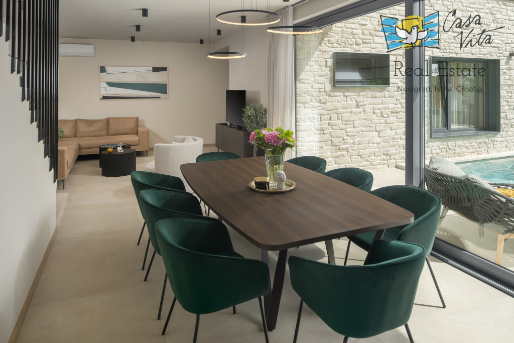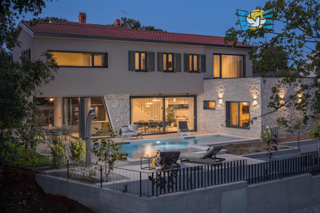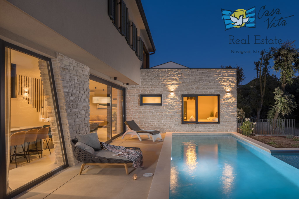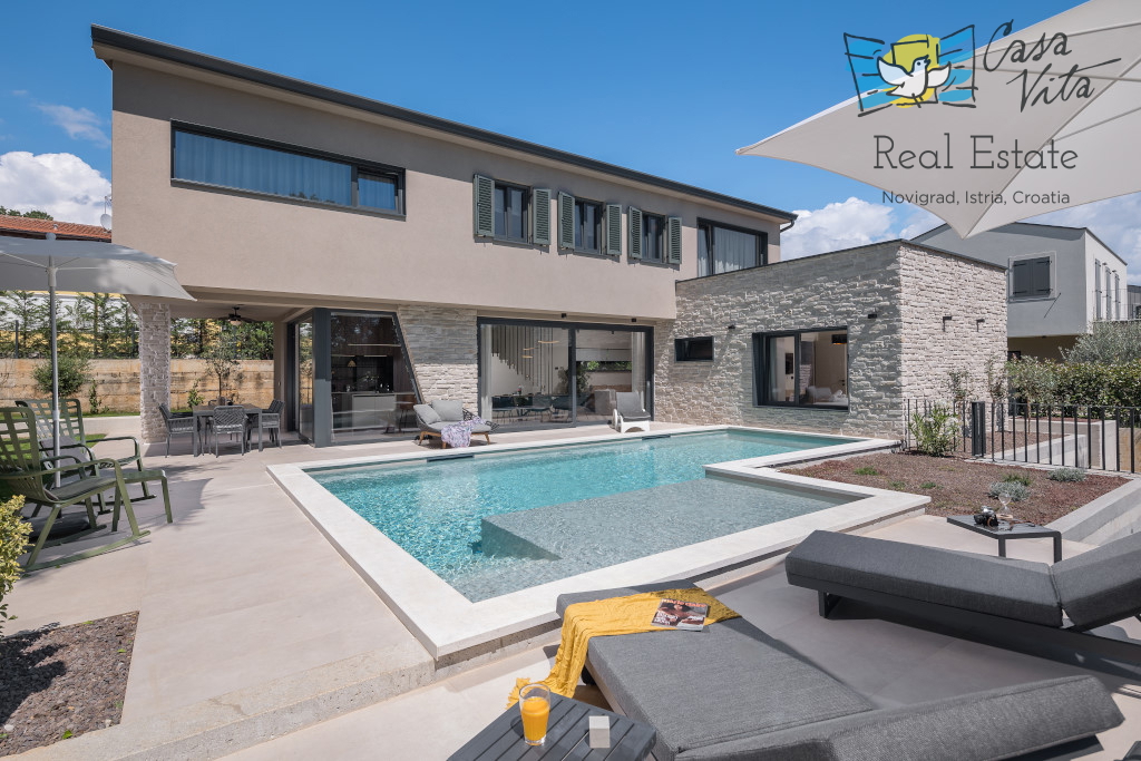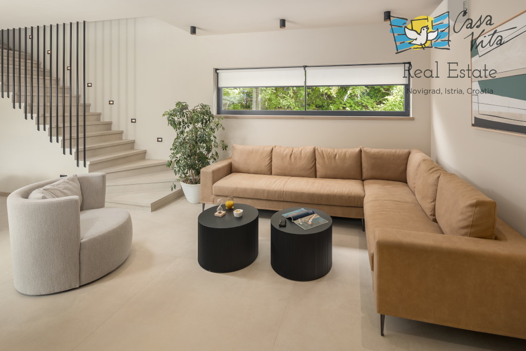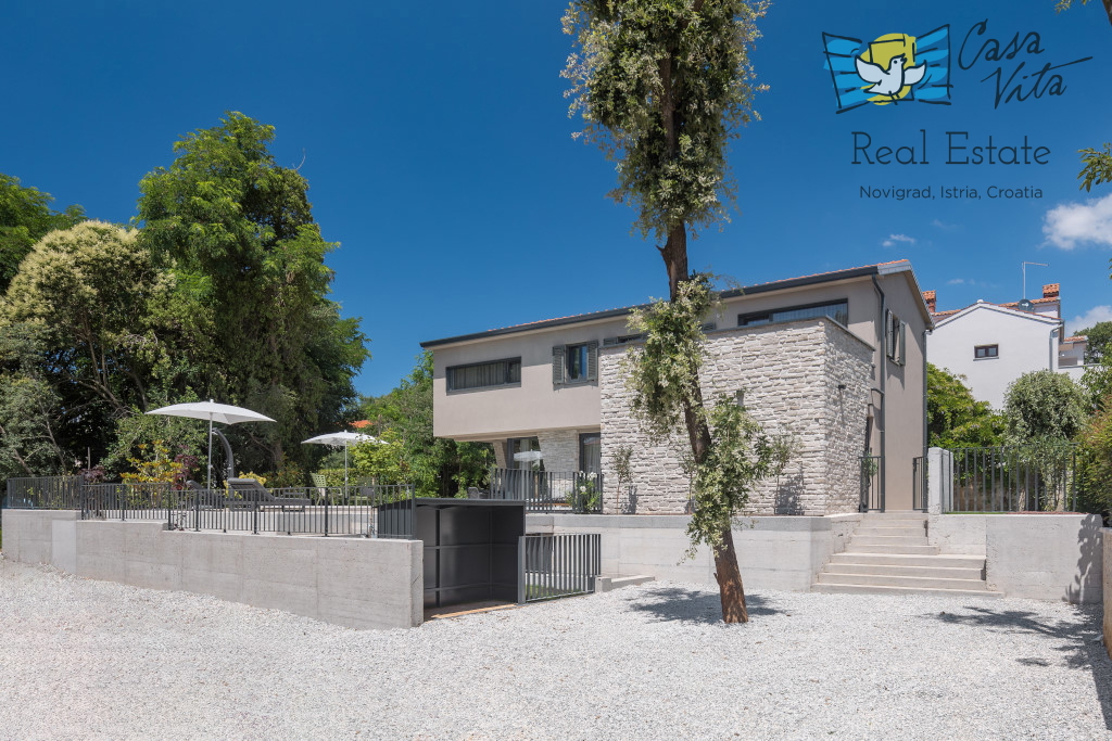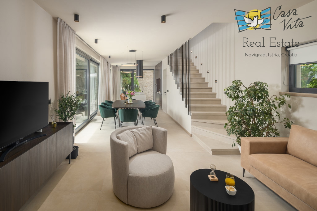 Istrien, Poreč Zum Verkauf steht eine schöne und modern eingerichtete Villa in ruhiger und gefragter Lage. Das Haus hat 189m2 und ist in zwei Etagen aufgeteilt. Im Erdgeschoss des Hauses gibt es eine Eingangshalle, die zu einem geräumigen Wohnzimmer,