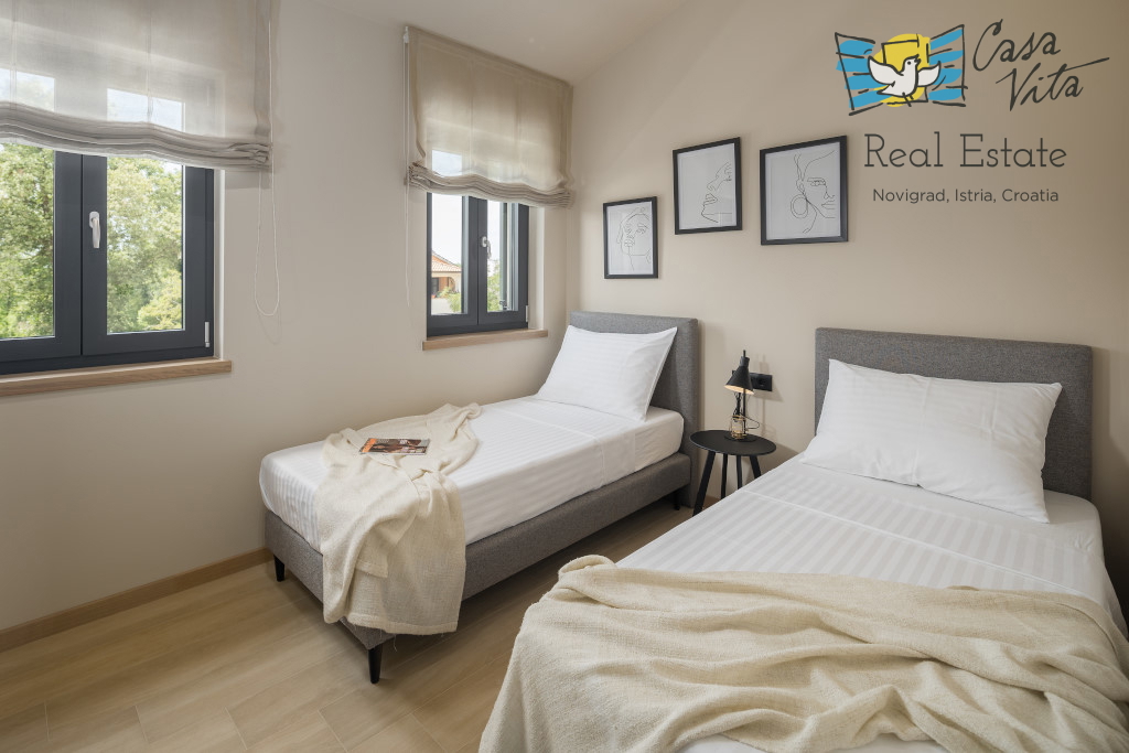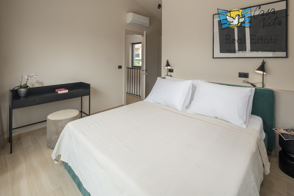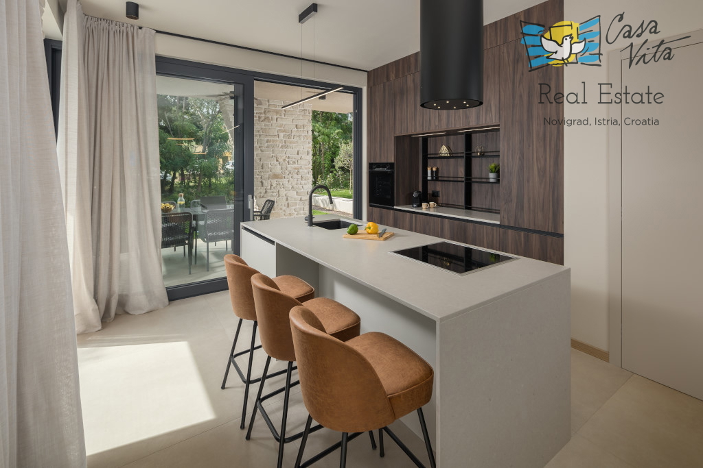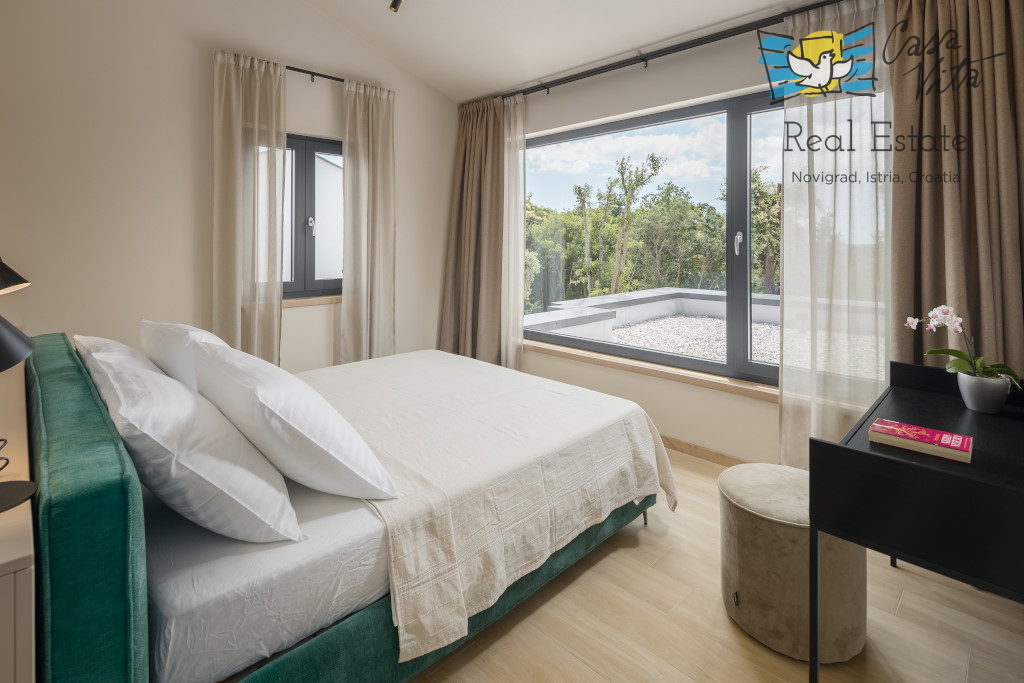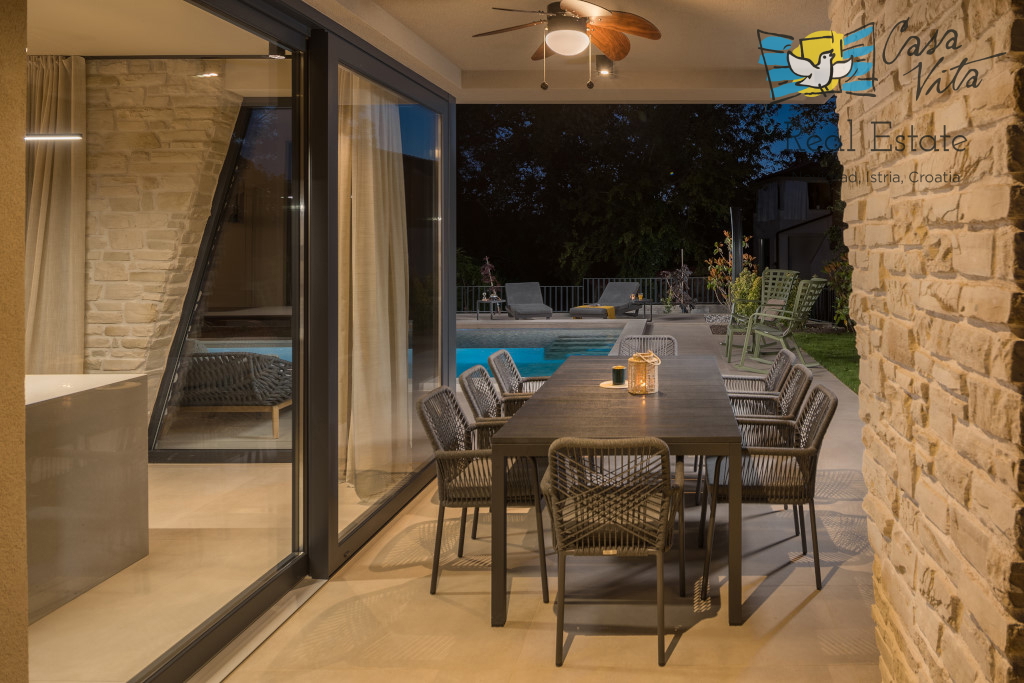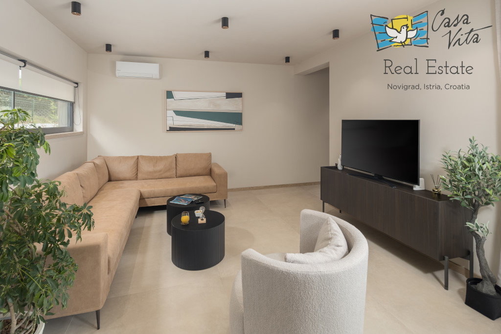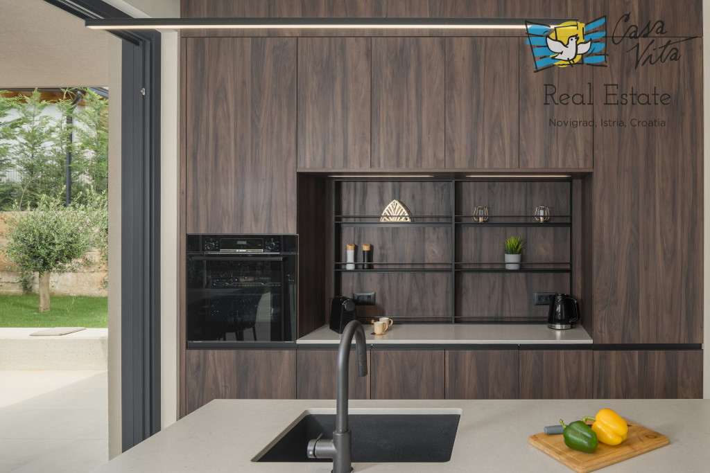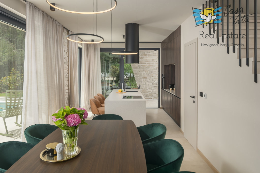 Istrien, Poreč Zum Verkauf steht eine schöne und modern eingerichtete Villa in ruhiger und gefragter Lage. Das Haus hat 189m2 und ist in zwei Etagen aufgeteilt. Im Erdgeschoss des Hauses gibt es eine Eingangshalle, die zu einem geräumigen Wohnzimmer,