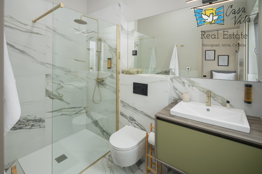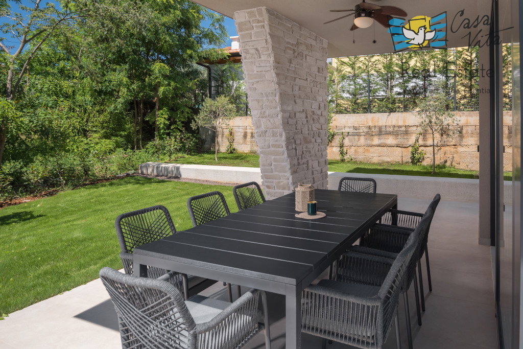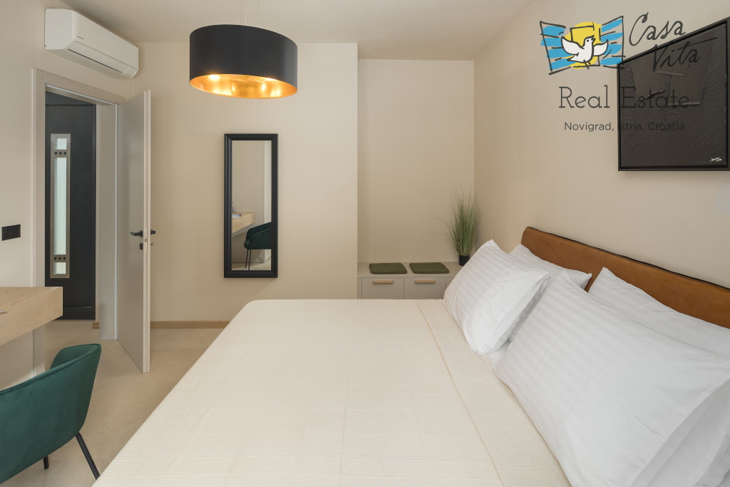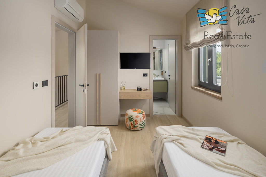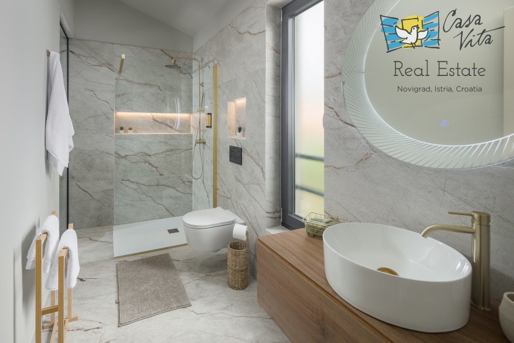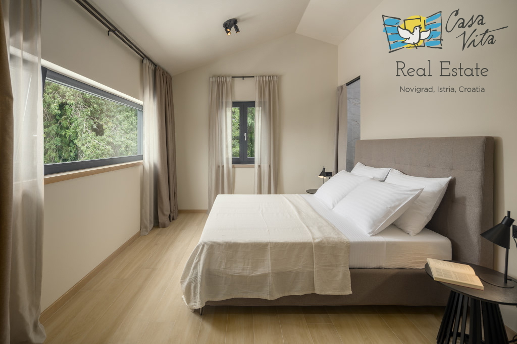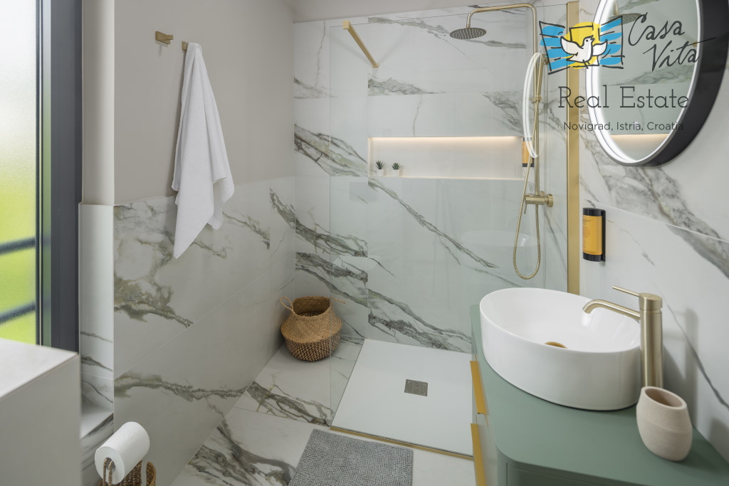Istrien, Poreč Zum Verkauf steht eine schöne und modern eingerichtete Villa in ruhiger und gefragter Lage. Das Haus hat 189m2 und ist in zwei Etagen aufgeteilt. Im Erdgeschoss des Hauses gibt es eine Eingangshalle, die zu einem geräumigen Wohnzimmer,